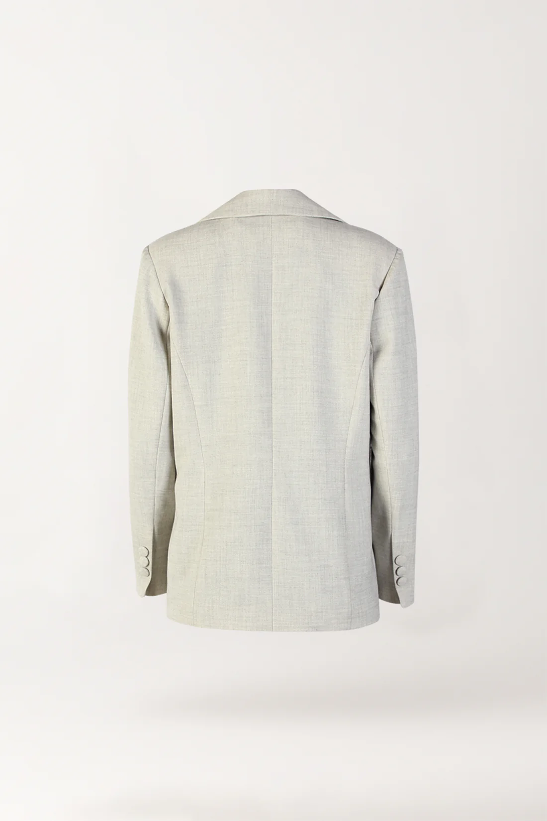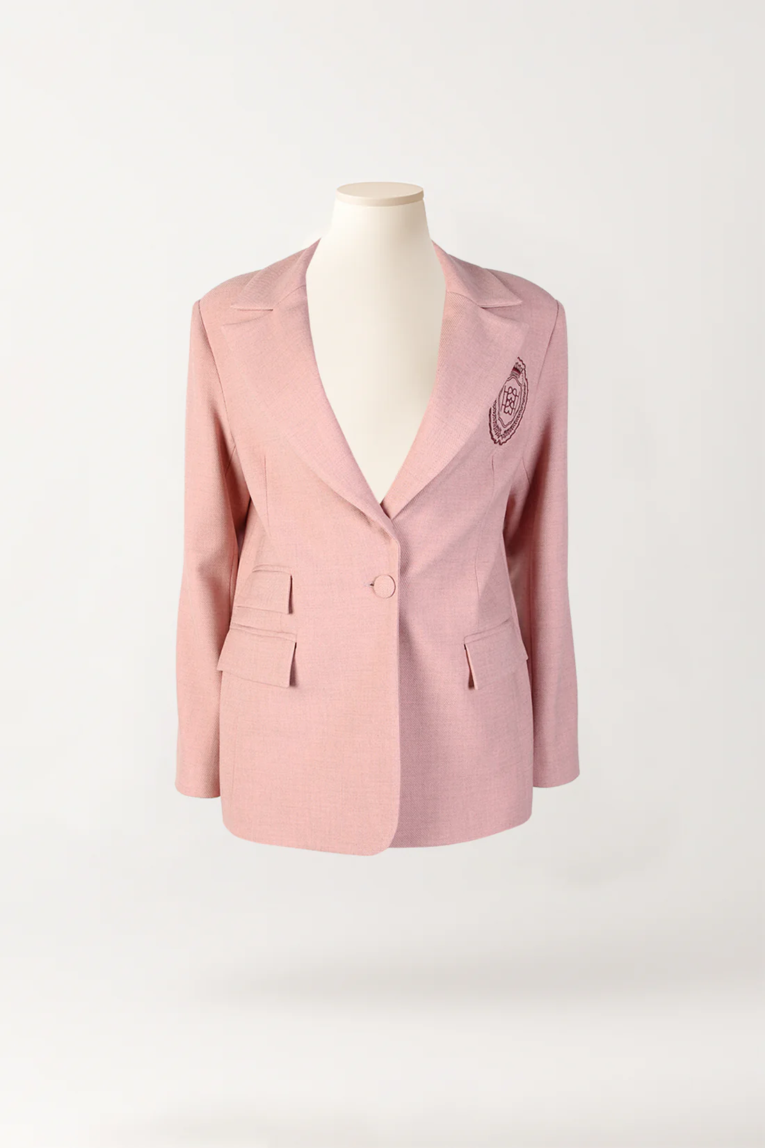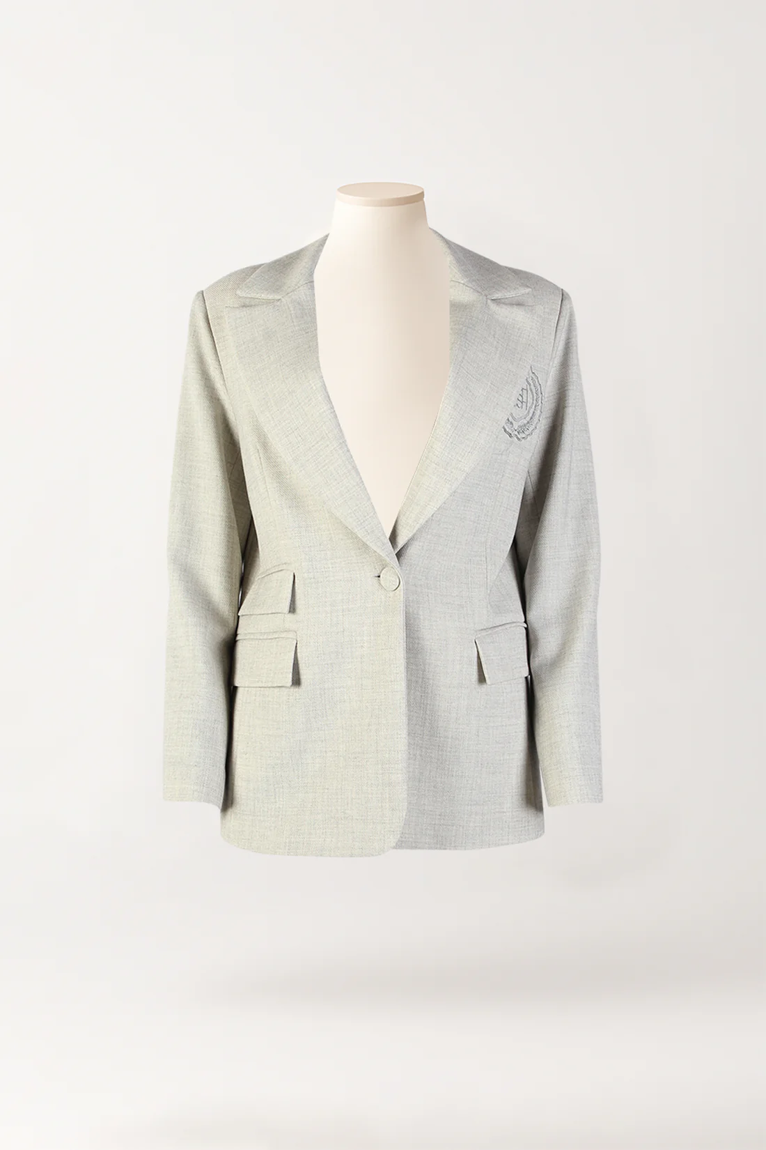 Blazer em tecido de alfaiataria leve, corte reto e lapela de ponta. Fecha com um botão forrado e tem bolsos com pala. O emblema, monograma SH, bordado à frente adiciona uma nota gráfica discreta. Um corte limpo, pensado para uso diário ou coordenado de conjunto.