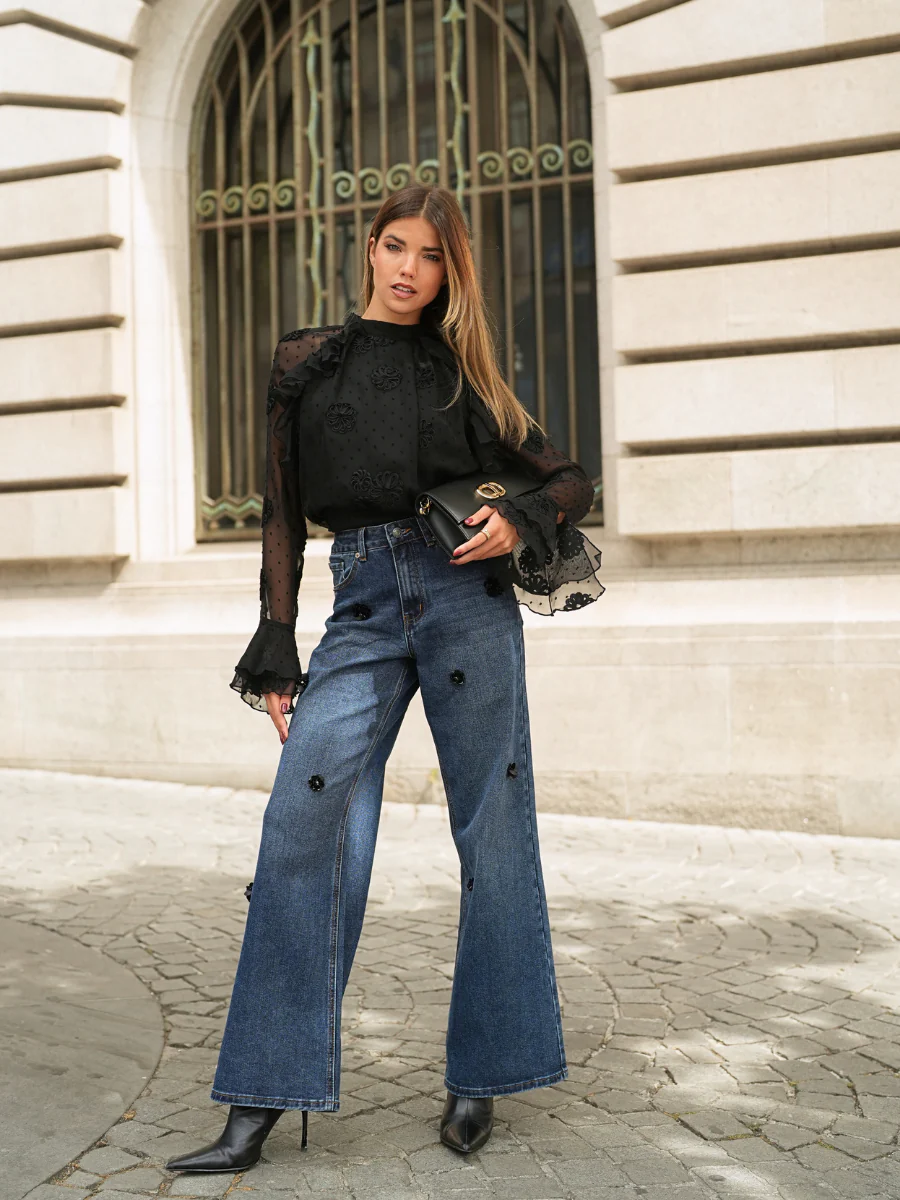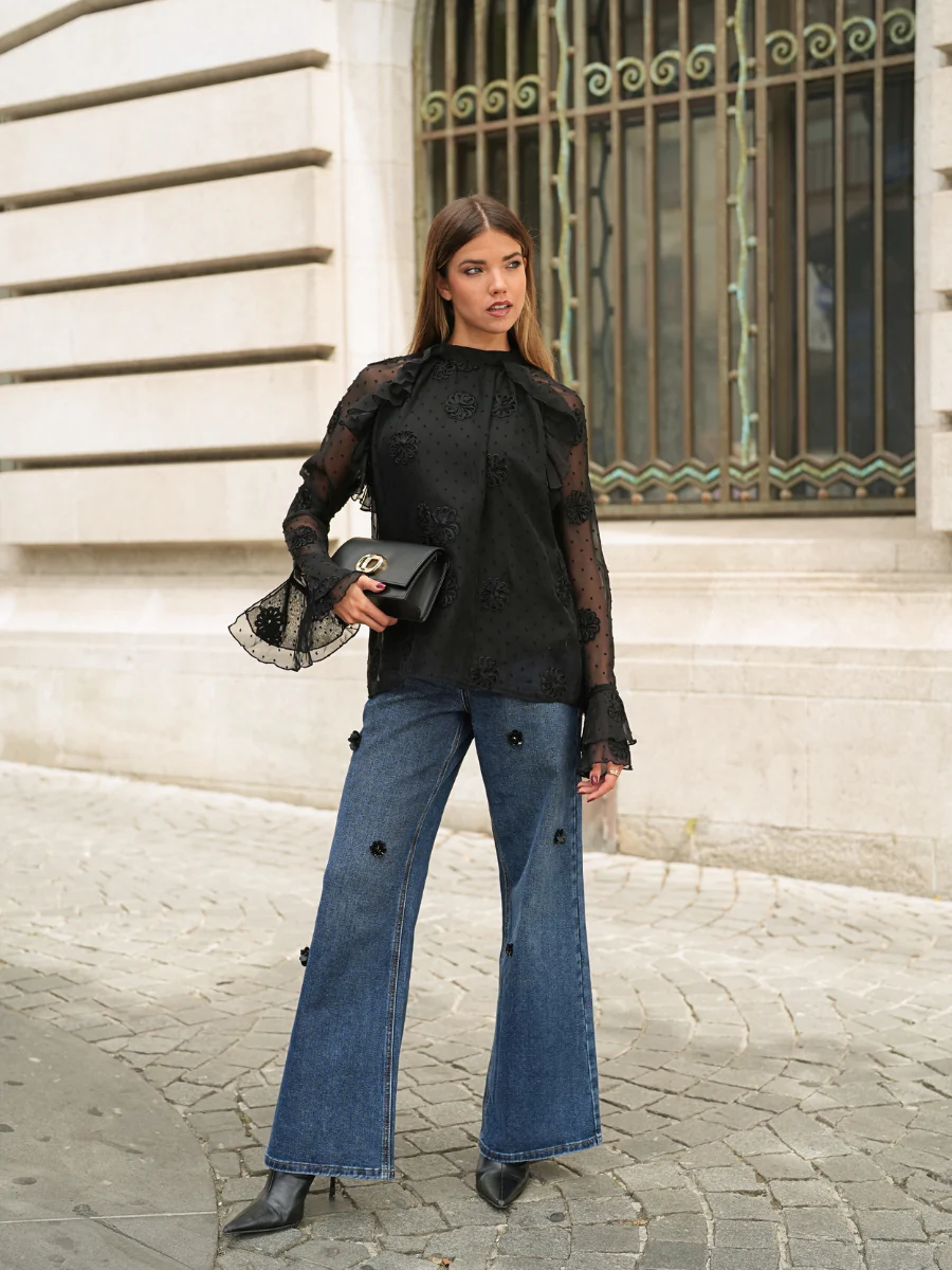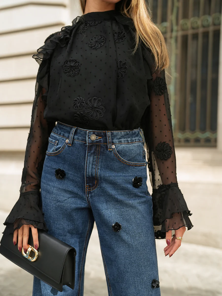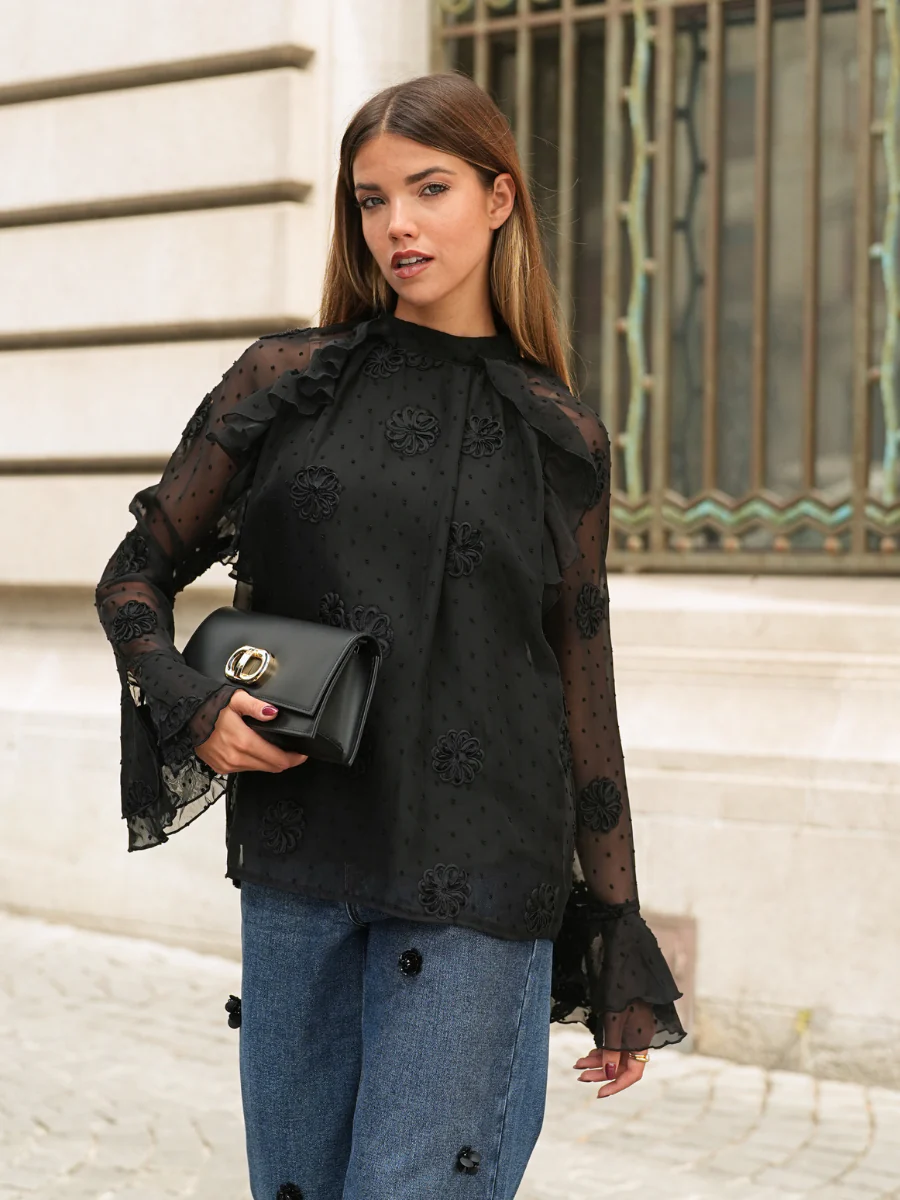 Blusa fluída em tule preto com relevo floral aplicado. Design romântico com folhos nos ombros, punhos em camadas e transparência elegante. Um essencial sofisticado para dar destaque a qualquer look.