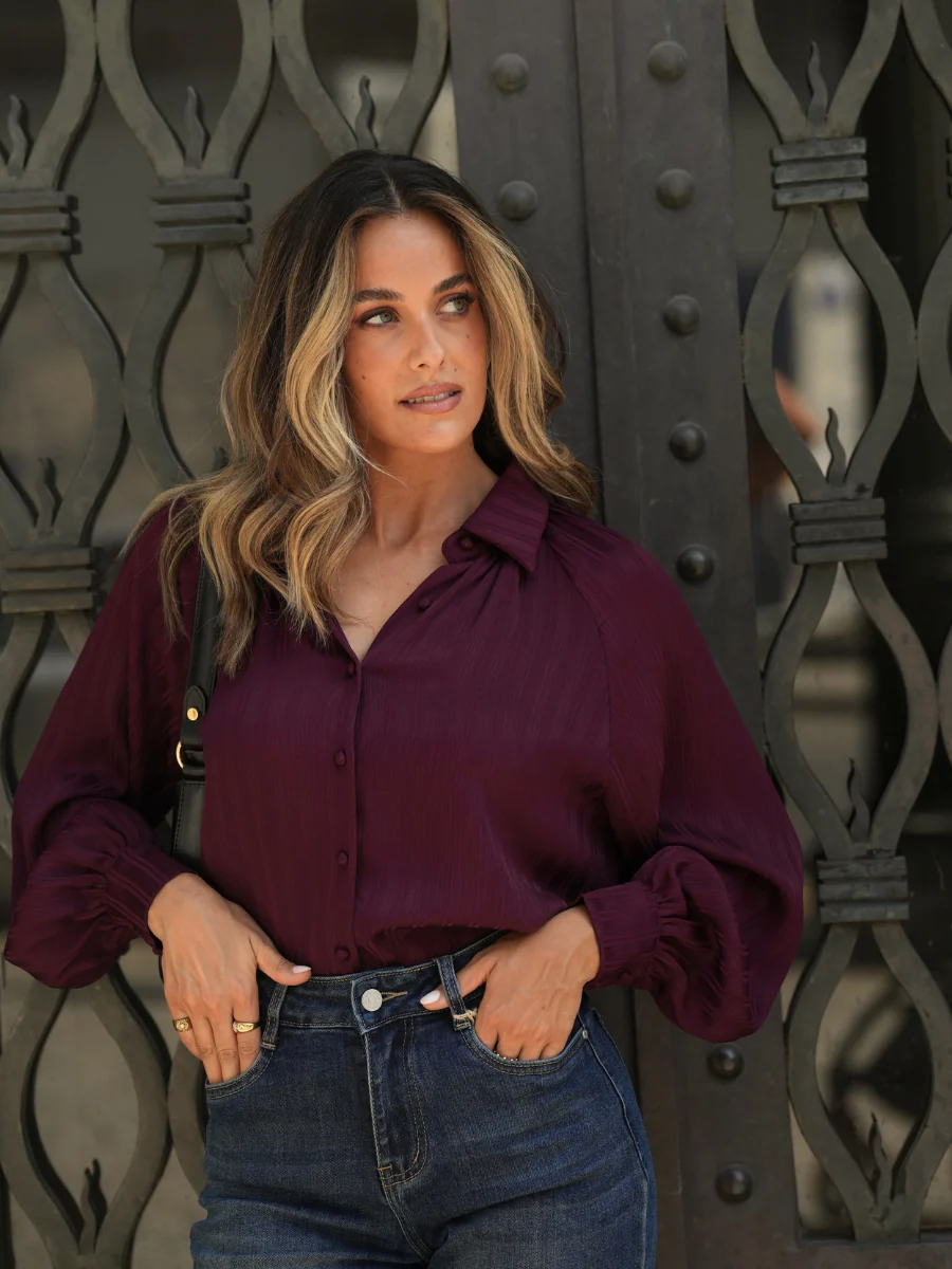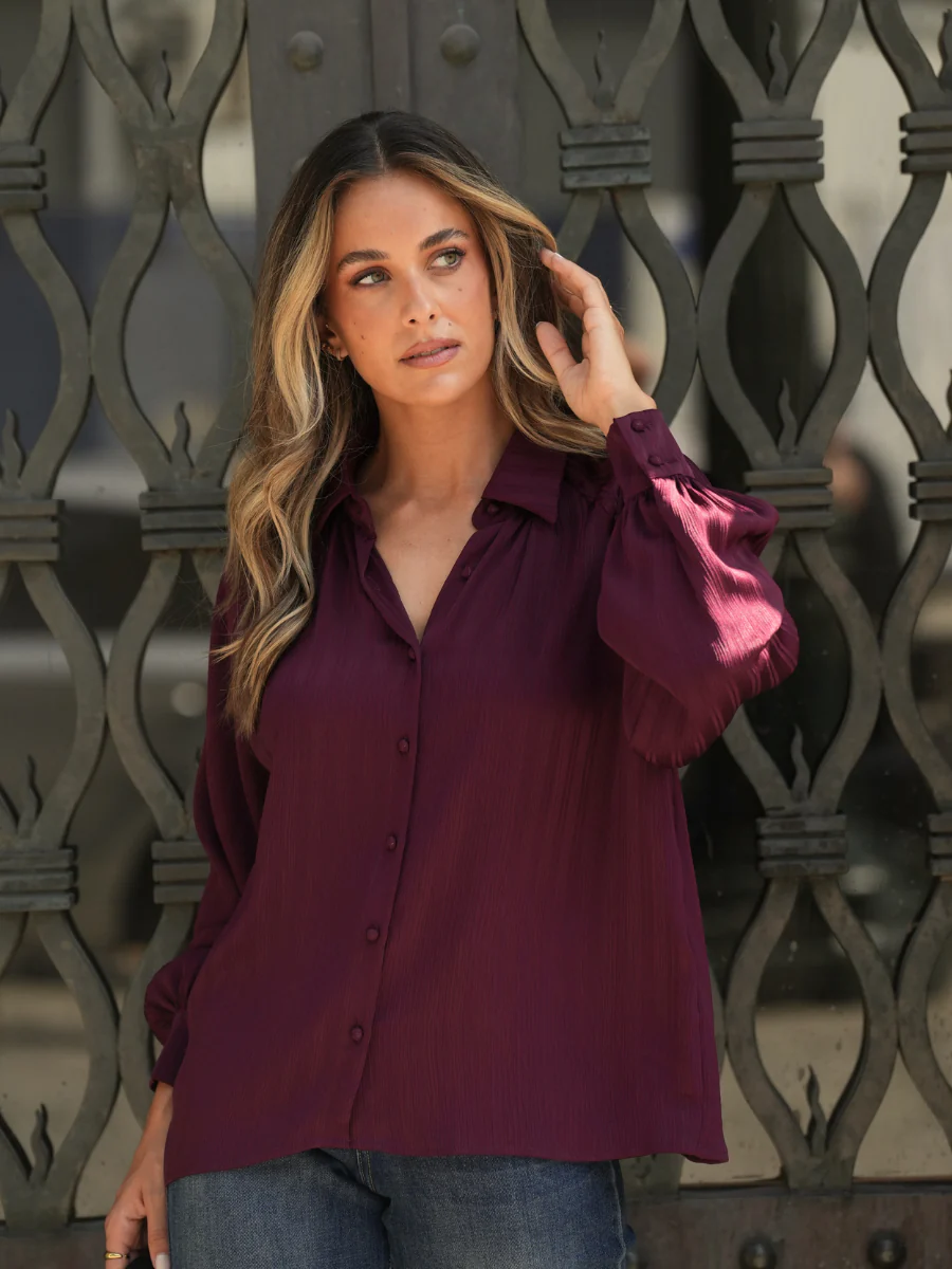 Blusa de manga comprida com tecido fluido e textura vincada. Gola clássica e fecho frontal com botões forrados. Manga abaloada e punho com botão. Bainha ligeiramente arredondada que confere leveza ao look.