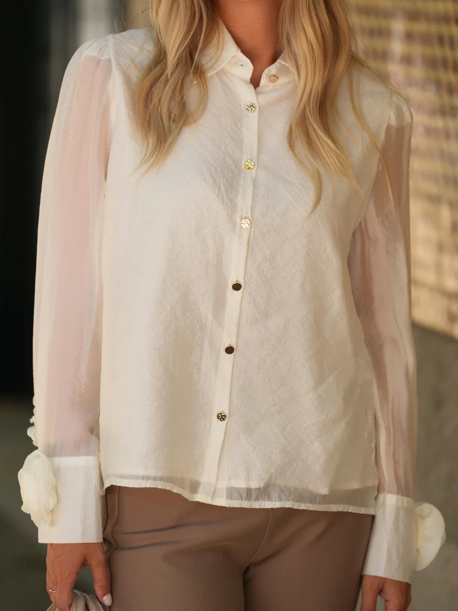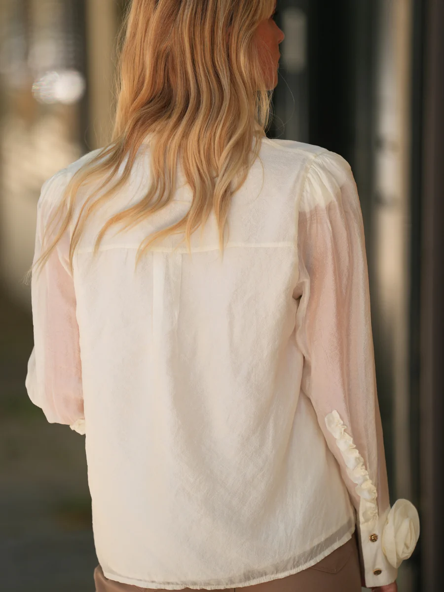 Blusa feminina em tecido translúcido com leve textura e acabamento acetinado. Modelo com gola de camisa clássica e botões dourados frontais. As mangas longas em balão destacam-se pelos punhos com aplicação de rosa em tecido e pequenos folhos que percorrem o comprimento do punho até ao cotovelo. Um detalhe delicado e feminino que transforma esta peça numa escolha sofisticada. Forro interior.