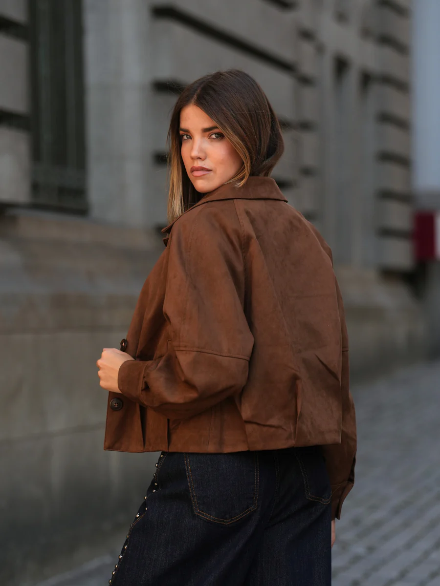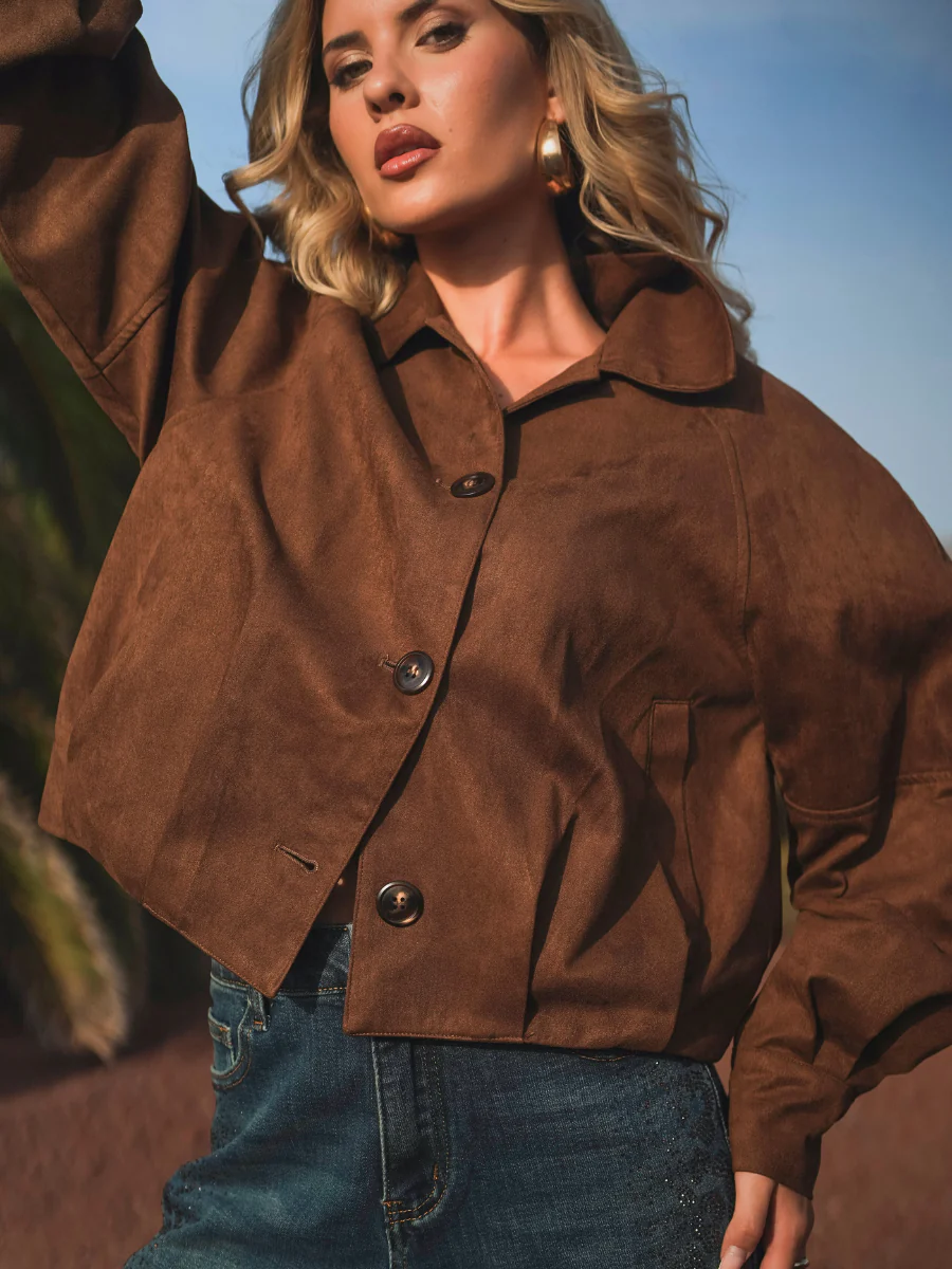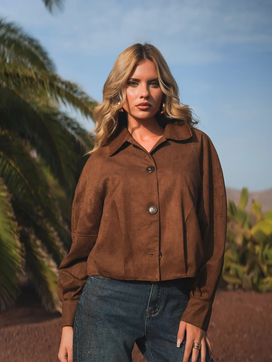 Casaco em tecido tipo camurça, com gola clássica, botões frontais e manga larga. Um essencial sofisticado para looks elegantes e modernos. Silhueta ampla e descontraída, sem ajuste ao corpo.