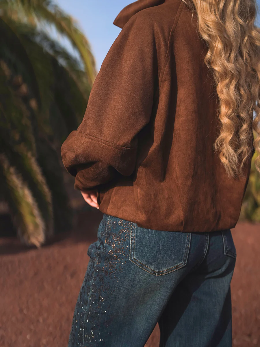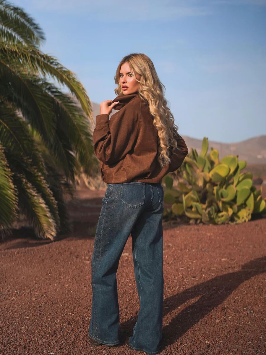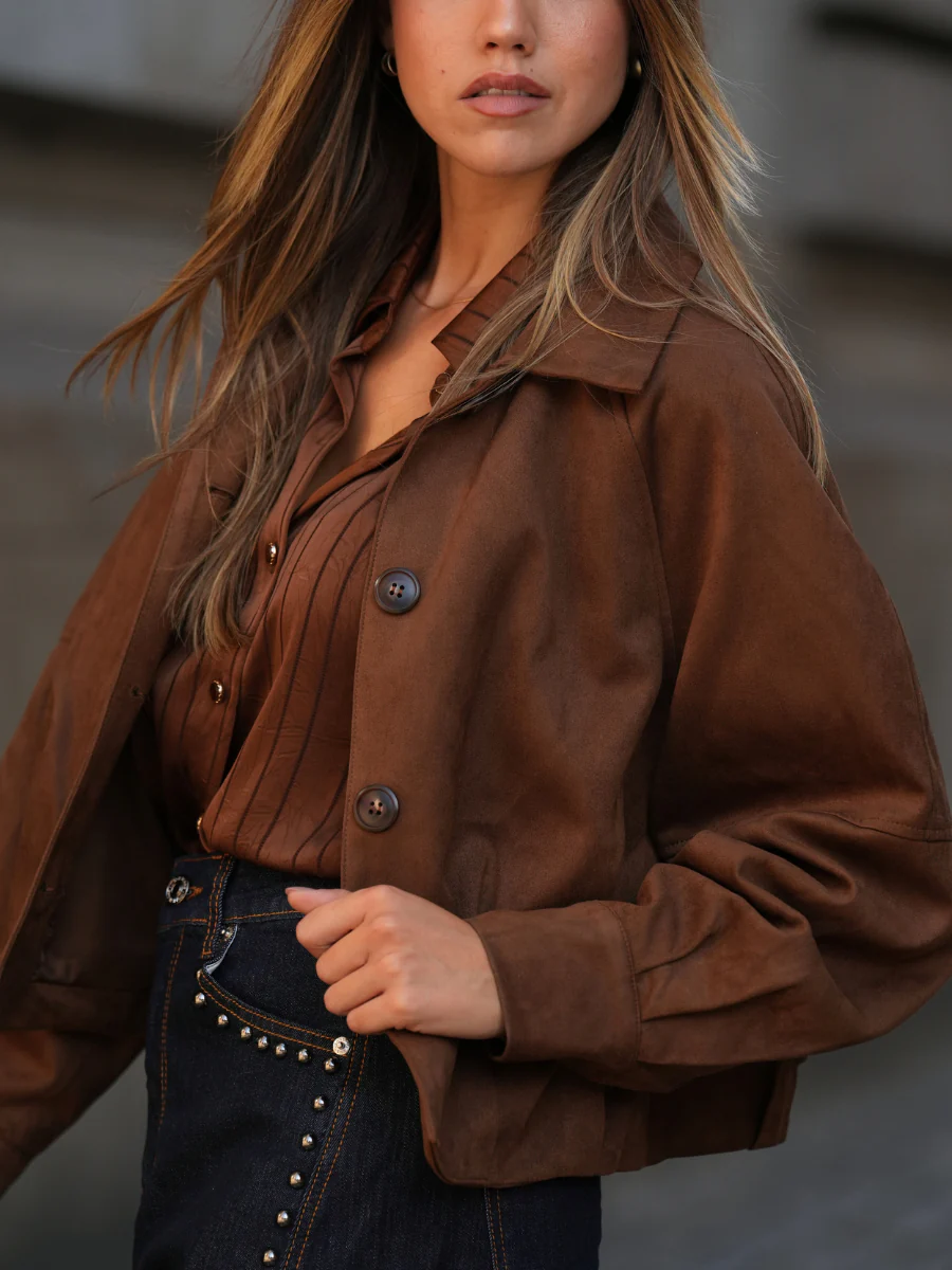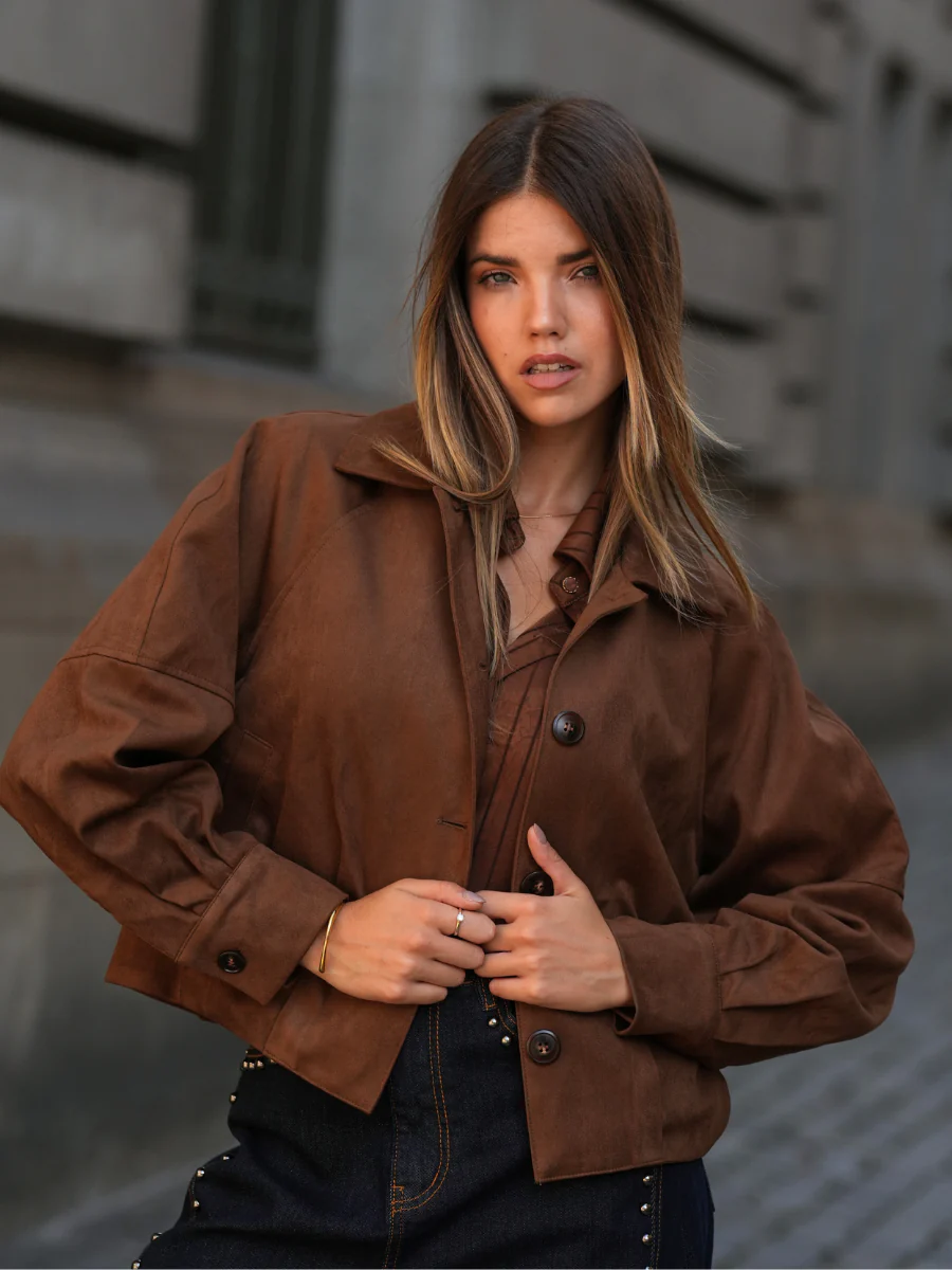 Casaco em tecido tipo camurça, com gola clássica, botões frontais e manga larga. Um essencial sofisticado para looks elegantes e modernos. Silhueta ampla e descontraída, sem ajuste ao corpo.
