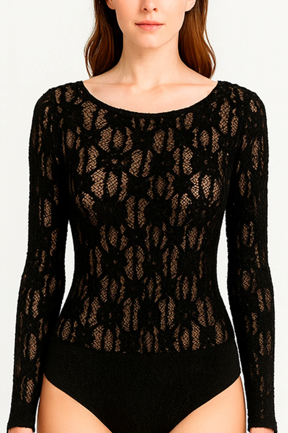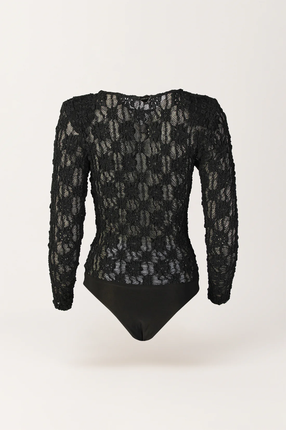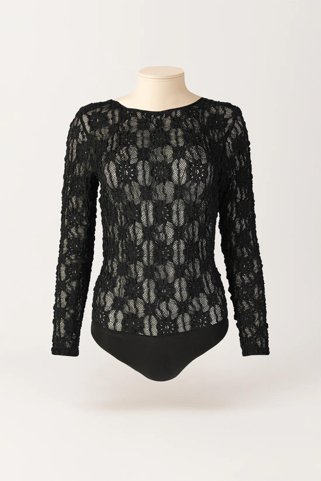 Body em renda texturada com padrão floral e transparência controlada. Mangas compridas e gola redonda, com base em jersey elástico para conforto e ajuste seguro. Fecho inferior discreto.