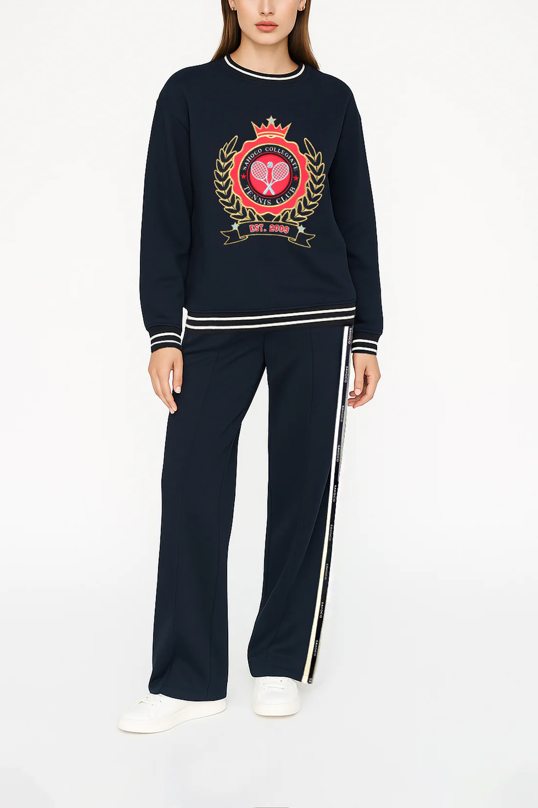 Calças femininas Sahoco em camel, com detalhe desportivo de risca lateral em branco e azul-claro. A fusão entre conforto e sofisticação torna esta peça versátil para looks casuais-chic. Use com sneakers para um estilo urbano ou combine com saltos para um contraste inesperado e moderno.