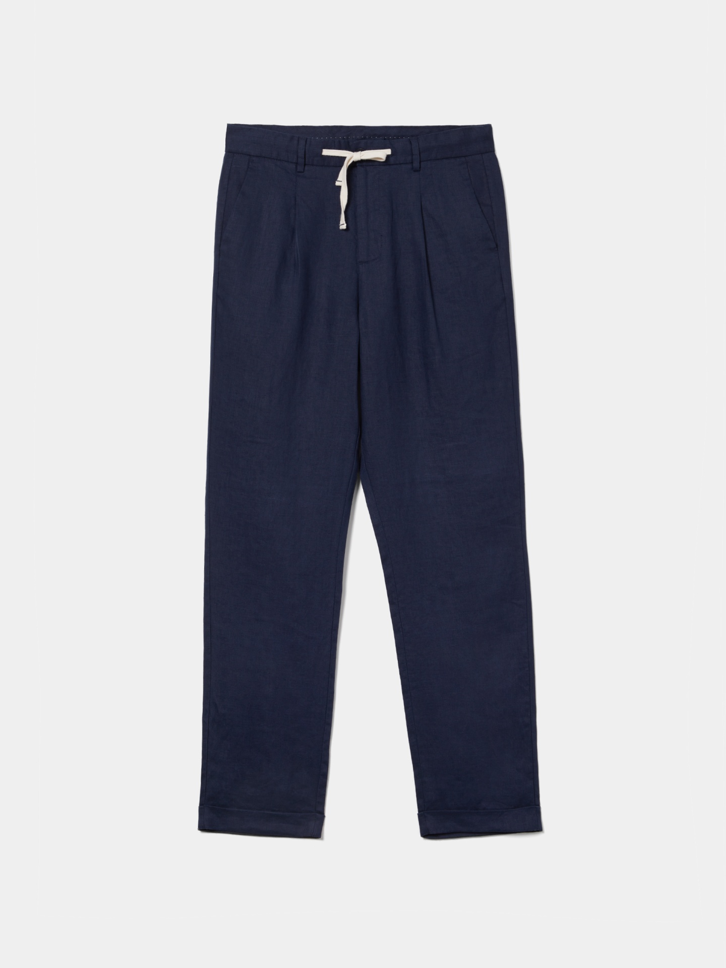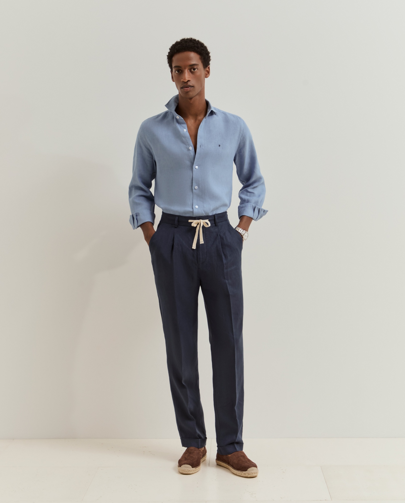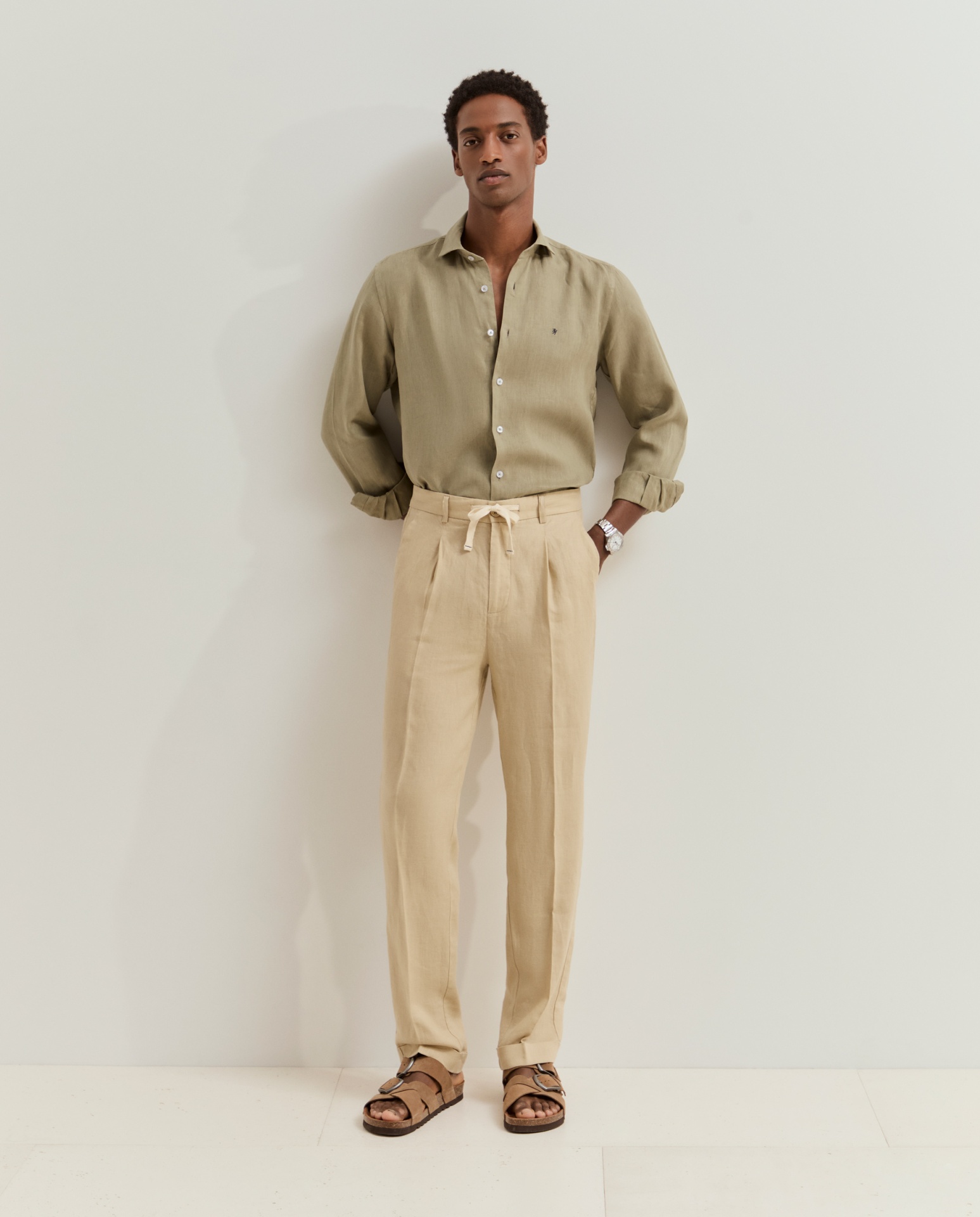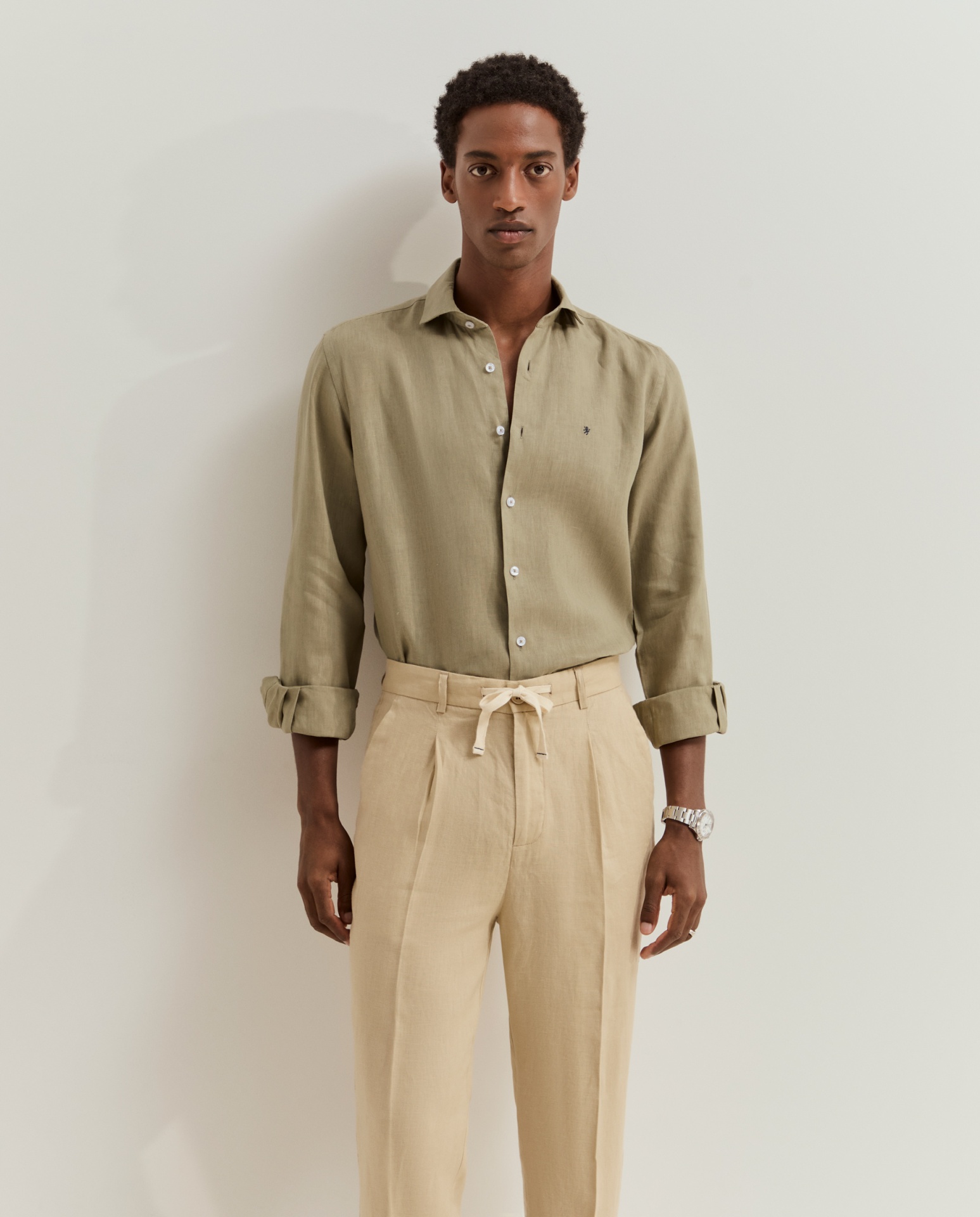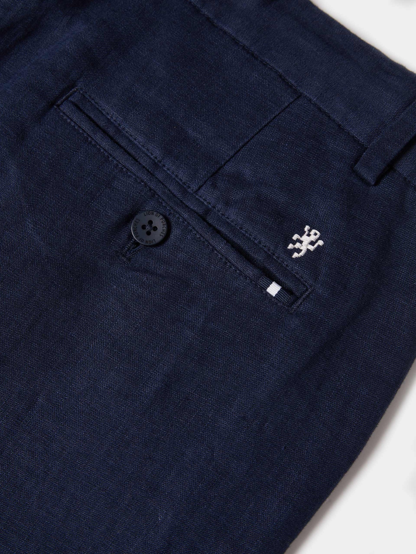 Calças chino de corte regular fit. Apertam com fecho, cordão ajustável e botão personalizado, oferecendo um equilíbrio entre conforto e estilo. Possuem bolsos laterais e posteriores, além de detalhes distintivos como o bordado personalizado junto ao bolso traseiro direito. Confeccionadas em 100% linho, garantem leveza, respirabilidade e um toque naturalmente sofisticado.