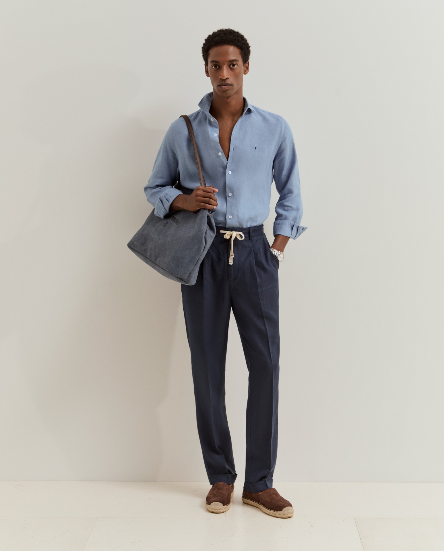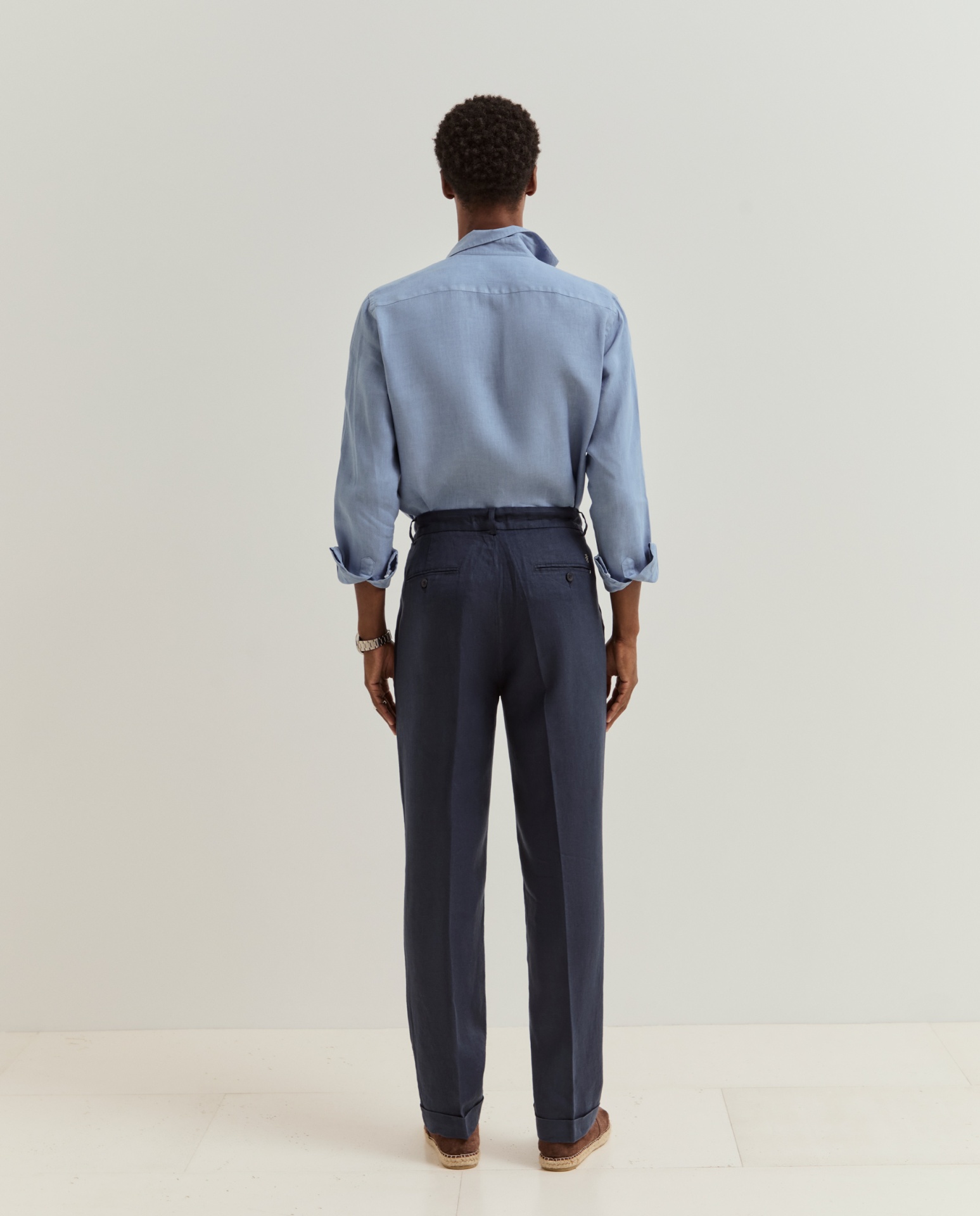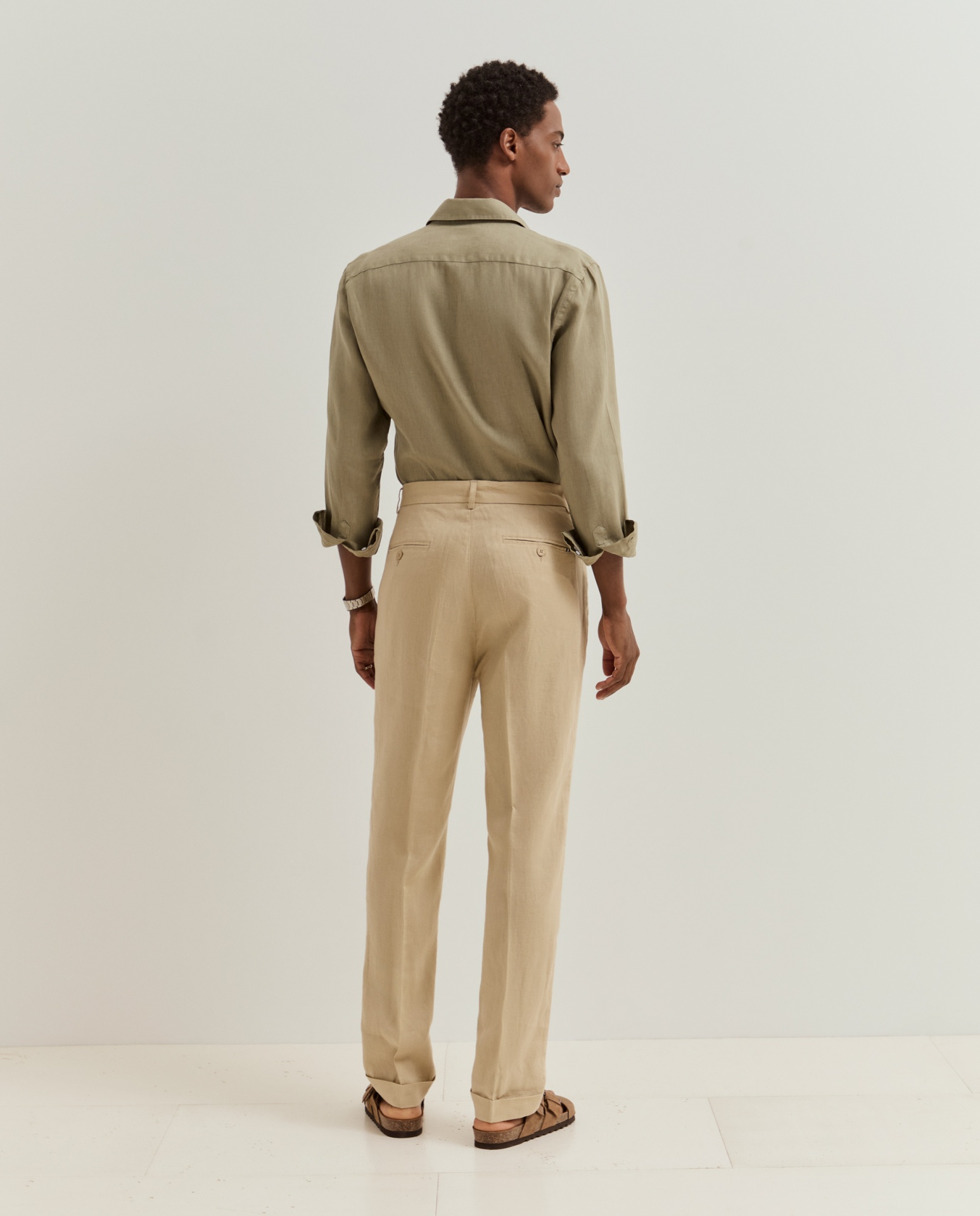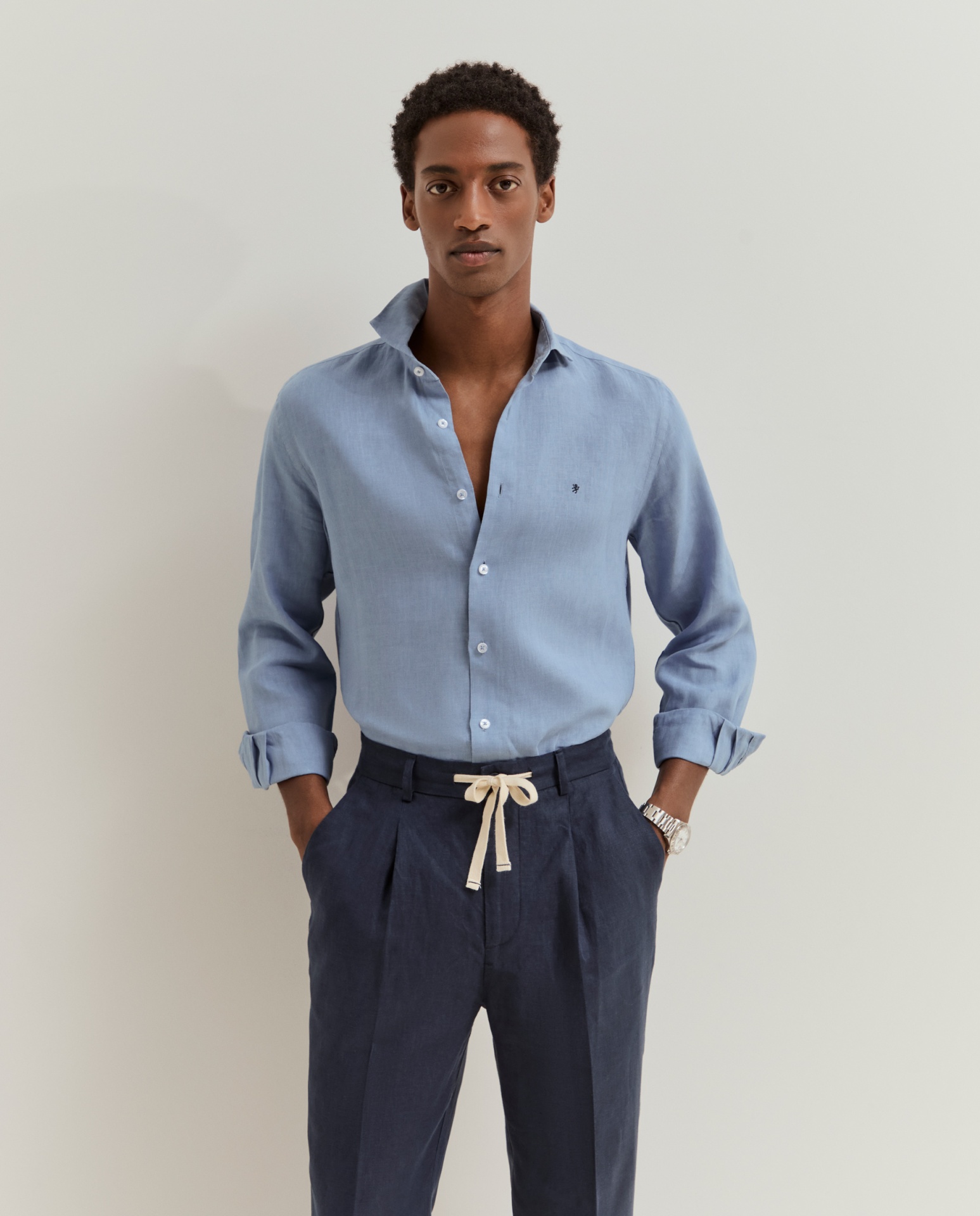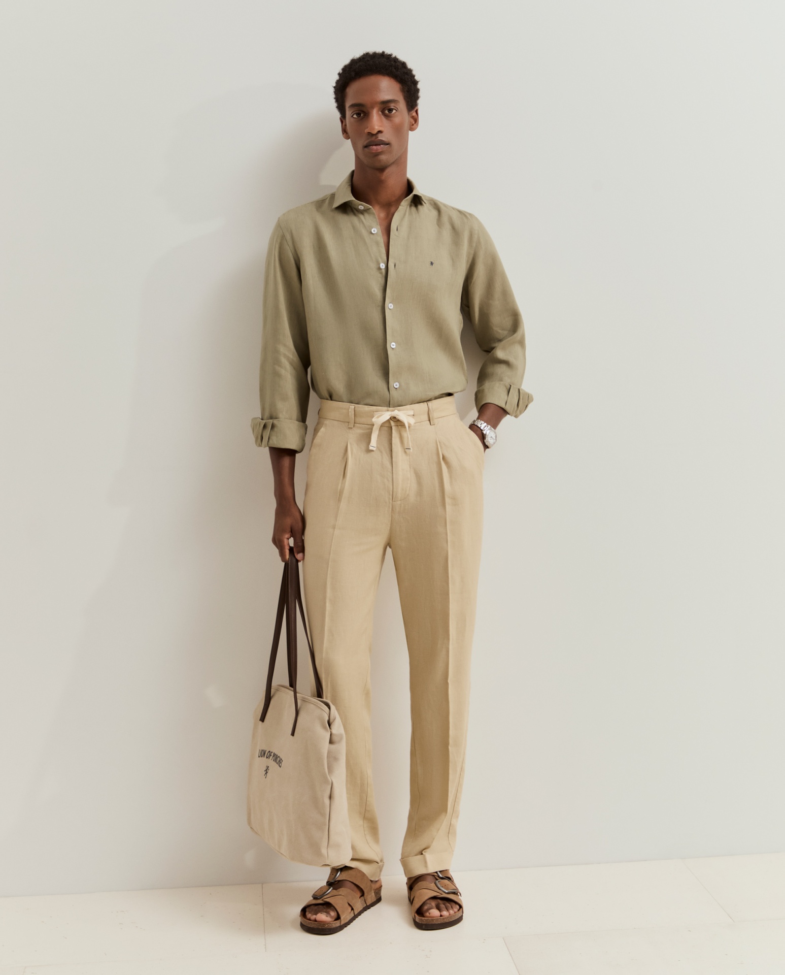 Calças chino de corte regular fit. Apertam com fecho, cordão ajustável e botão personalizado, oferecendo um equilíbrio entre conforto e estilo. Possuem bolsos laterais e posteriores, além de detalhes distintivos como o bordado personalizado junto ao bolso traseiro direito. Confeccionadas em 100% linho, garantem leveza, respirabilidade e um toque naturalmente sofisticado.
