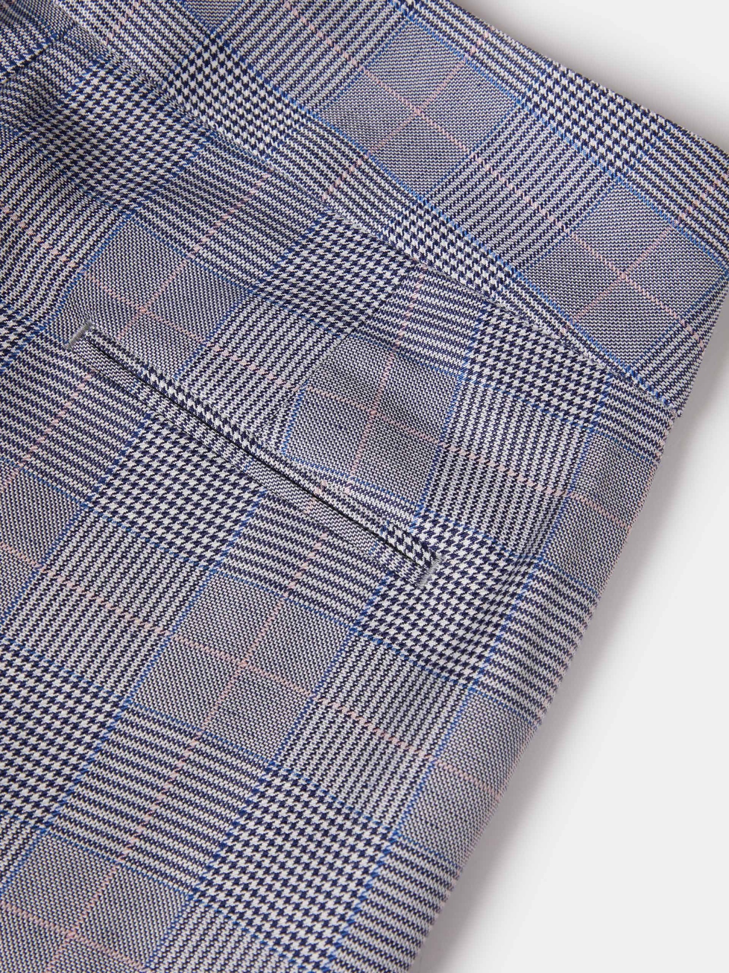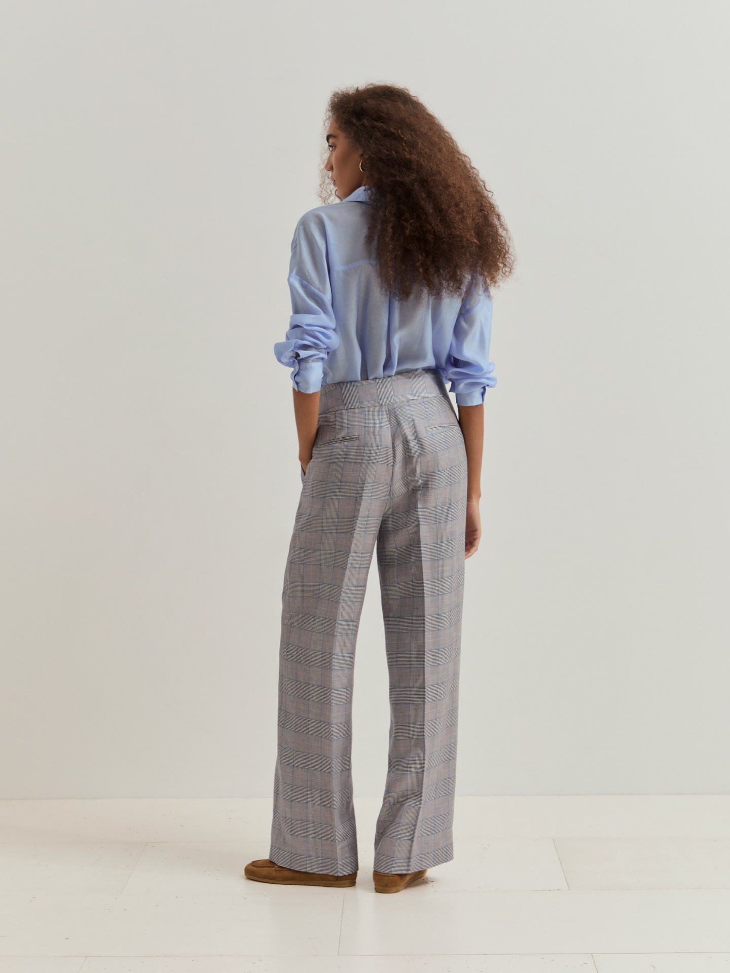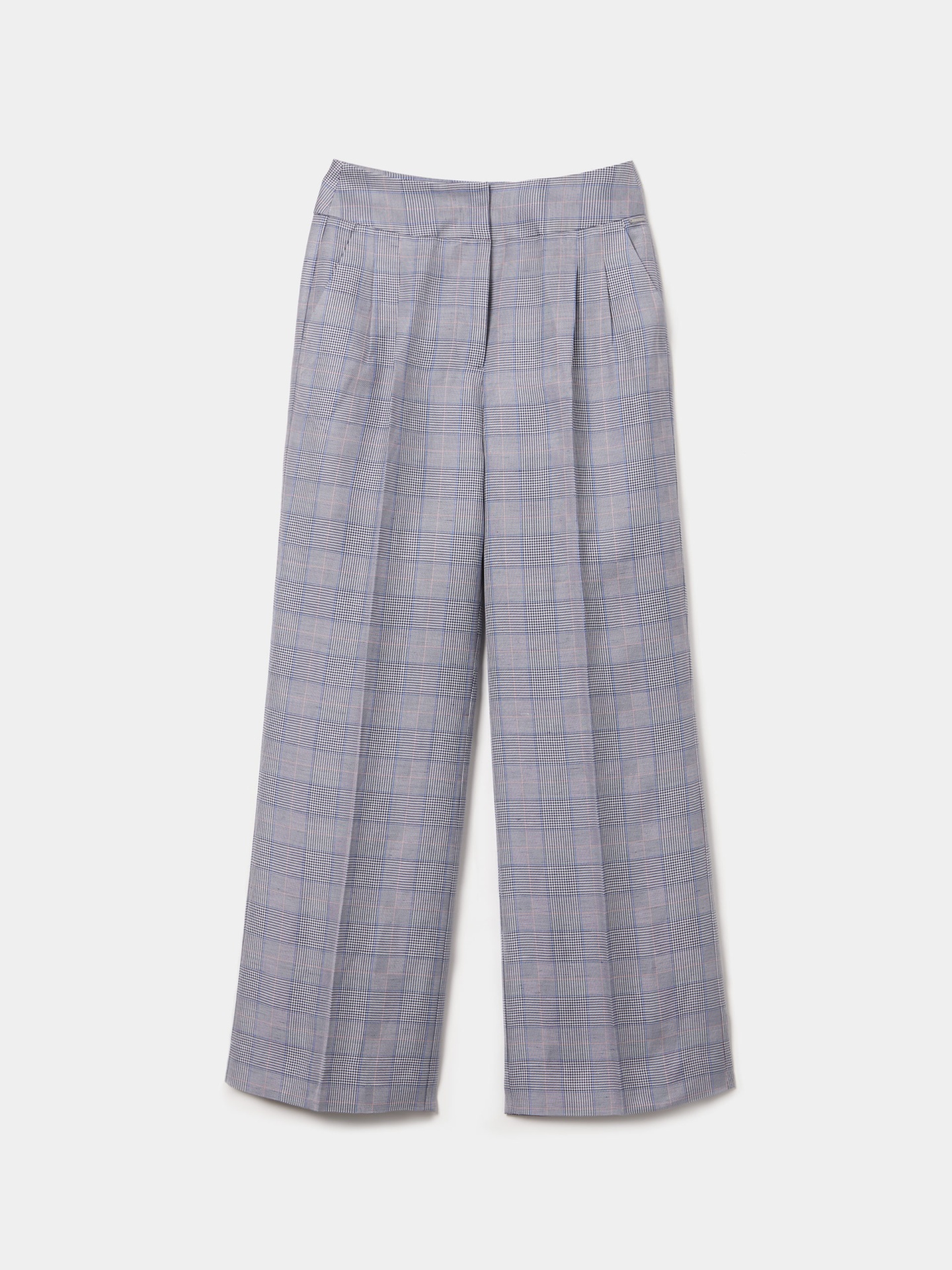 Calças chino com padrão xadrez, confeccionadas com pregas frontais e vincos para um caimento estruturado e sofisticado. Incluem dois bolsos laterais e dois bolsos traseiros de vivos, combinando funcionalidade e estilo clássico.