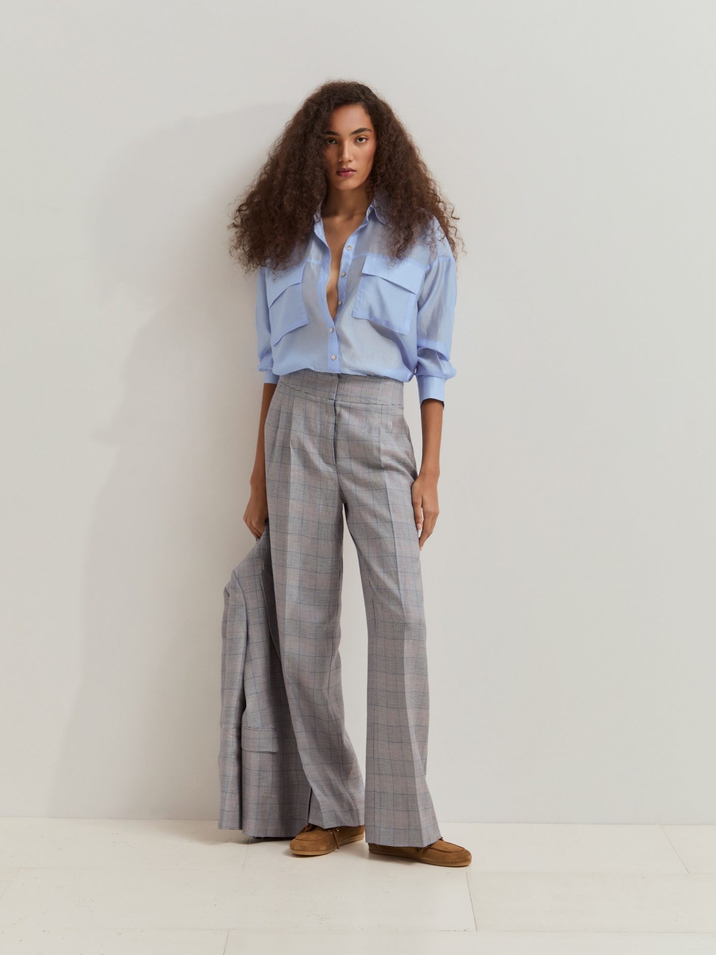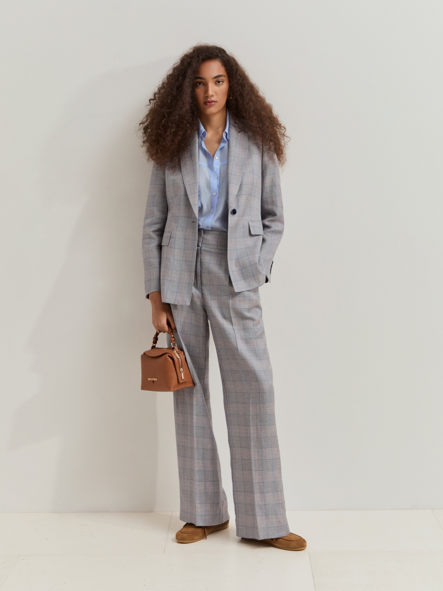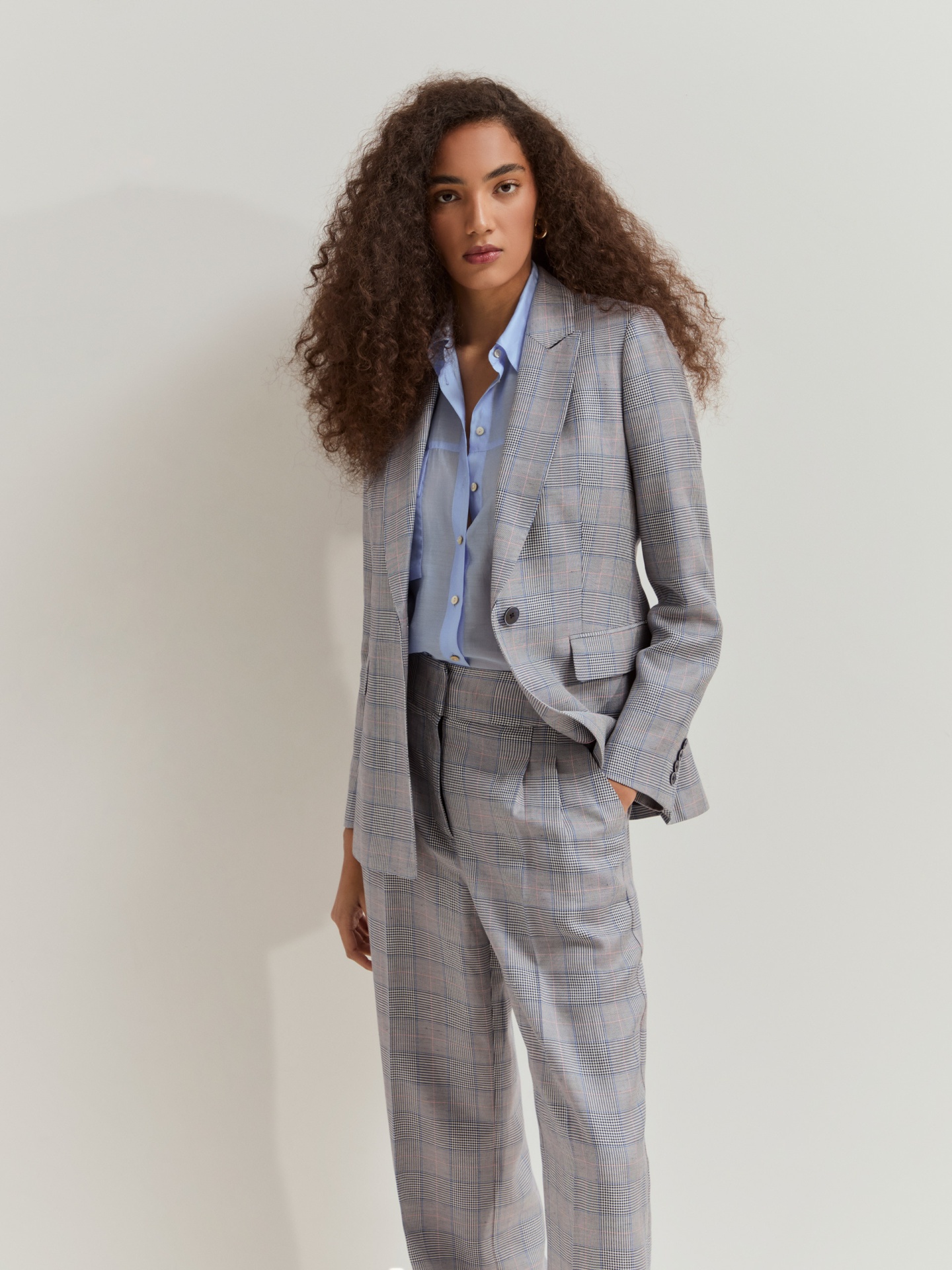 Calças chino com padrão xadrez, confeccionadas com pregas frontais e vincos para um caimento estruturado e sofisticado. Incluem dois bolsos laterais e dois bolsos traseiros de vivos, combinando funcionalidade e estilo clássico.