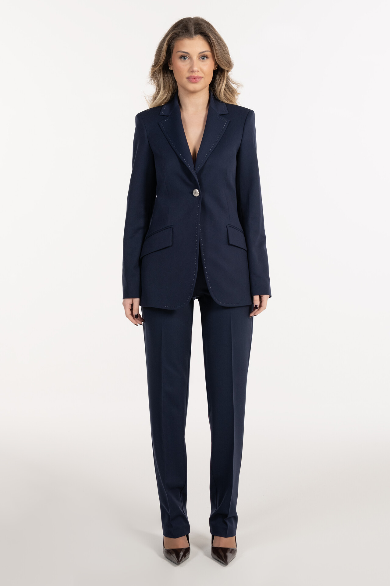 Calças com fecho de correr oculto e botão, dois bolsos laterais e detalhe de pala na frente. Podem ser conjugadas com o blazer da mesma coleção, criando um conjunto elegante e coordenado.