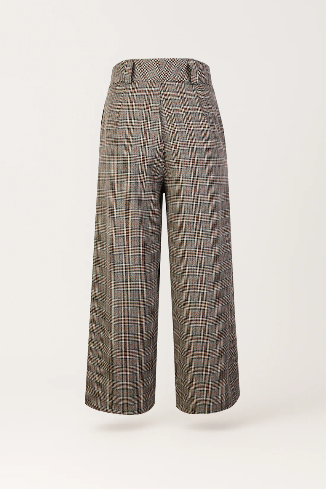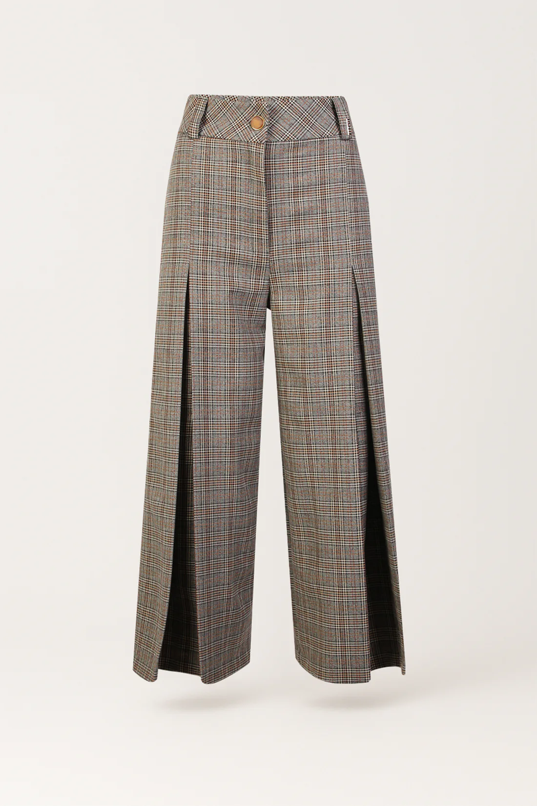 Calças de alfaiataria em padrão príncipe de Gales, com corte culotte e cintura média. Apresentam pregas vincadas na frente que conferem fluidez e movimento à silhueta. O cós estruturado com fecho zip oculto e botão na frente.