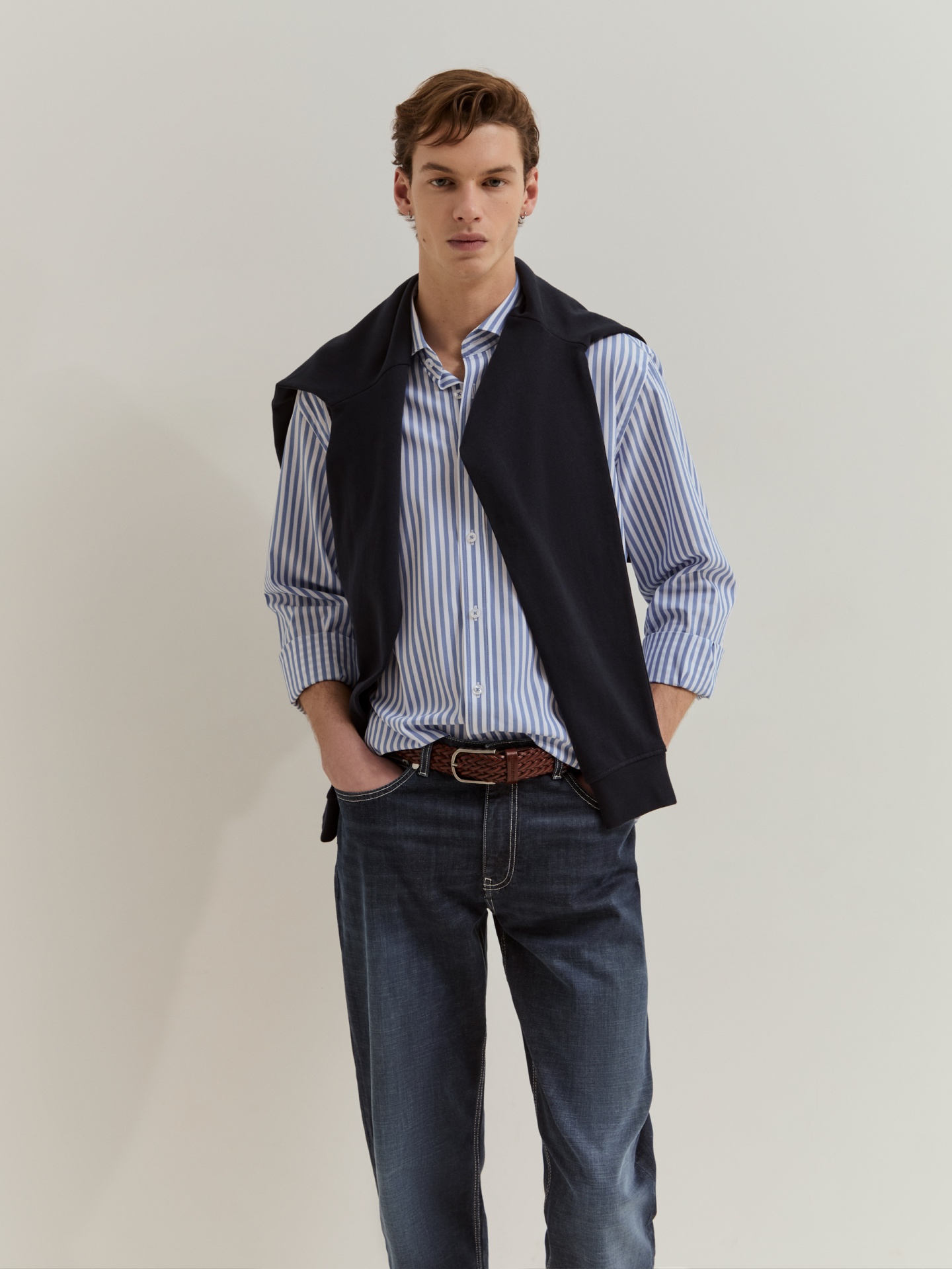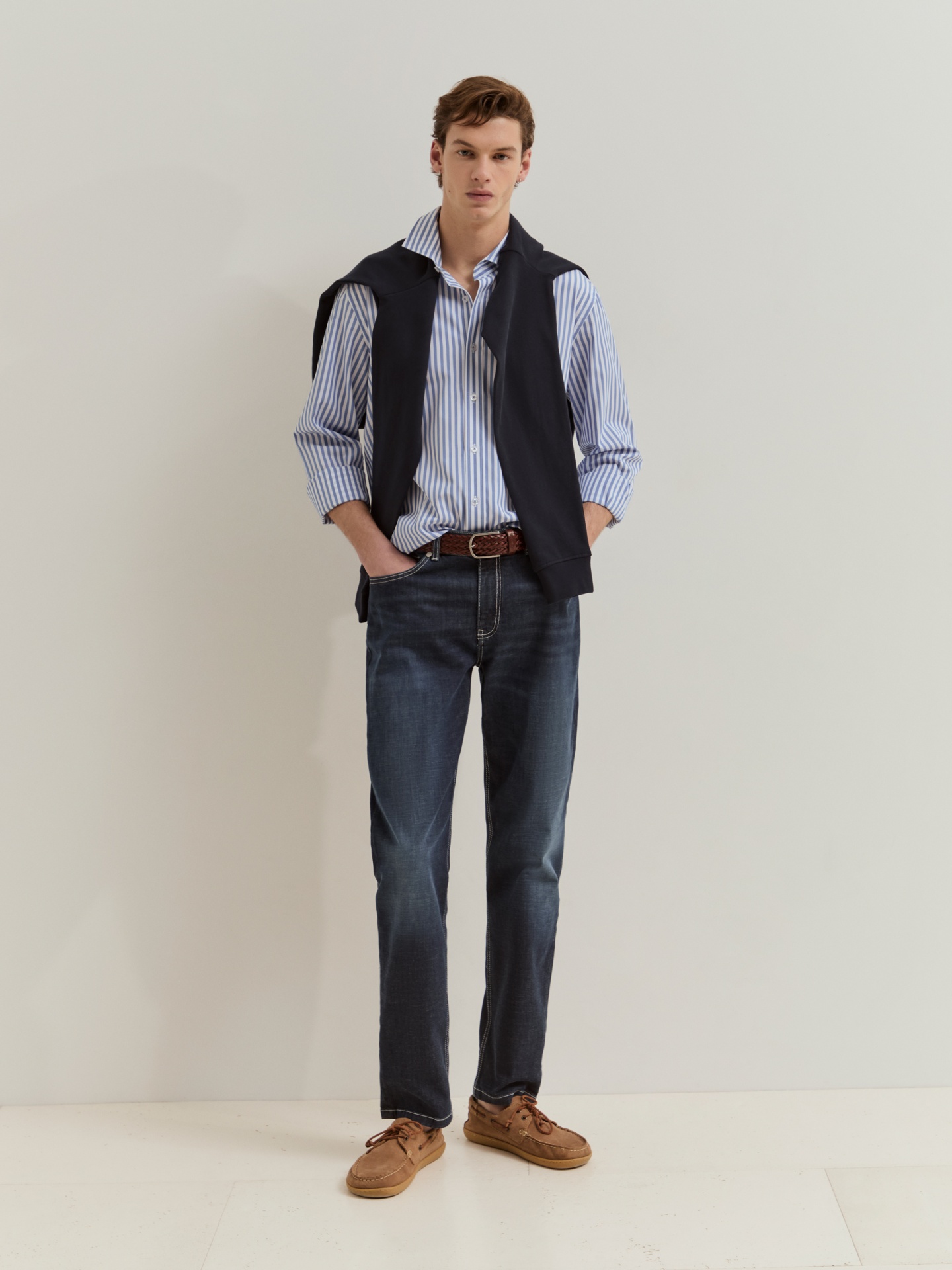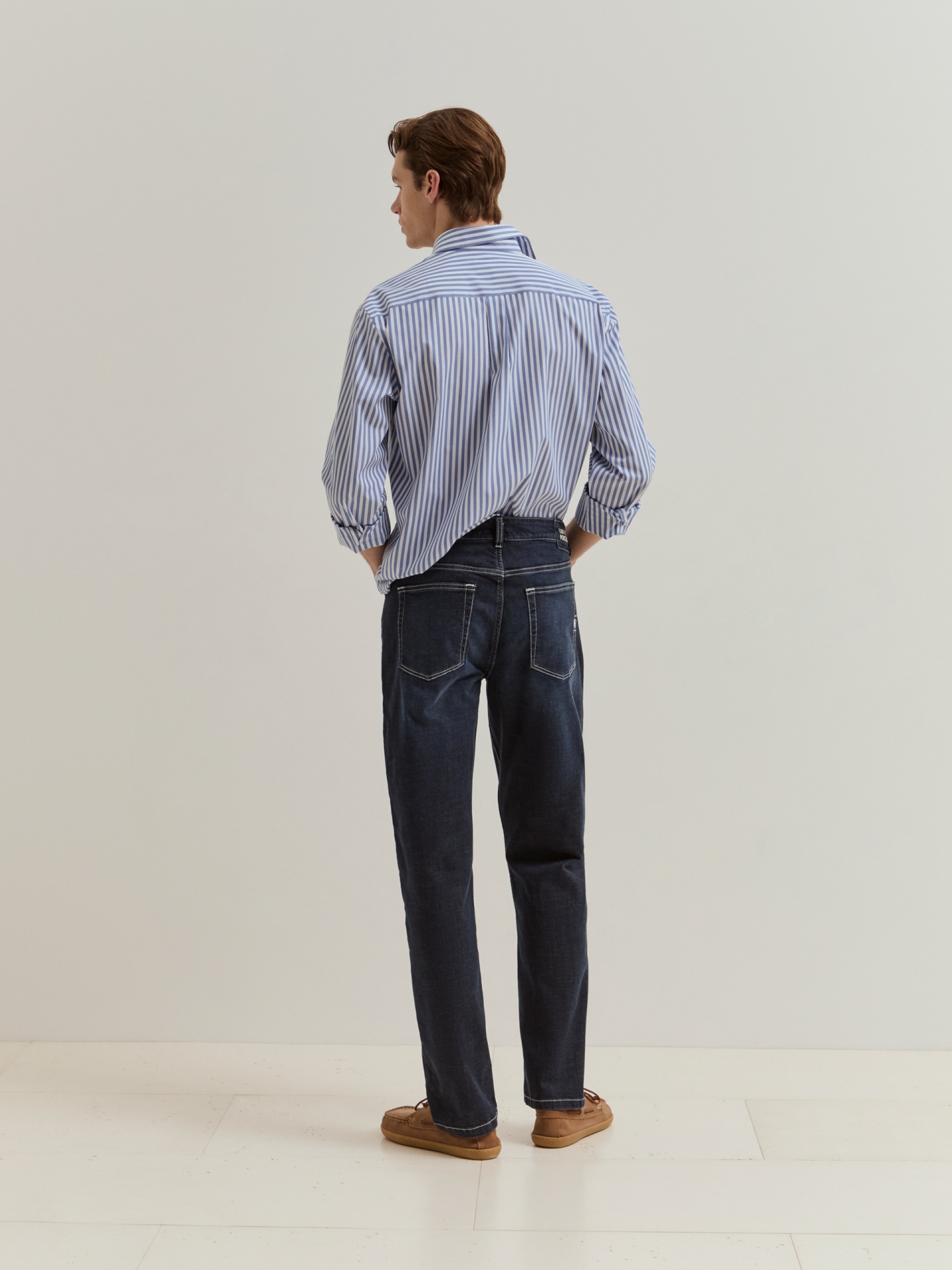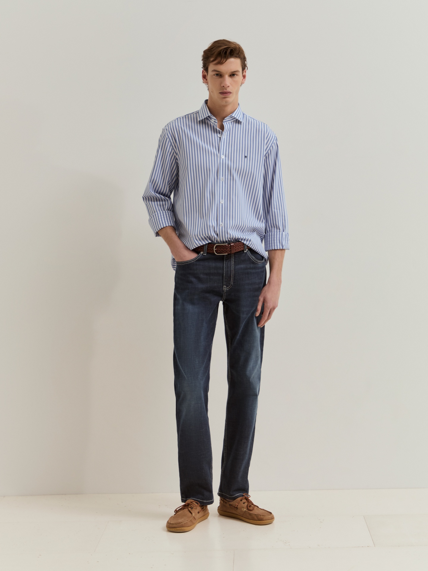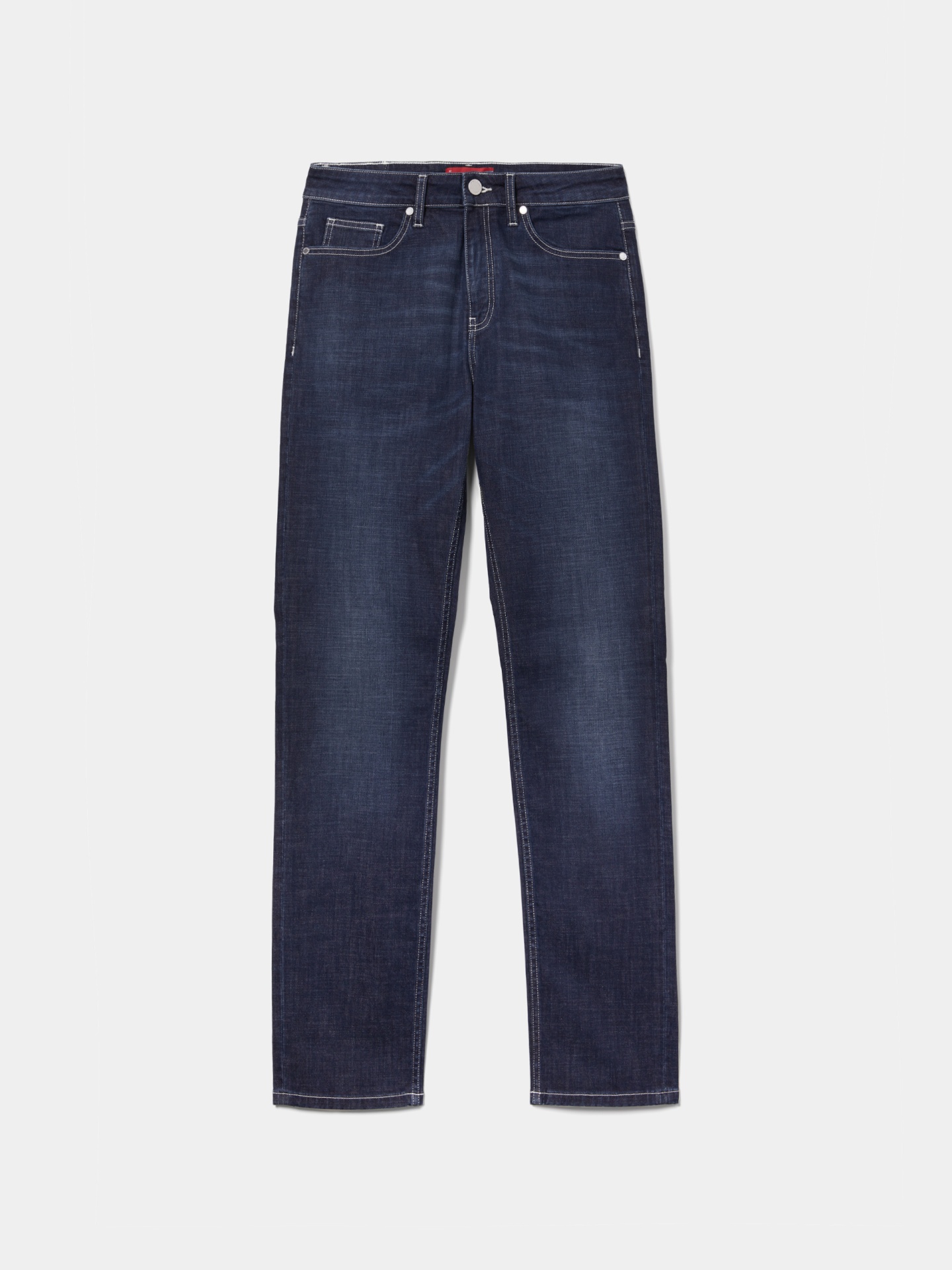Calças de ganga azul-escuras em regular fit, versáteis e confortáveis. Confecionadas em algodão com um toque de elastano para uma maior elasticidade e liberdade de movimentos. Apertam com fecho de correr e botão. Com design clássico de cinco bolsos e etiqueta com o nome da marca na parte de trás, combinam funcionalidade e estilo numa só peça.
