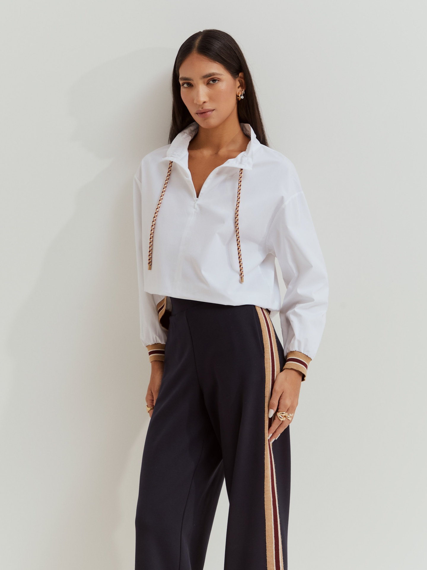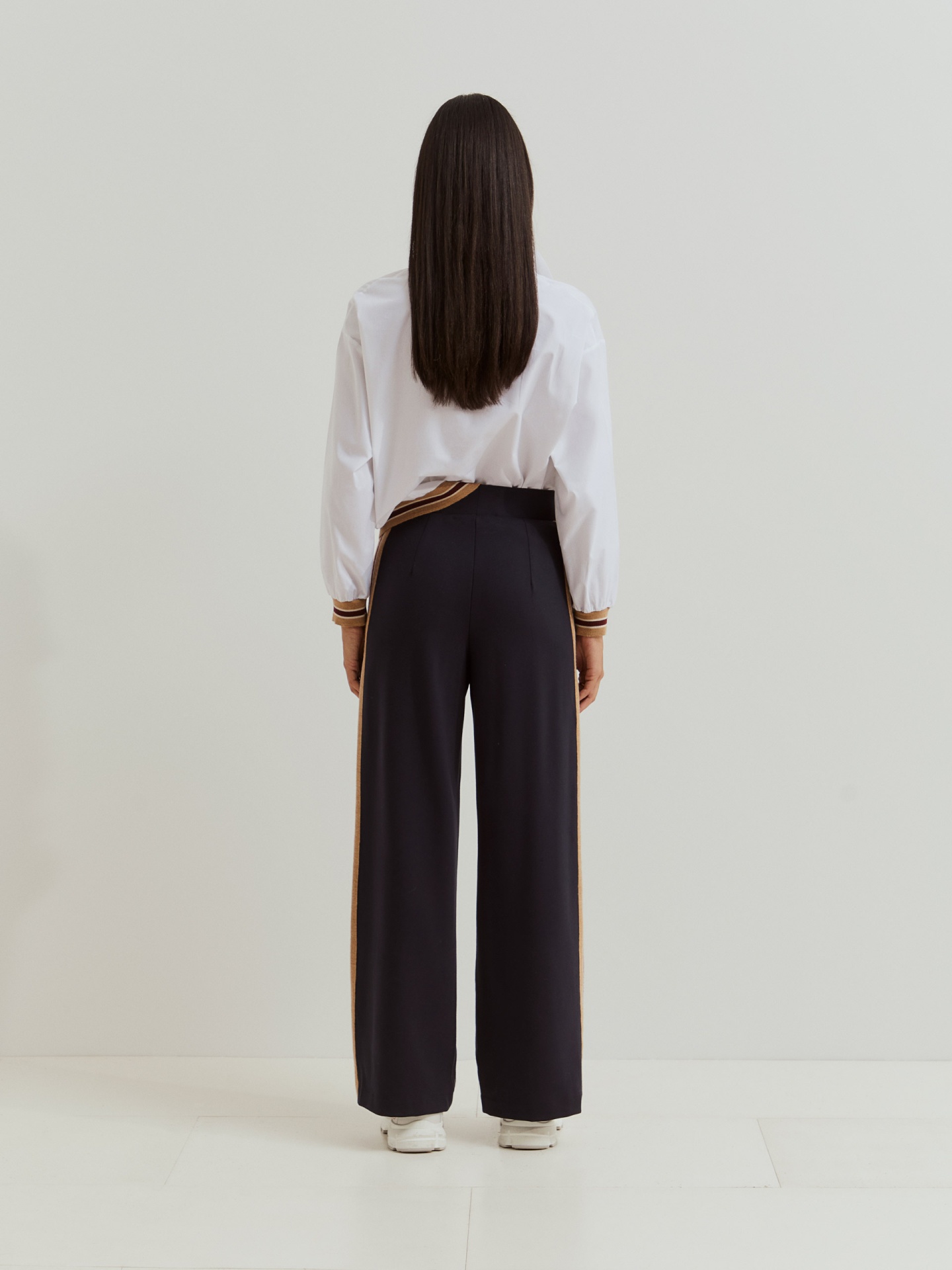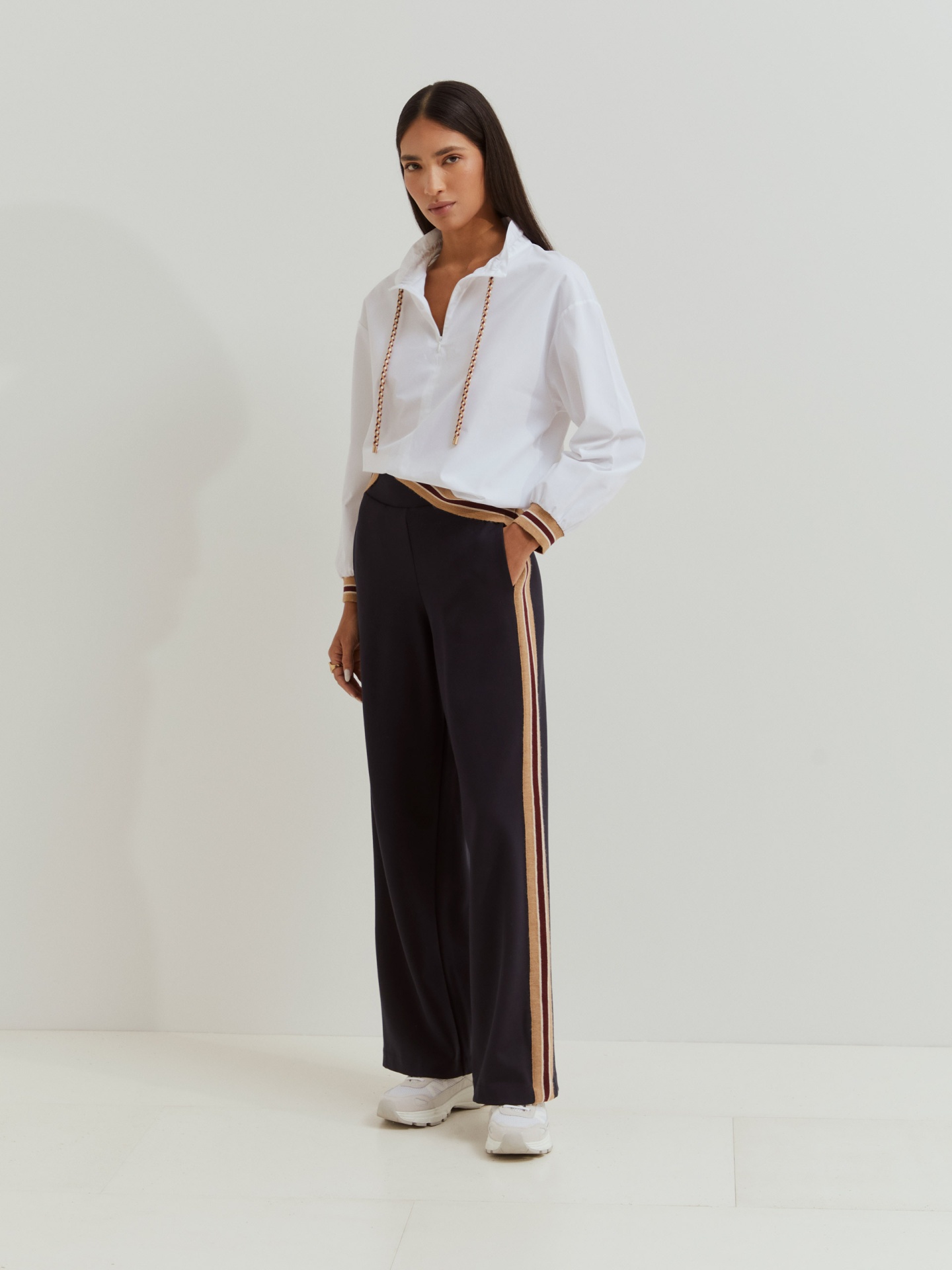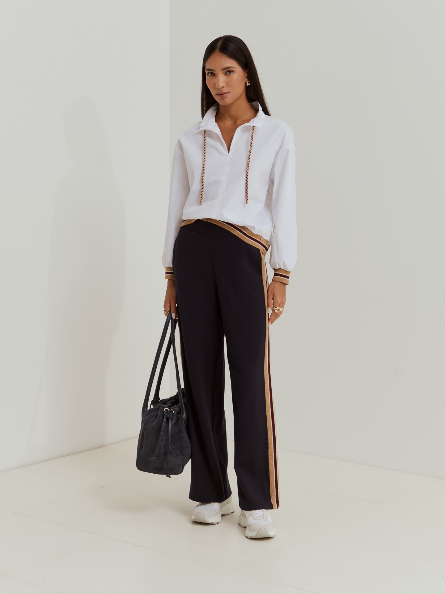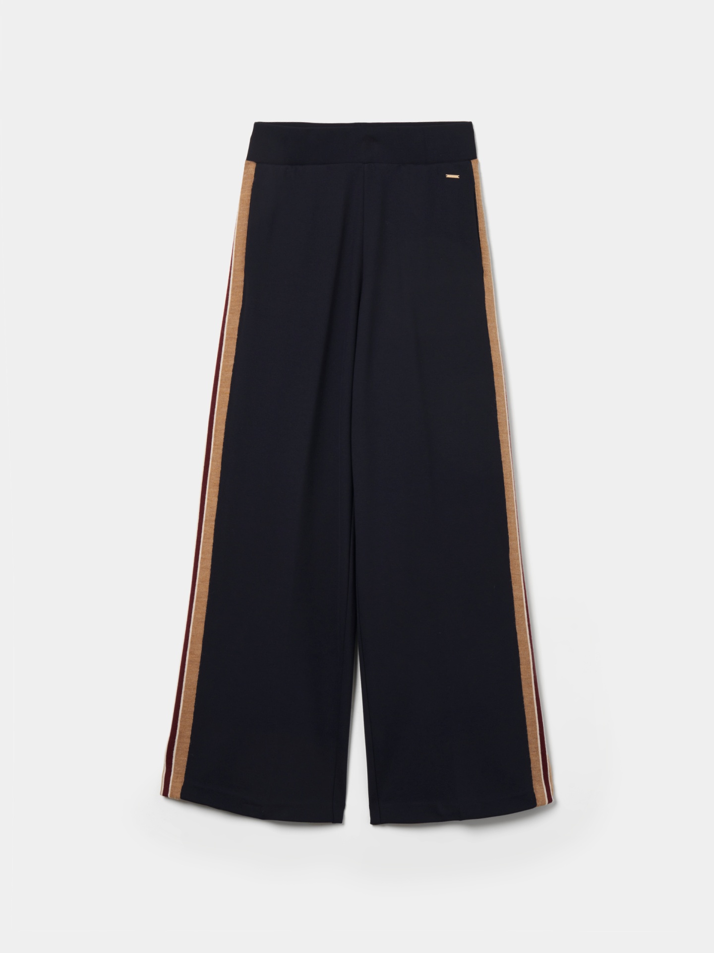 Estas calças de malha apresentam riscas laterais em contraste, alongam a silhueta e adicionam um toque desportivo ao look. Perfeitas para usar no dia a dia, garantem liberdade de movimento e combinam na perfeição com a camisola coordenada para um look completo e harmonioso.