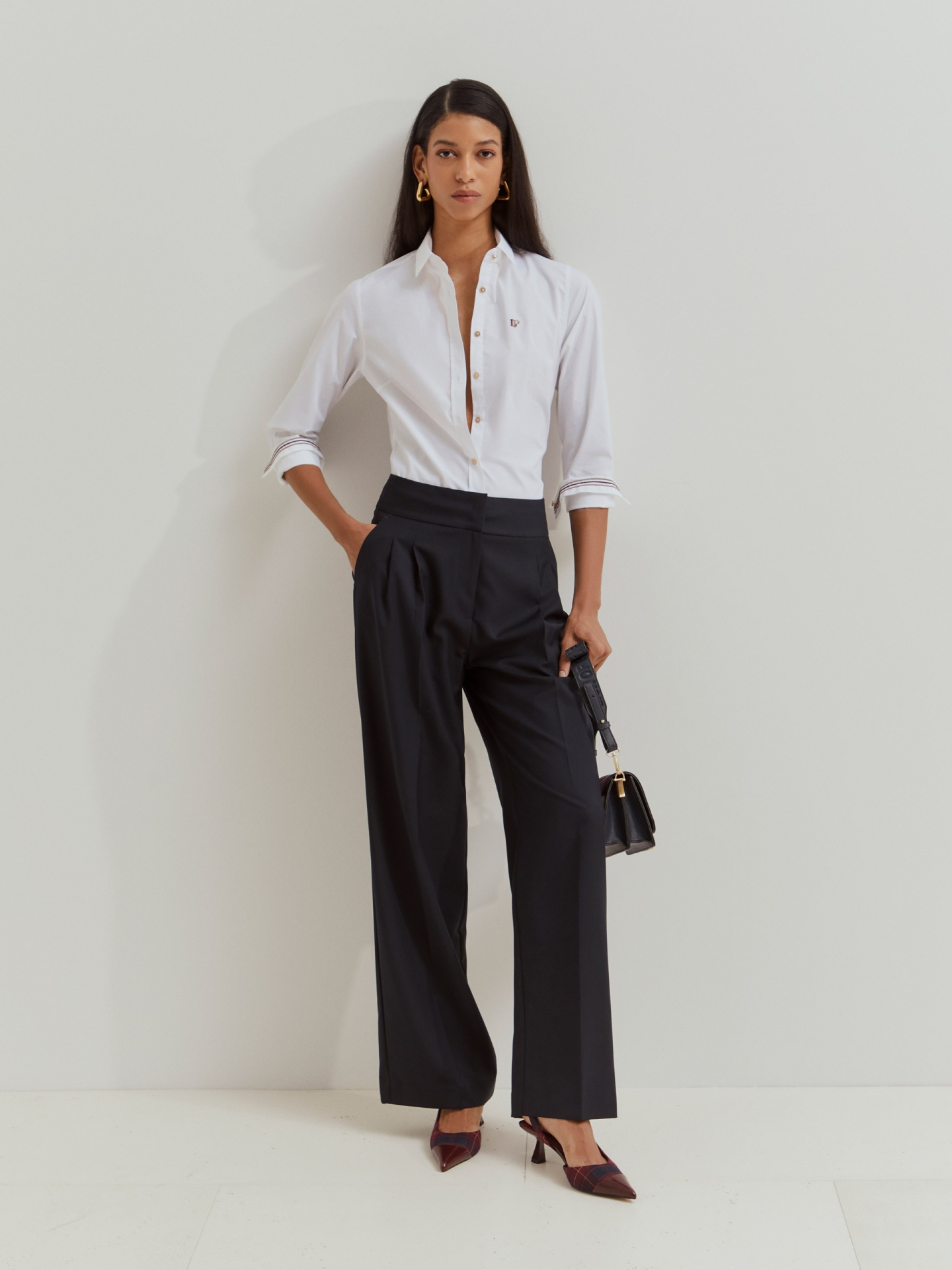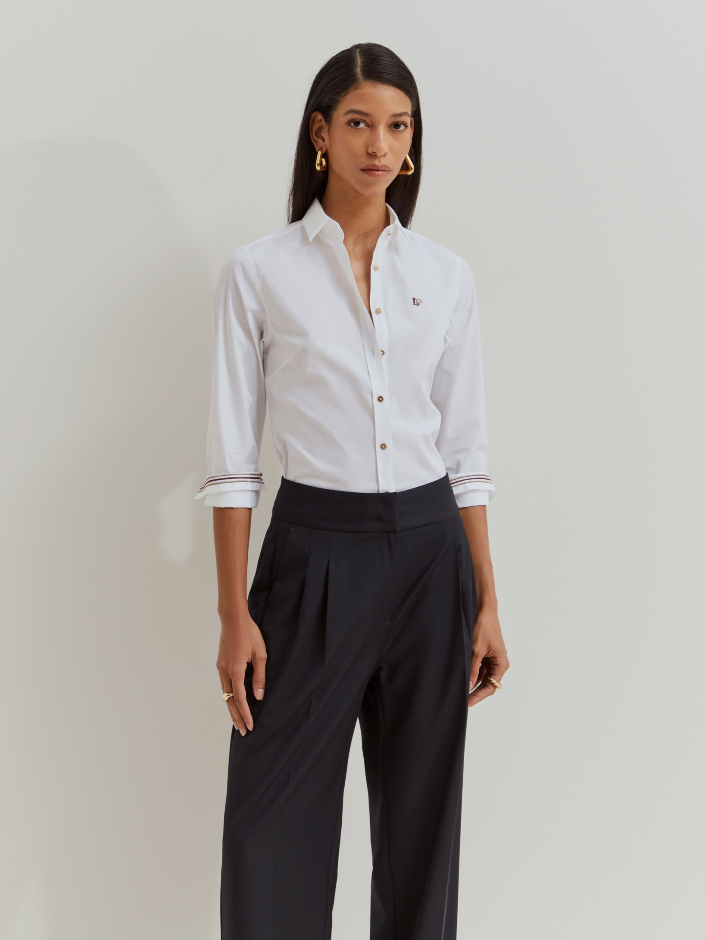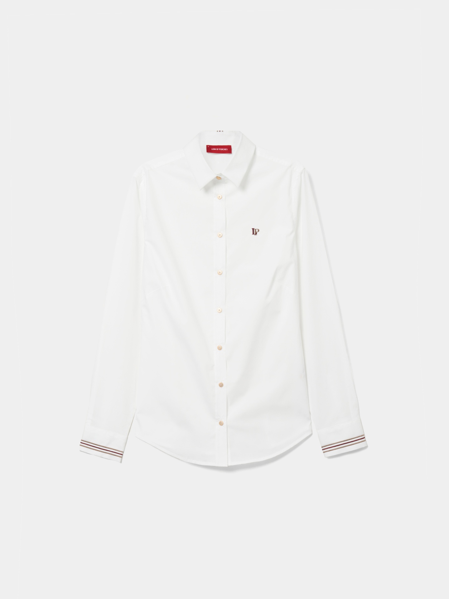 Camisa clássica, de manga comprida, com abertura por botões. Nos punhos, pormenor muito elegante e diferenciador de riscas bordadas no mesmo tom que o logotipo no peito. De bainha arredondada. Um modelo regular fit, confecionado em algodão para maior conforto e suavidade ao toque.