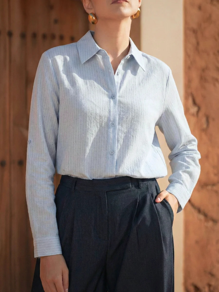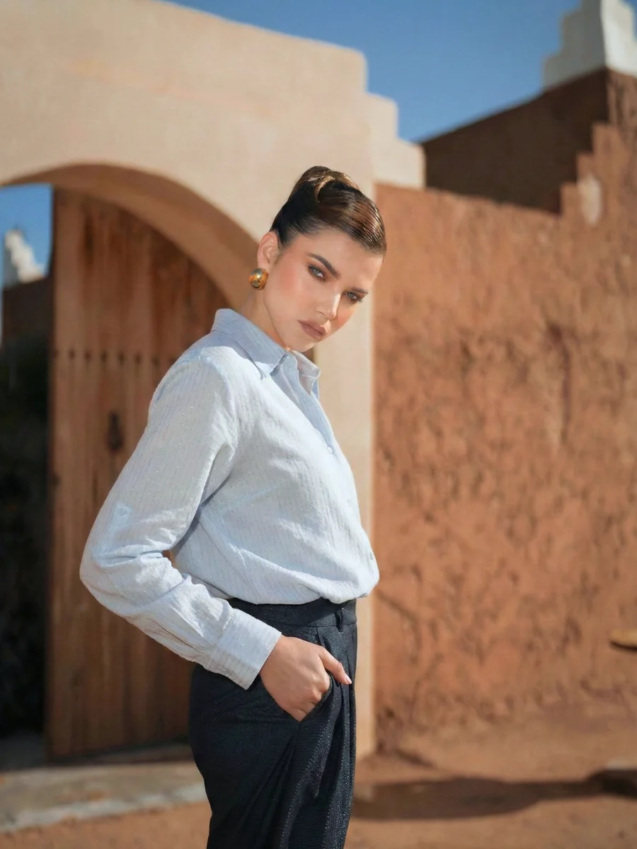 Esta camisa em tom azul claro destaca-se pela textura subtil com risca em lurex, que acrescenta sofisticação sem perder leveza. O corte clássico e fluido cria uma silhueta elegante e versátil, ideal para looks de dia ou para elevar coordenados mais urbanos.