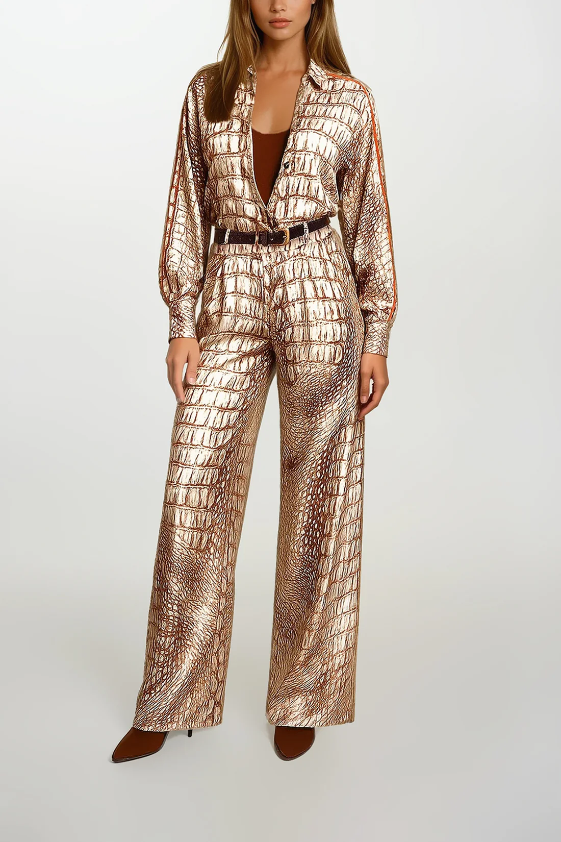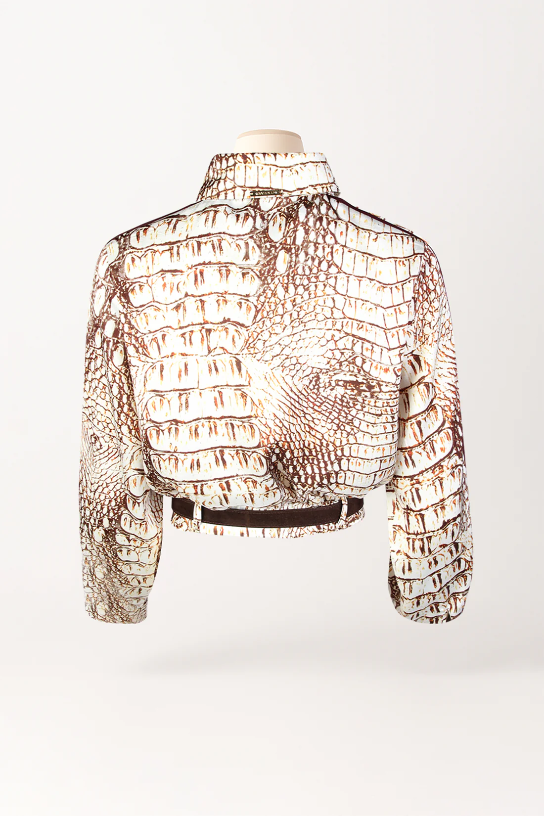 Camisa Sahoco em cetim com estampado animal inspirado em pele exótica. O design estruturado com botões frontais dourados e detalhe contrastante nos ombros oferece sofisticação com um toque arrojado. Uma peça statement, perfeita para coordenados de dia ou de noite.