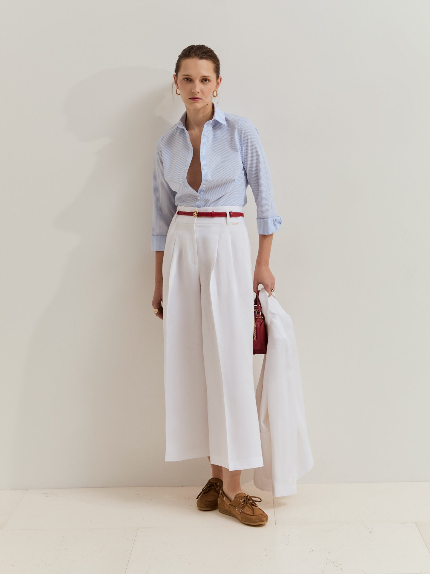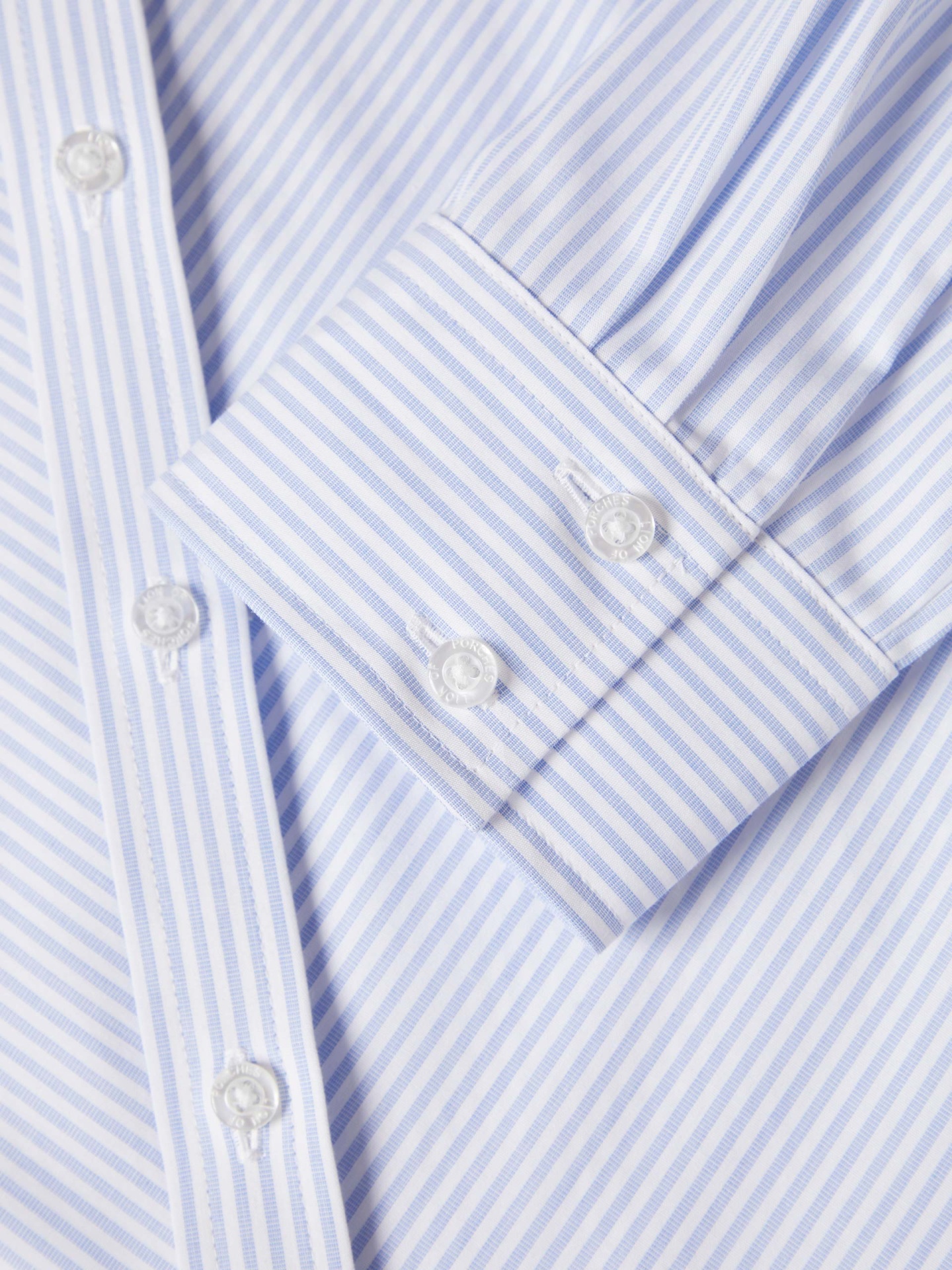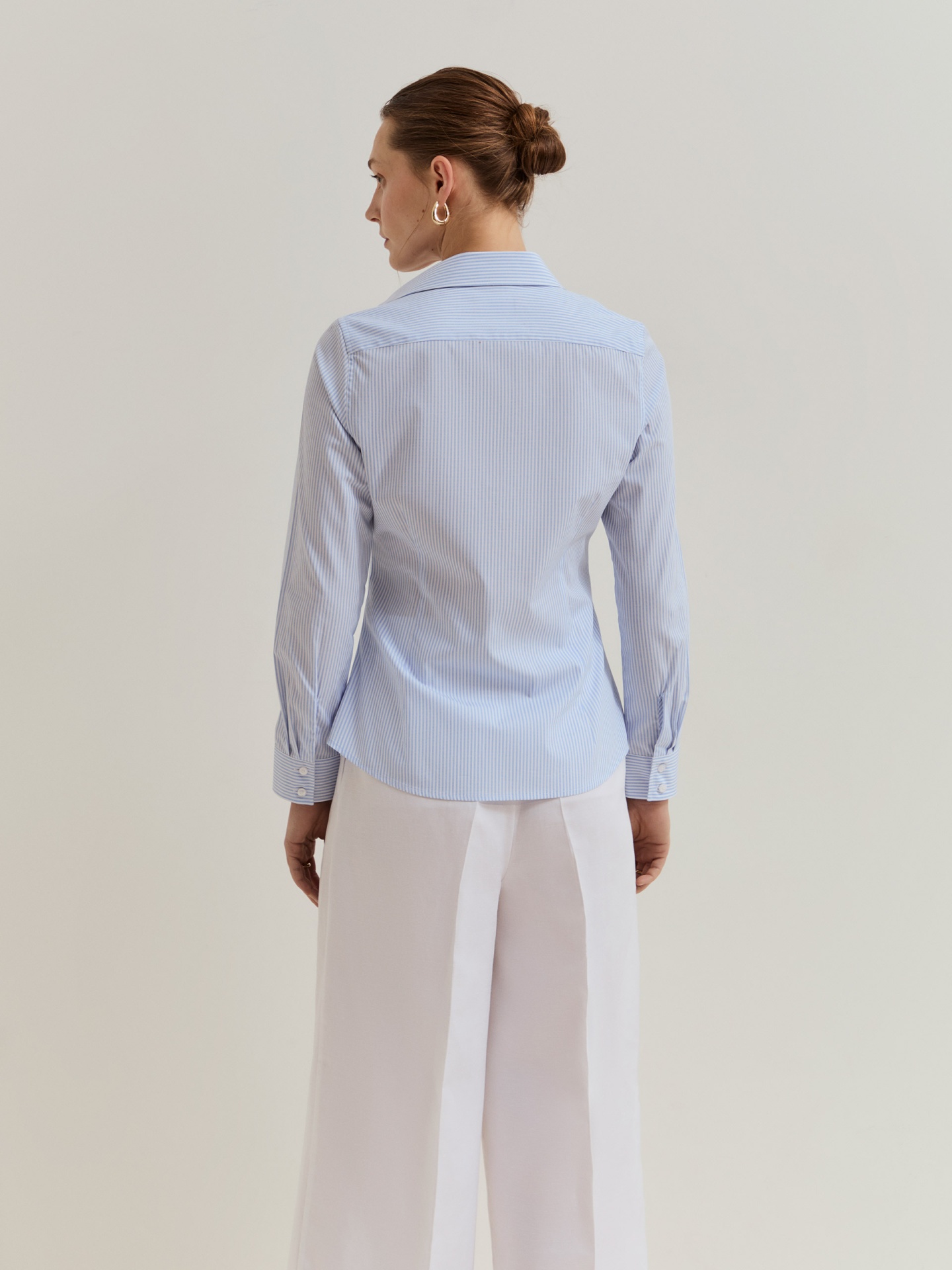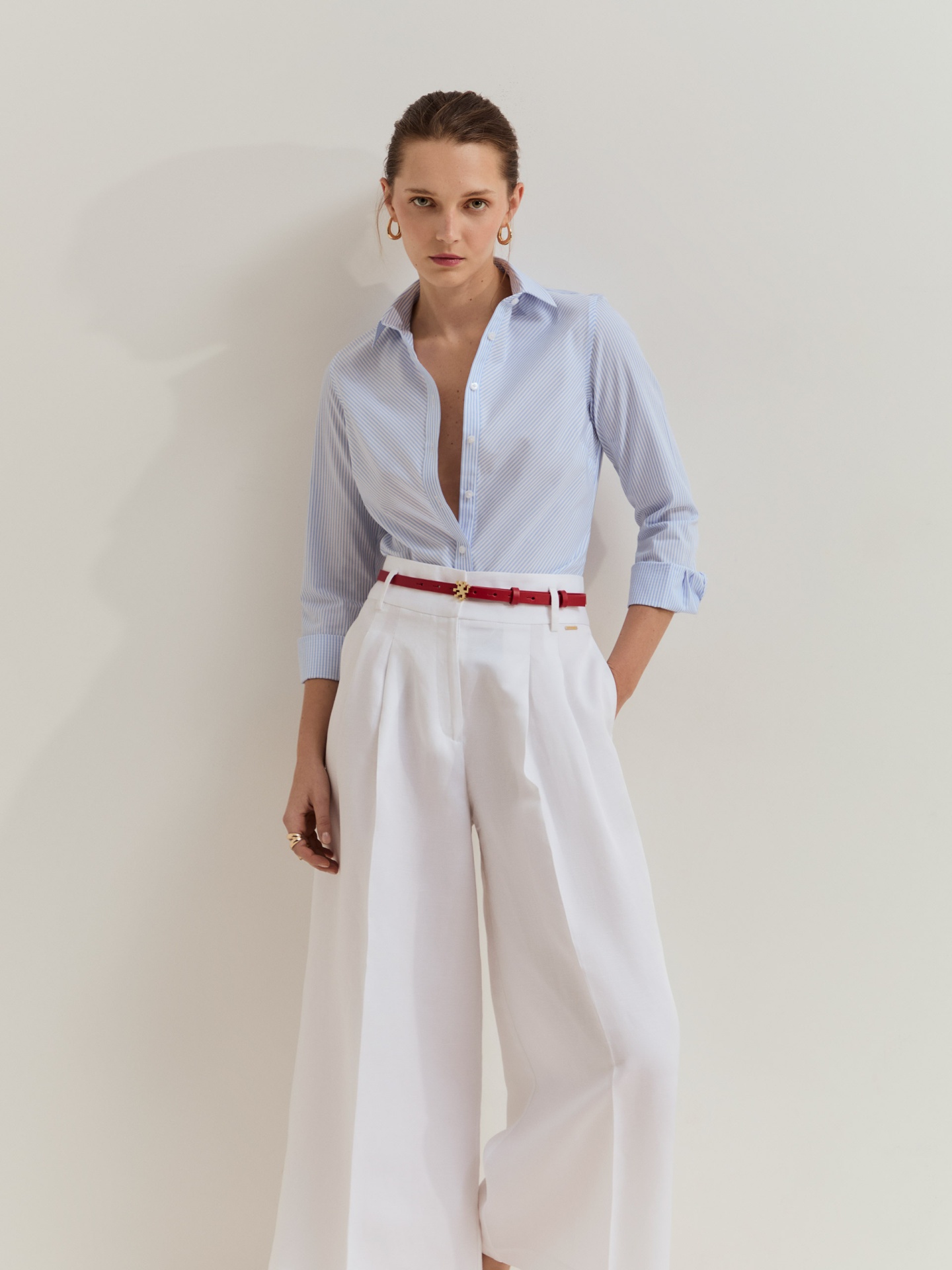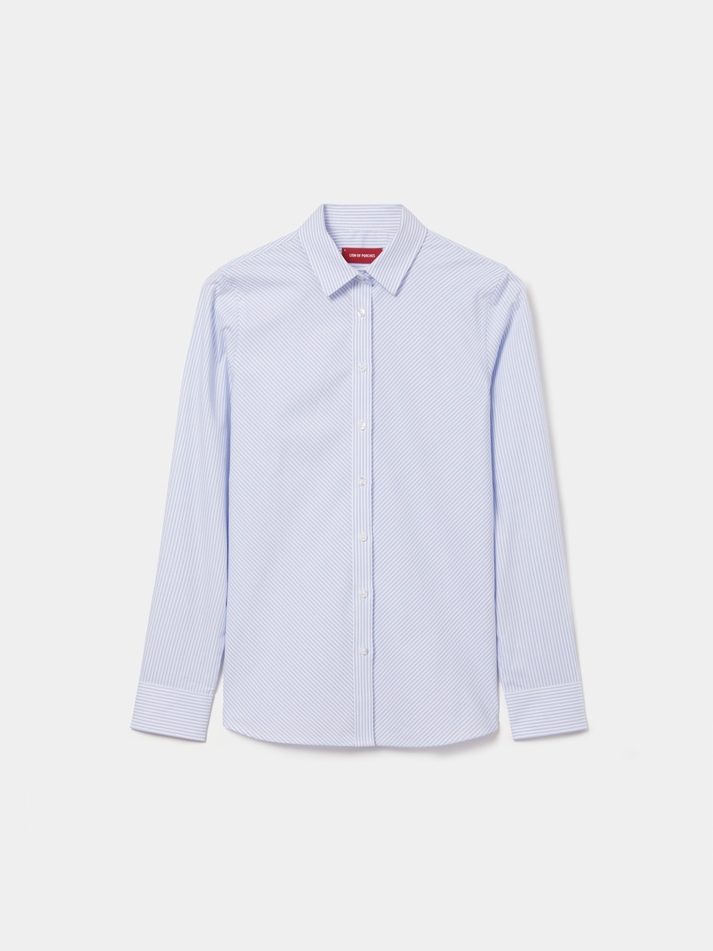 Clássica e versátil, esta camisa com corte regular fit, confecionada em 100% algodão, destaca-se pelo seu padrão de riscas finas. Apresenta um colarinho tradicional e botões personalizados que reforçam a atenção ao detalhe, garantindo um visual cuidado e elegante em qualquer ocasião. Uma peça essencial e intemporal, ideal para completar o guarda-roupa masculino com sofisticação.