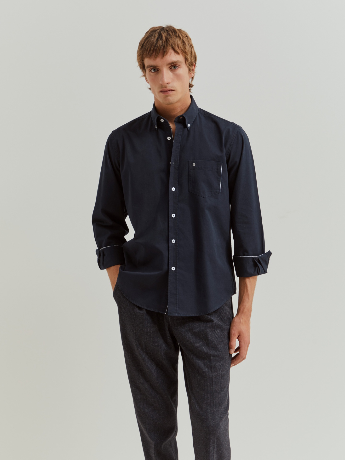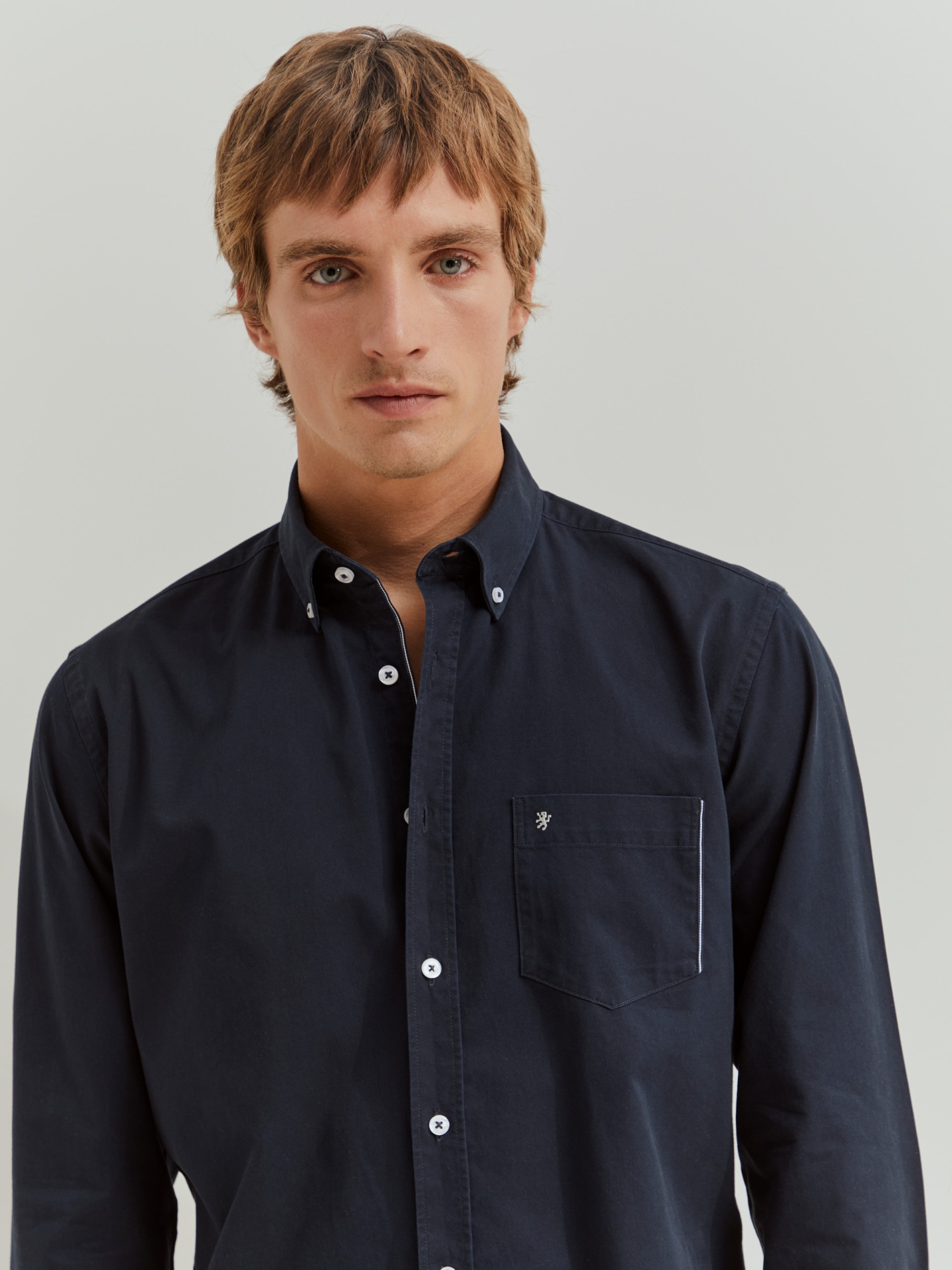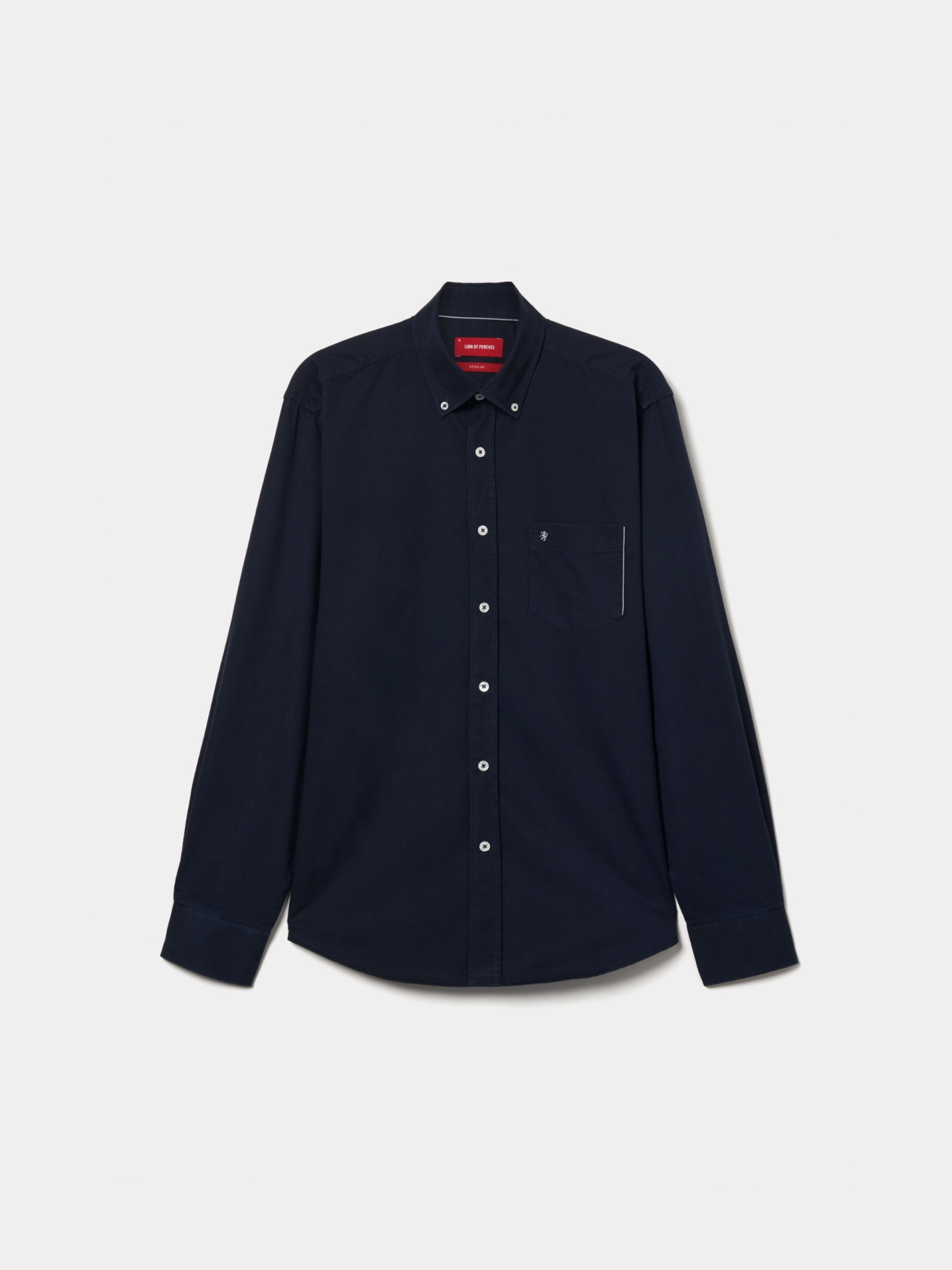 Complemente o seu guarda-roupa de essenciais com esta camisa regular fit de manga comprida. Com abertura por botões em contraste e colarinho também com dois botões. Bolso no peito com pormenor de risca em contraste e leão da marca bordado.