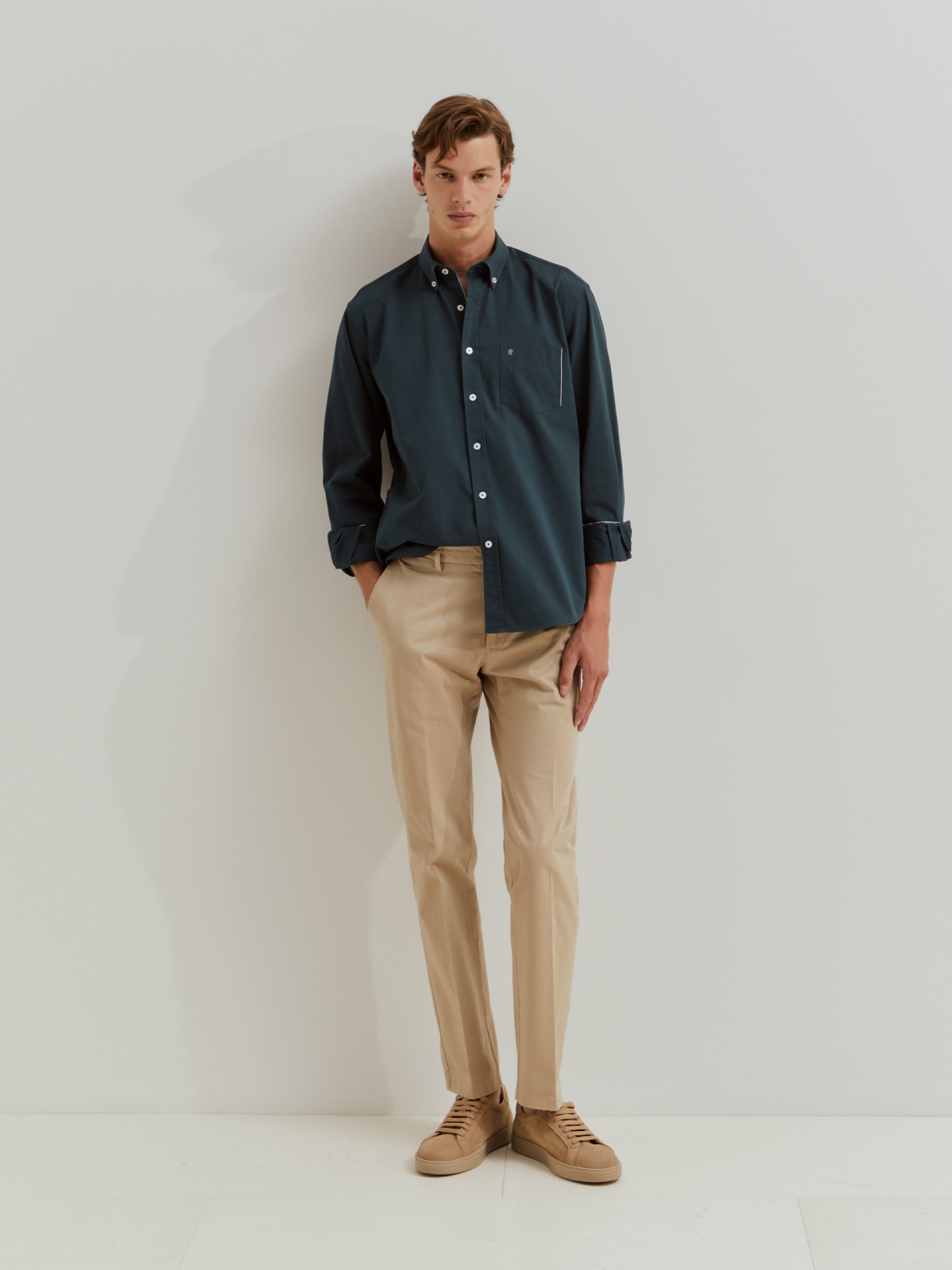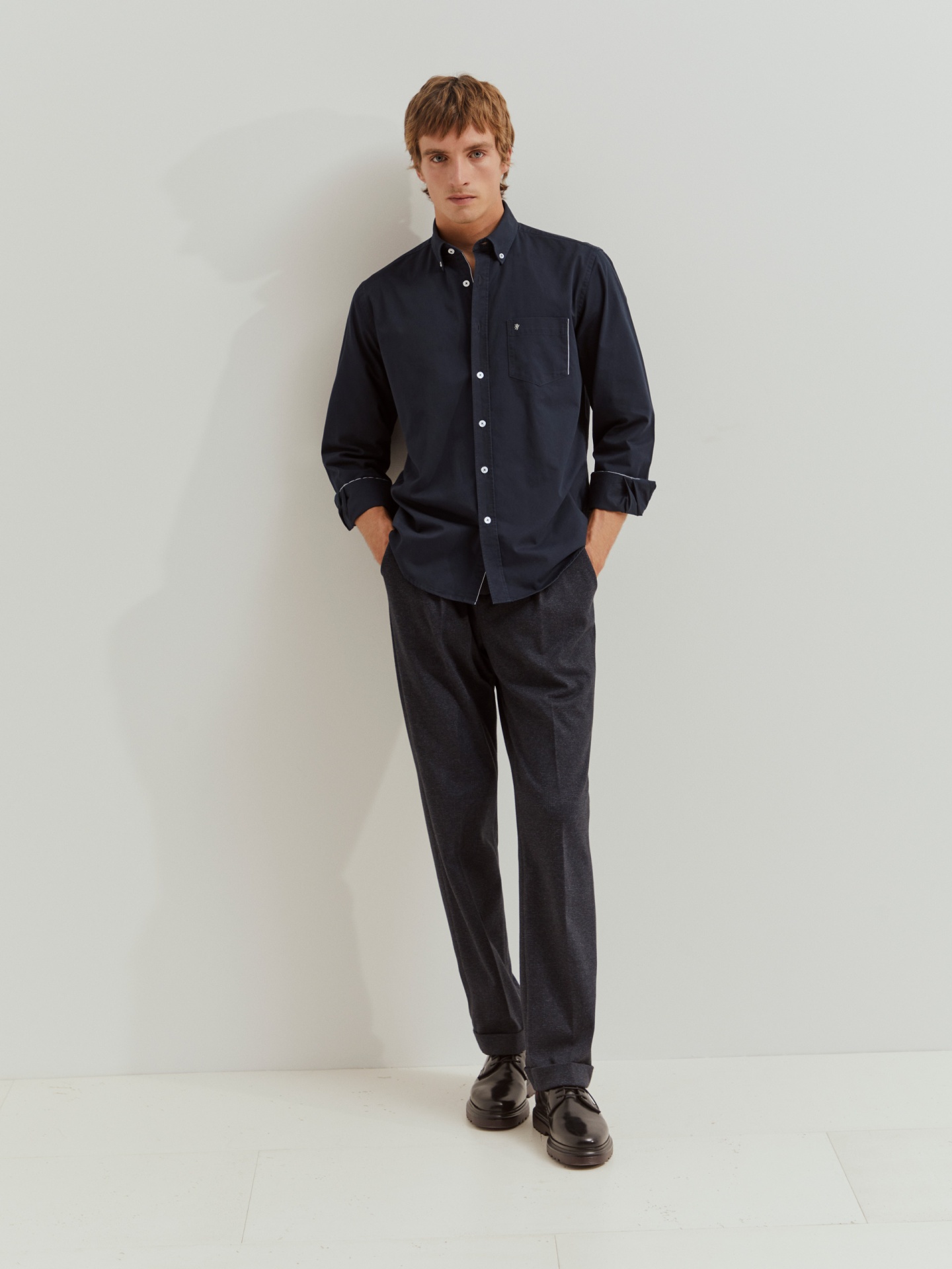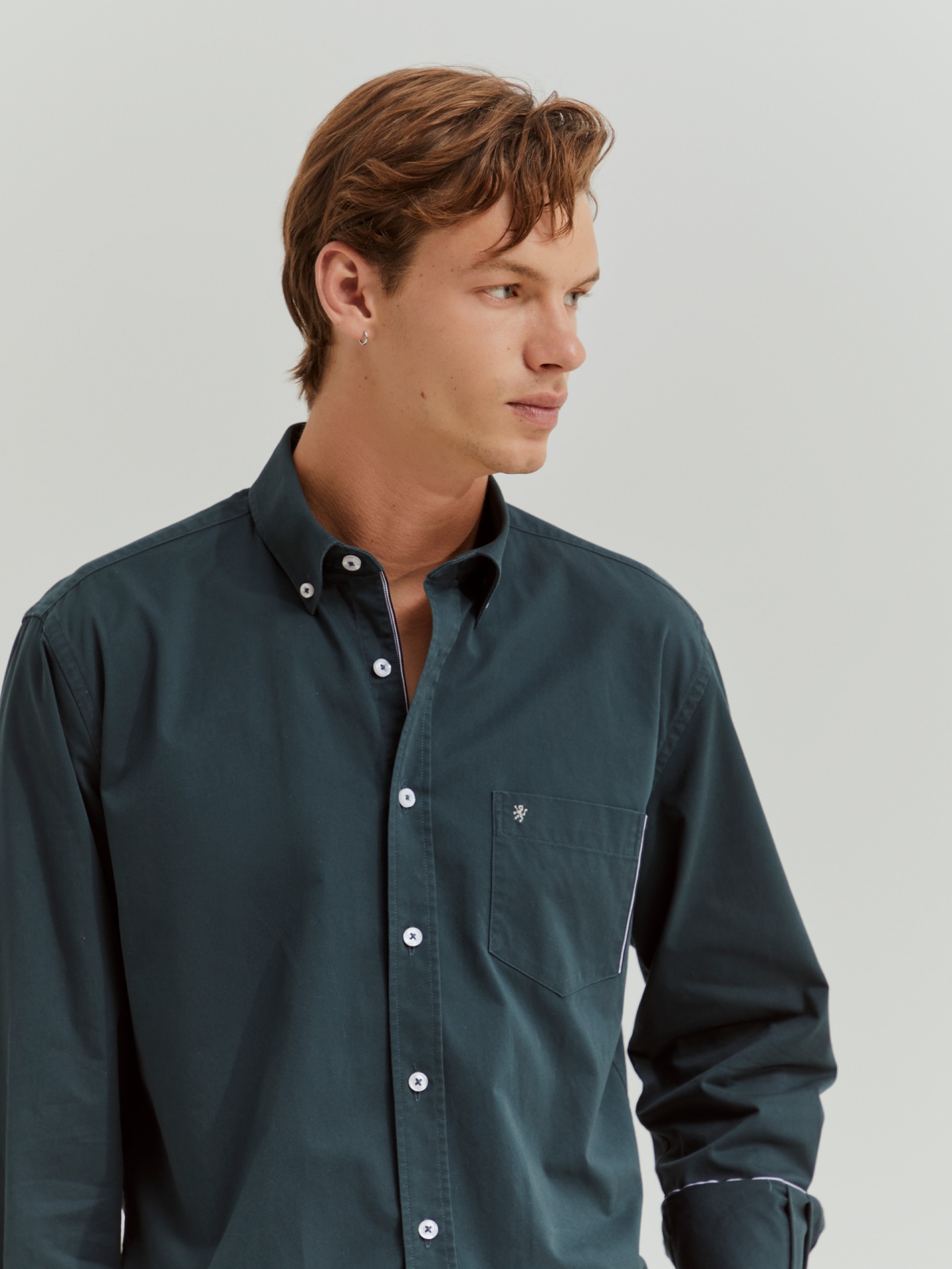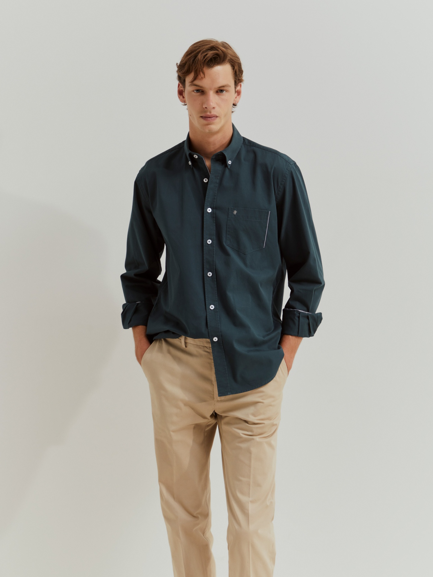 Complemente o seu guarda-roupa de essenciais com esta camisa regular fit de manga comprida. Com abertura por botões em contraste e colarinho também com dois botões. Bolso no peito com pormenor de risca em contraste e leão da marca bordado.