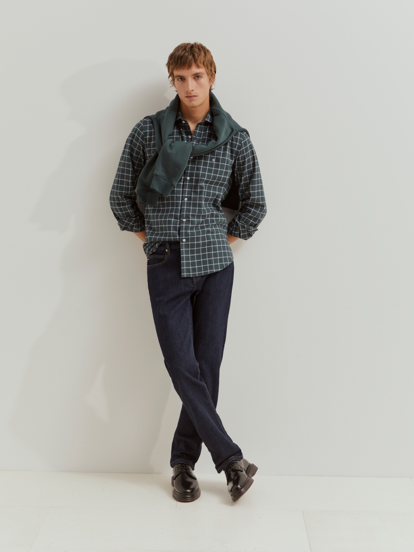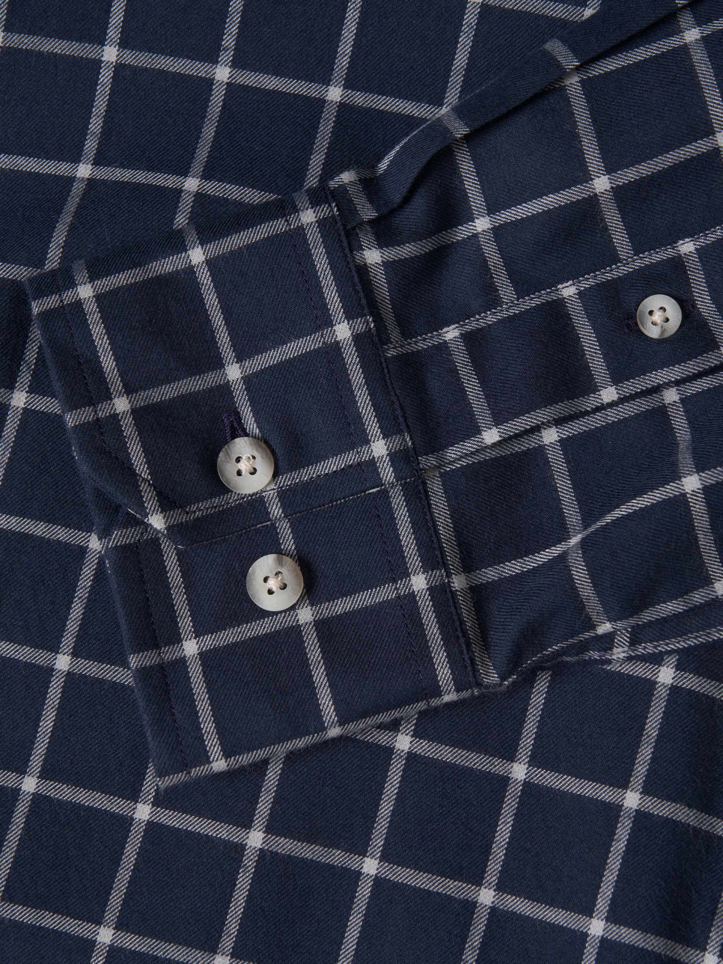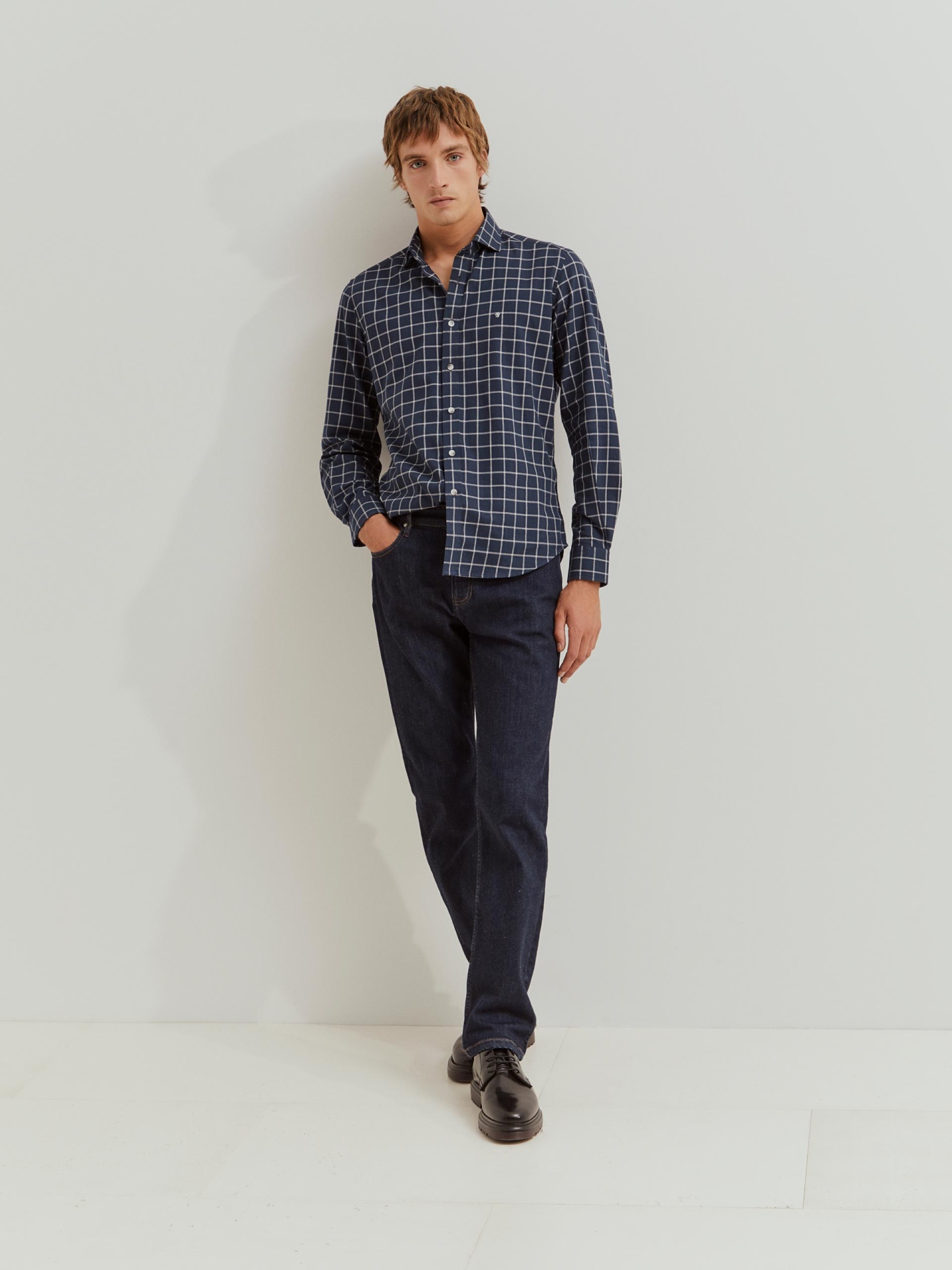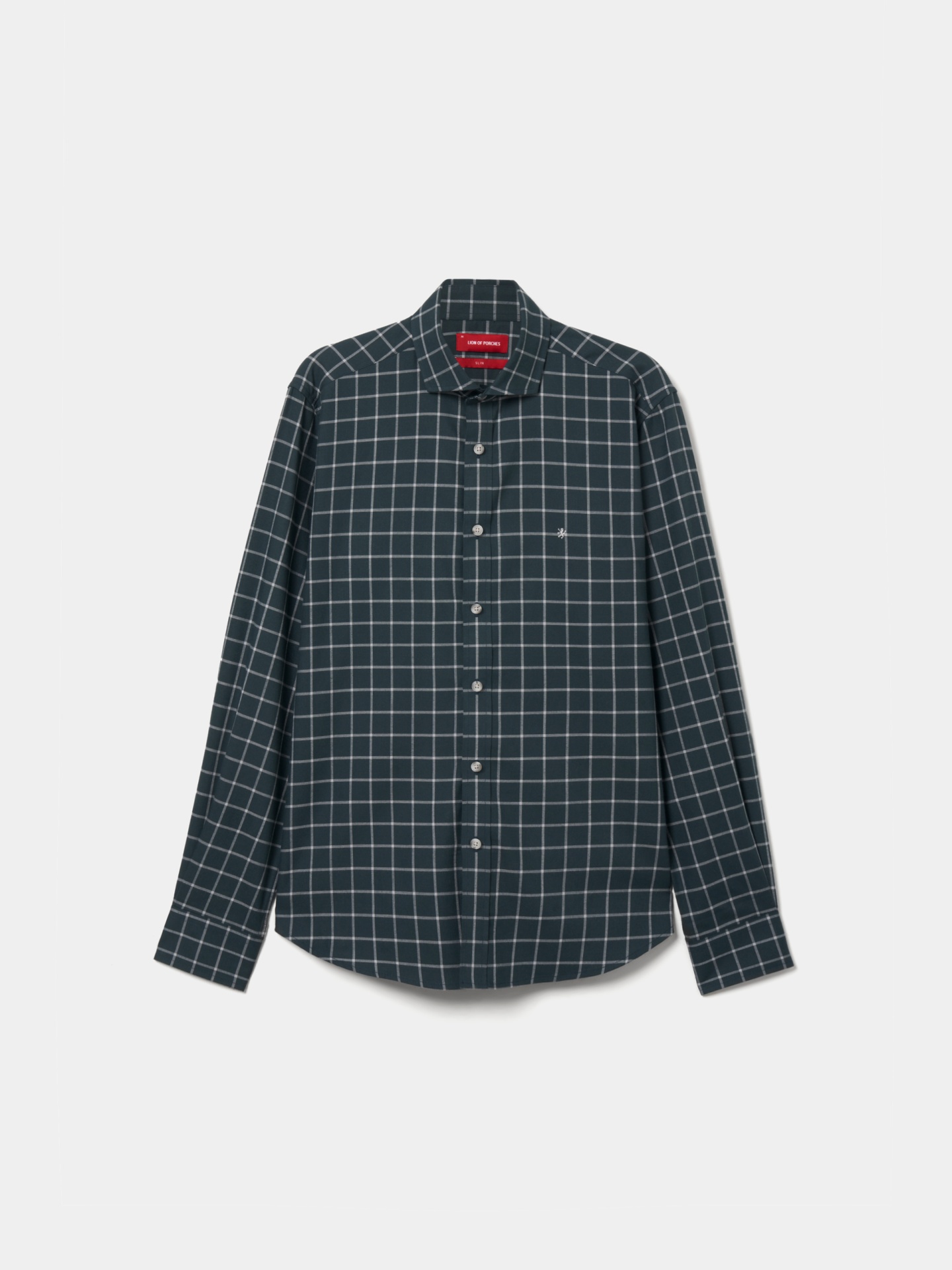Camisa de manga comprida com padrão xadrez. Com colarinho "cutaway" e abertura por botões em contraste de cor. Pormenor de pequeno leão da marca bordado em contraste no peito.