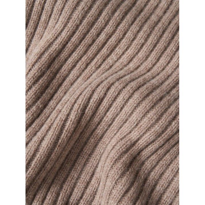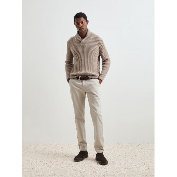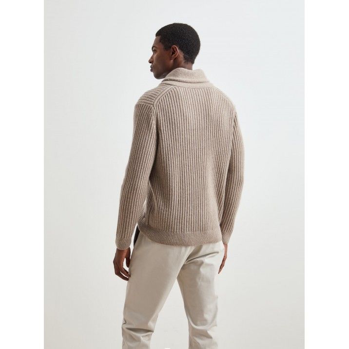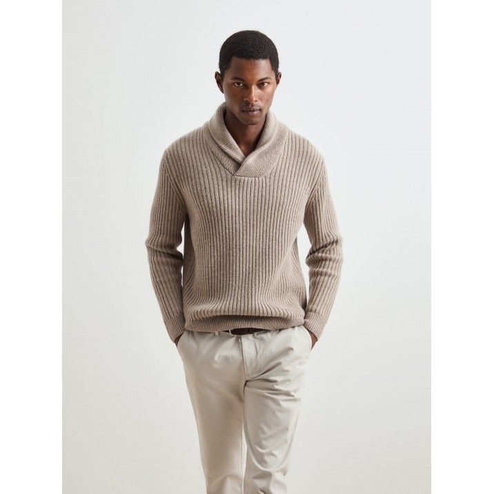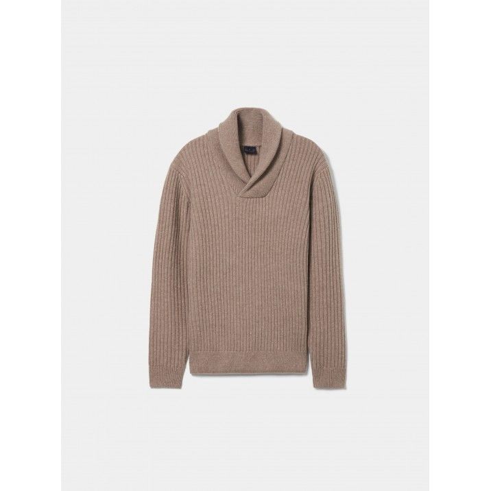 Conforto e sofisticação num só design. Esta camisola em malha canelada destaca-se pela gola xale envolvente, que confere um toque distinto e elegante. Confecionada em mistura de lã de elevada qualidade, oferece conforto, suavidade e um caimento estruturado. Um essencial versátil, perfeito para coordenados casuais ou combinações mais refinadas com camisa por baixo.