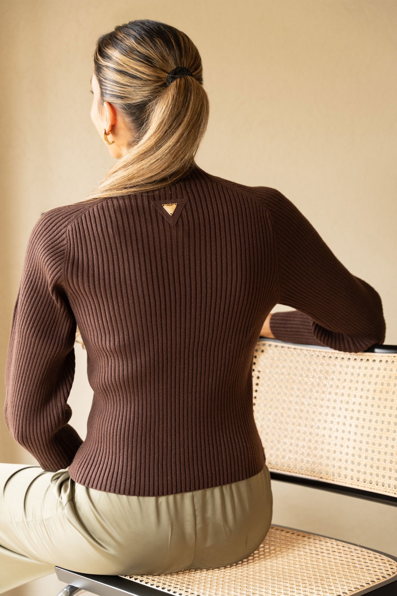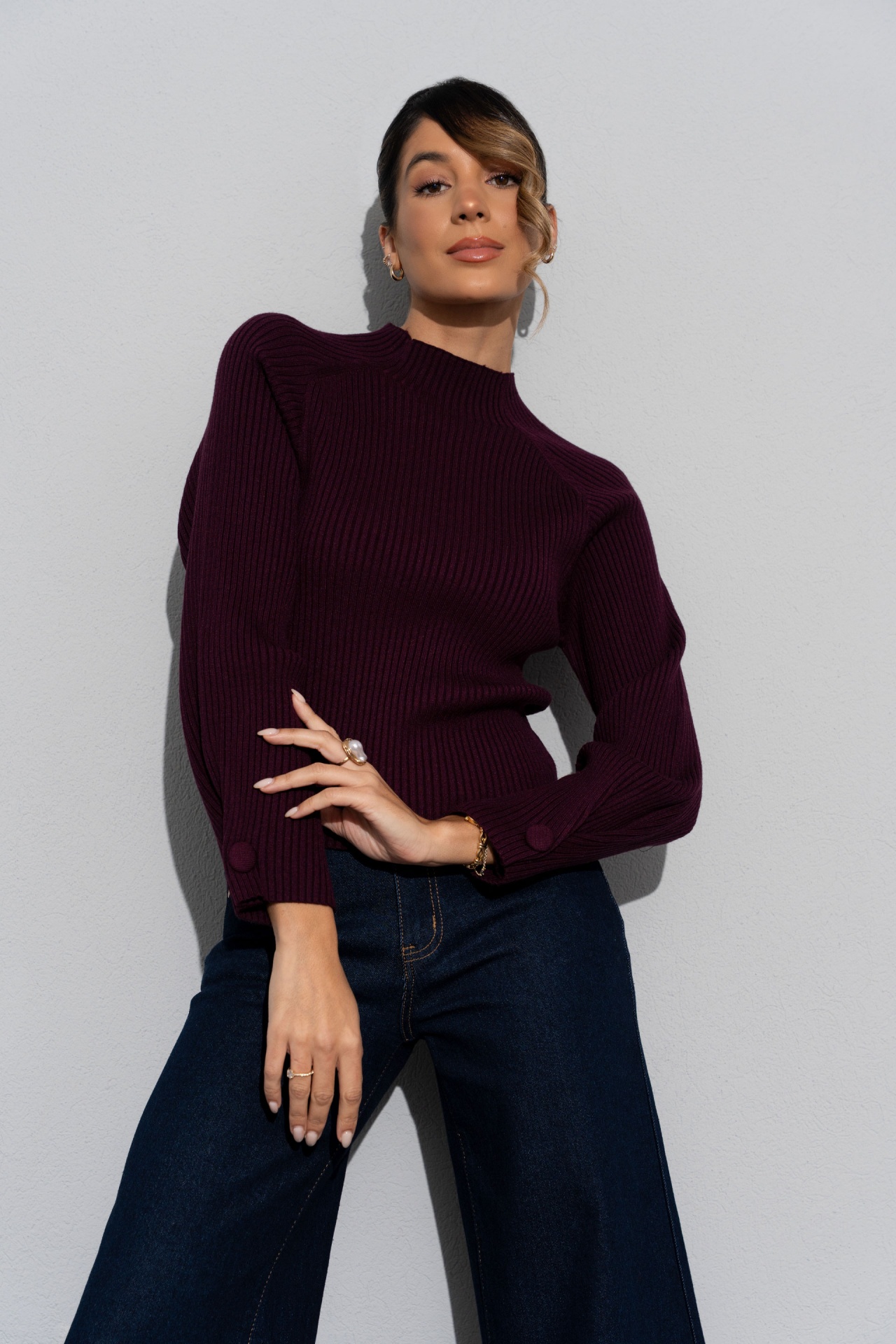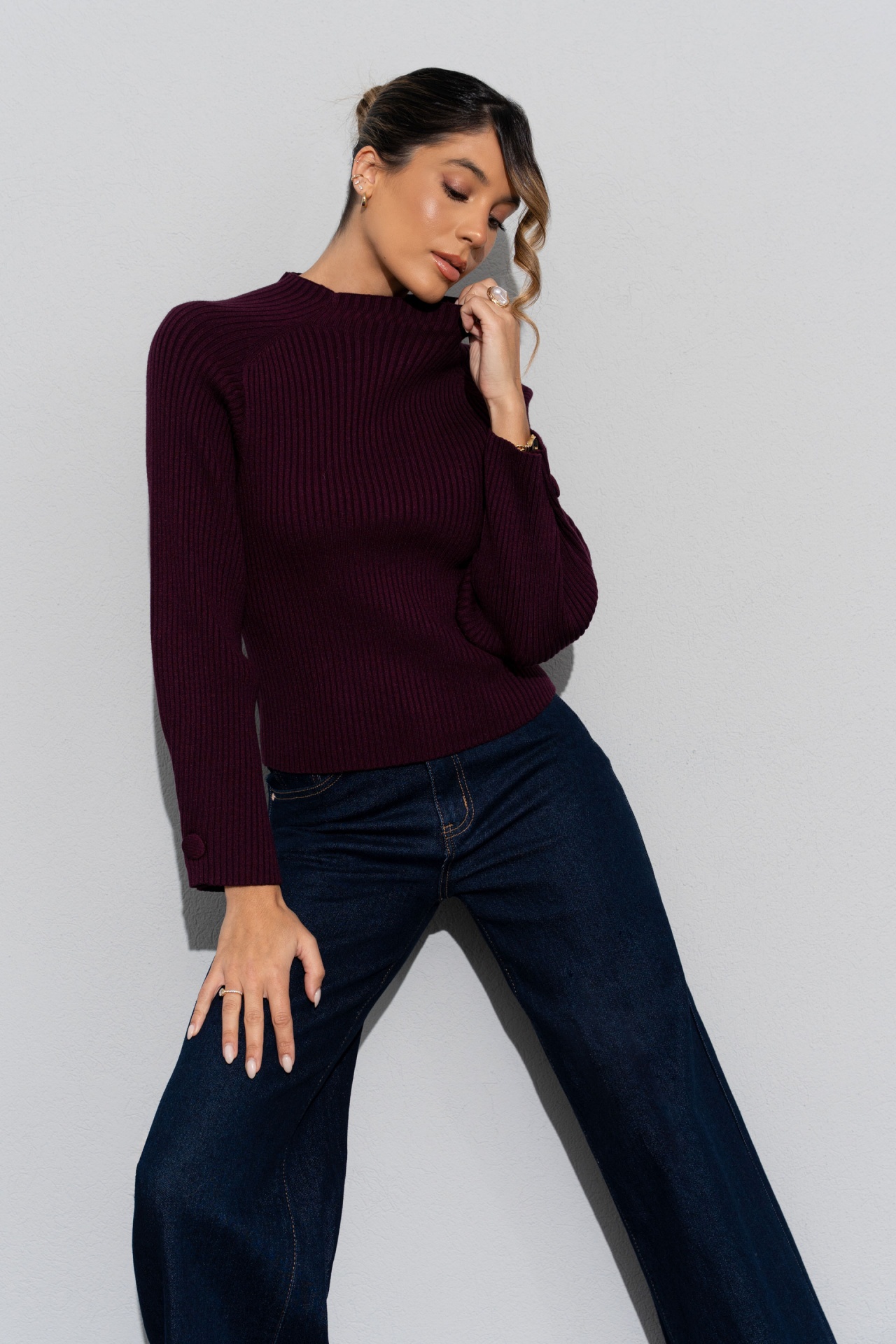 Camisola de malha canelada com gola subida e corte ajustado, que realça a silhueta com elegância. As mangas compridas apresentam um detalhe delicado de botão forrado no punho, conferindo um acabamento sofisticado e distinto.