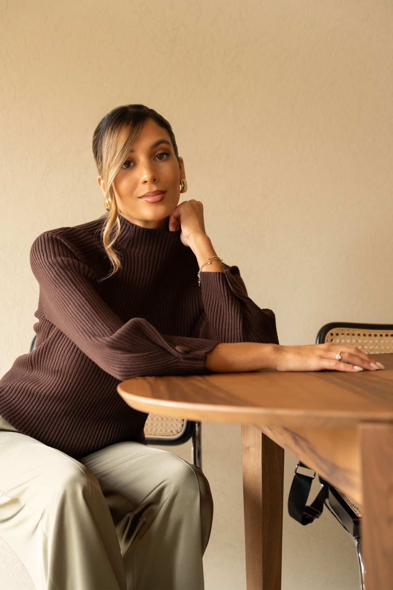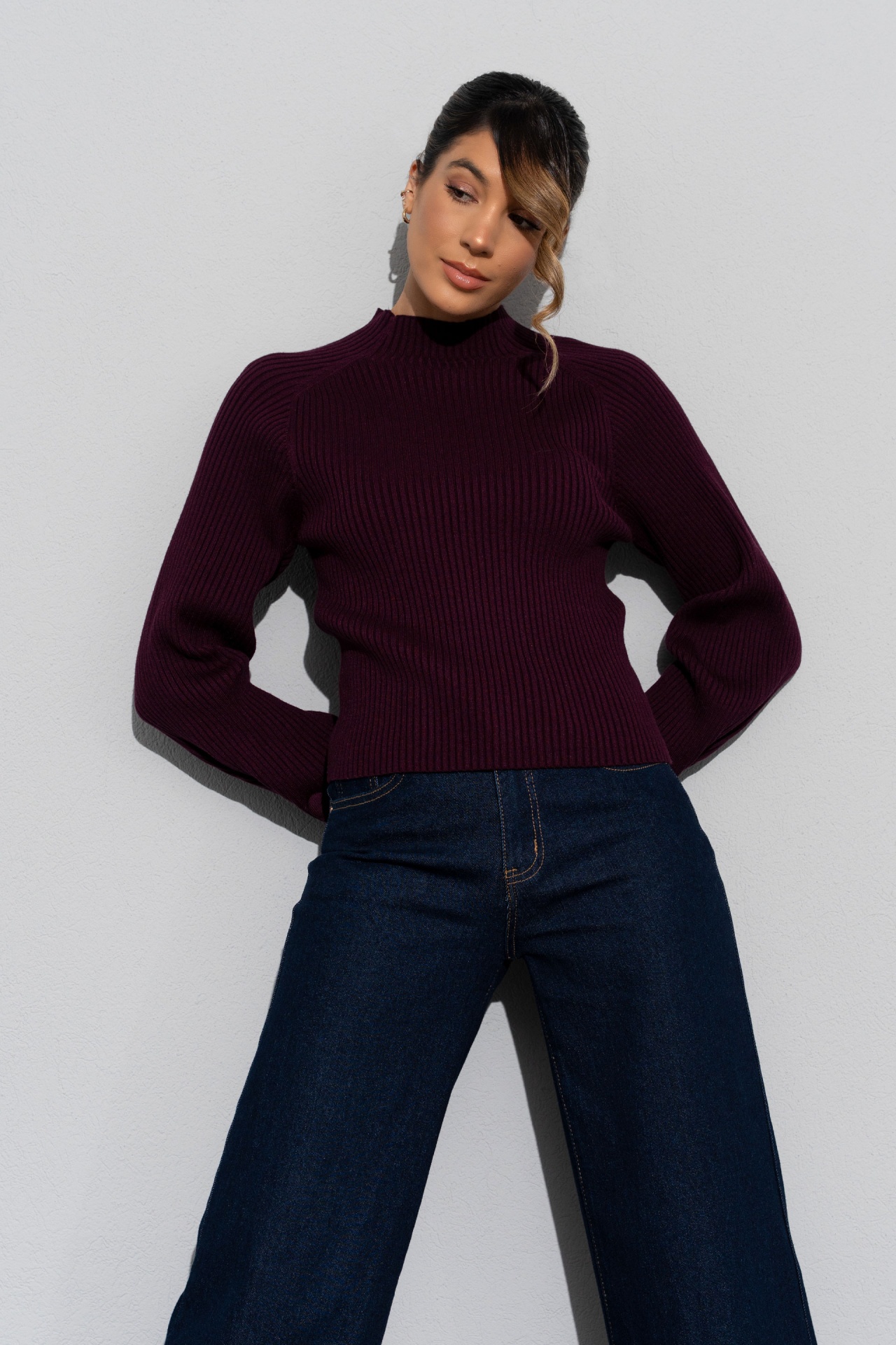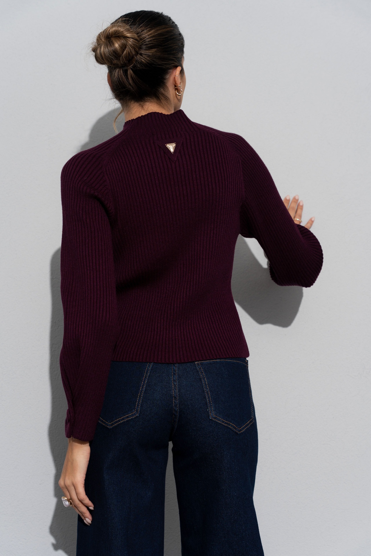 Camisola de malha canelada com gola subida e corte ajustado, que realça a silhueta com elegância. As mangas compridas apresentam um detalhe delicado de botão forrado no punho, conferindo um acabamento sofisticado e distinto.