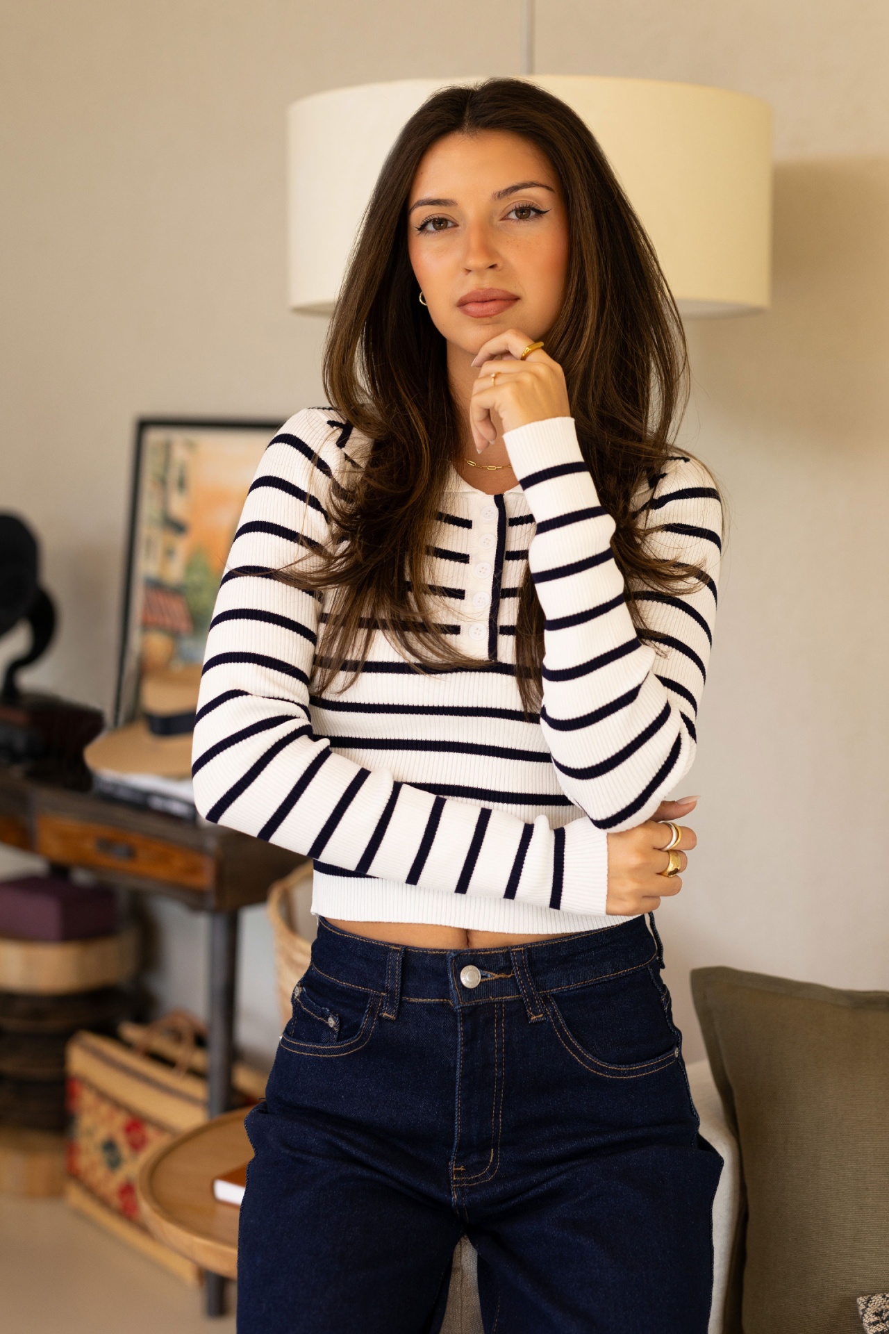 Polo curto de malha canelada com riscas, que alia conforto e estilo. Apresenta gola e fecho frontal com botões, acrescentando um toque distinto. A manga comprida.