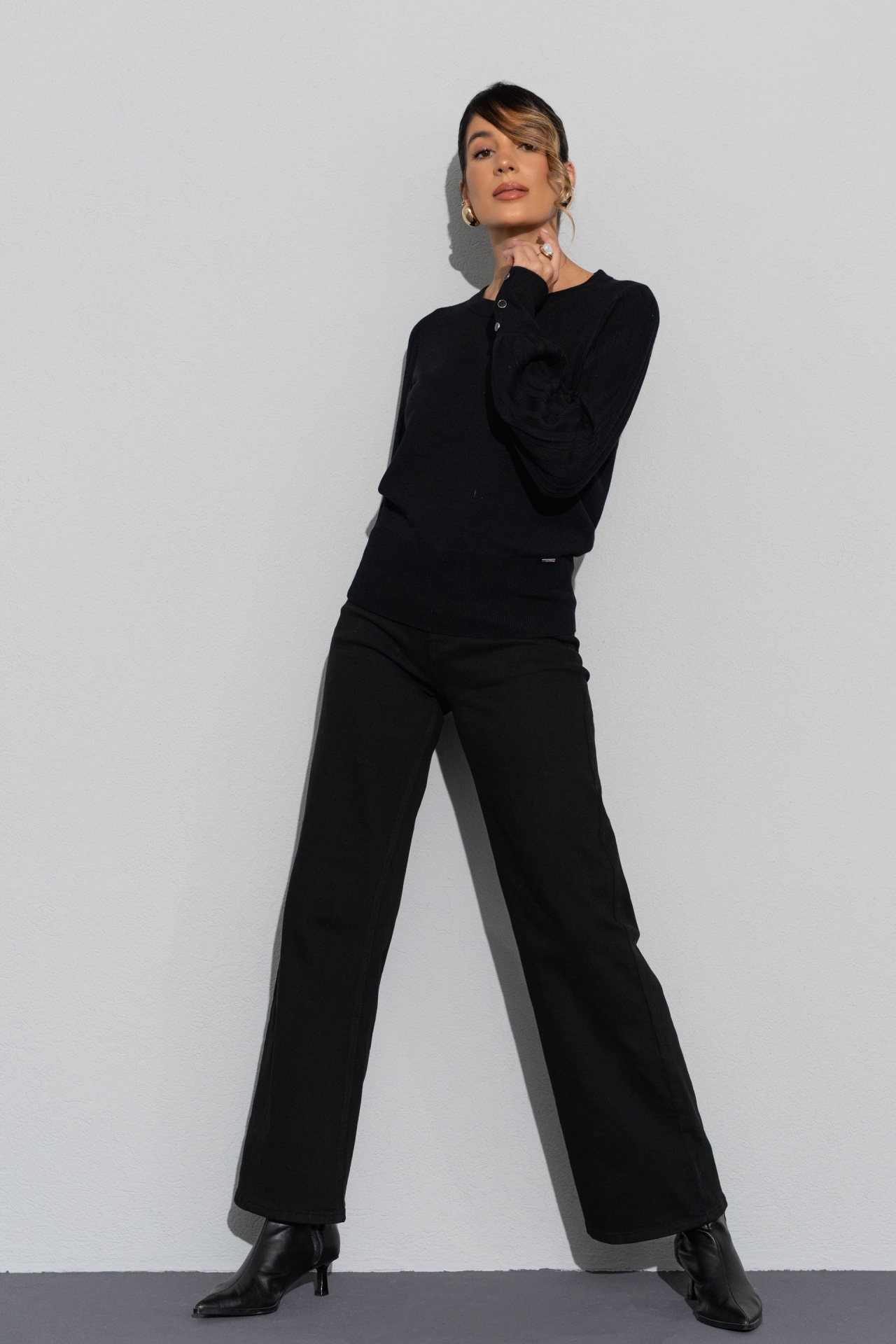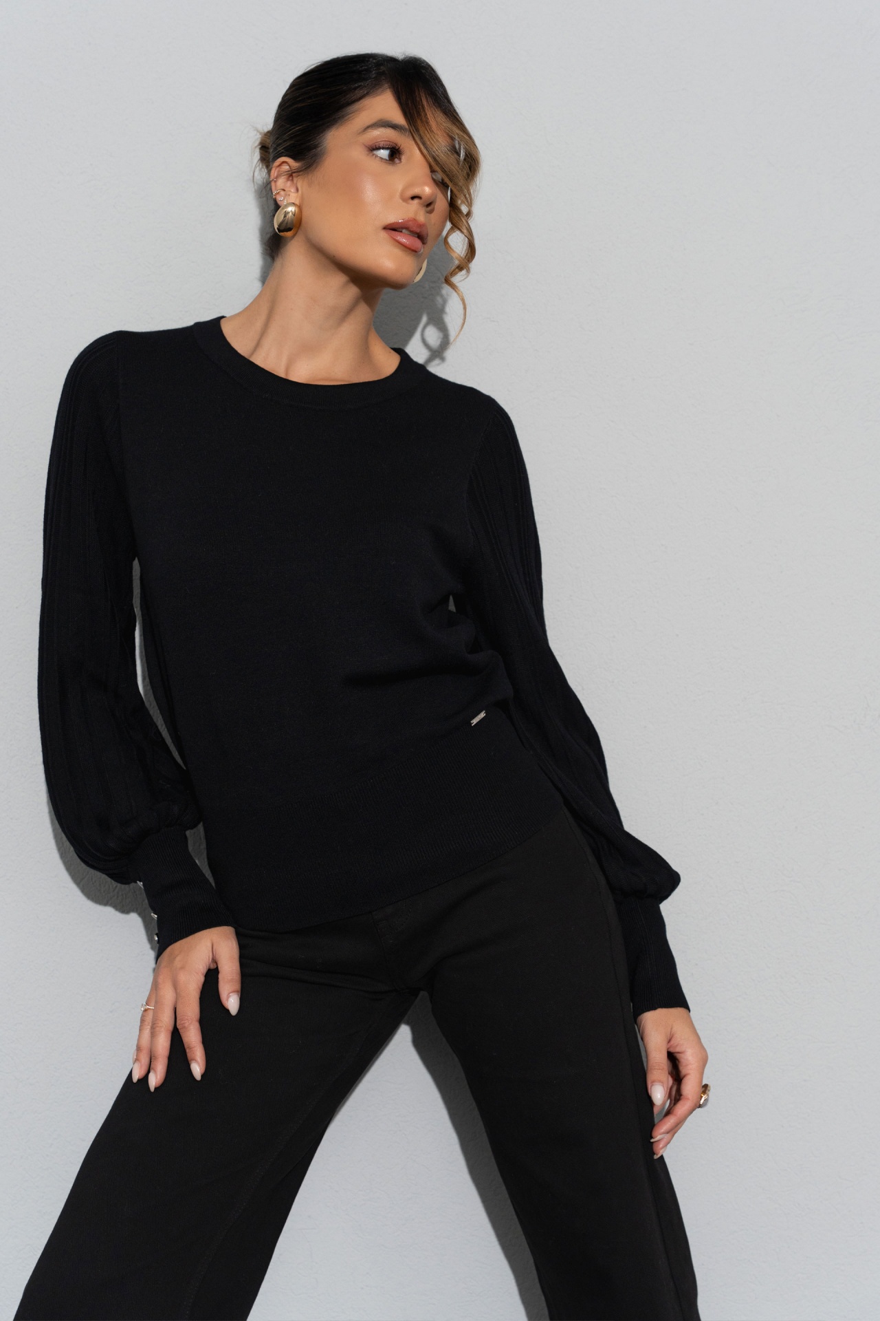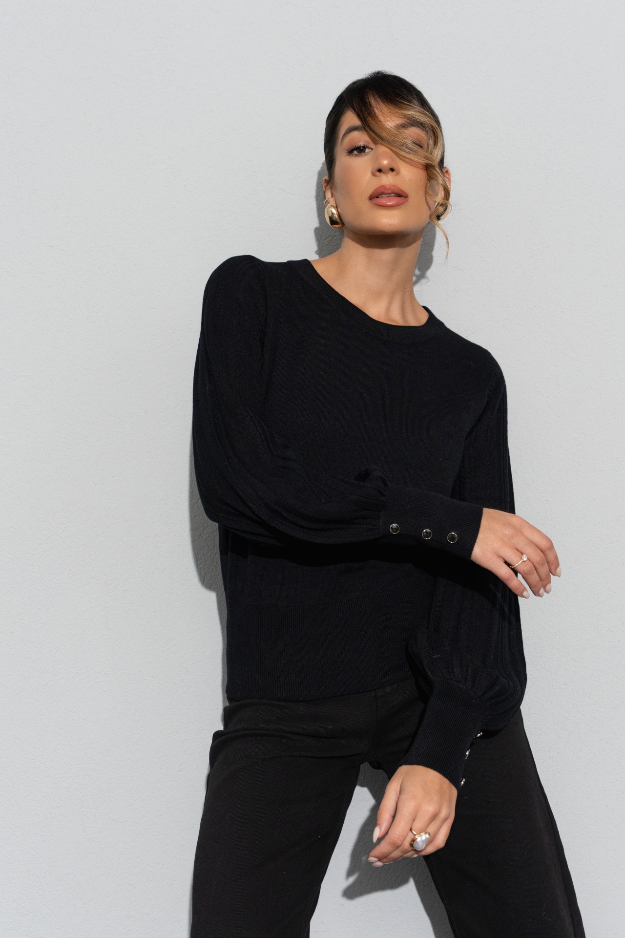 Camisola de malha macia com design sofisticado e feminino. Apresenta decote redondo clássico e mangas longas em pregas, que criam volume elegante. Os punhos largos com aplicação de botões metálicos acrescentam um toque distinto e delicado. Com corte reto e confortável, é uma peça versátil, perfeita para looks casuais-chic ou para coordenados de trabalho com um toque moderno.