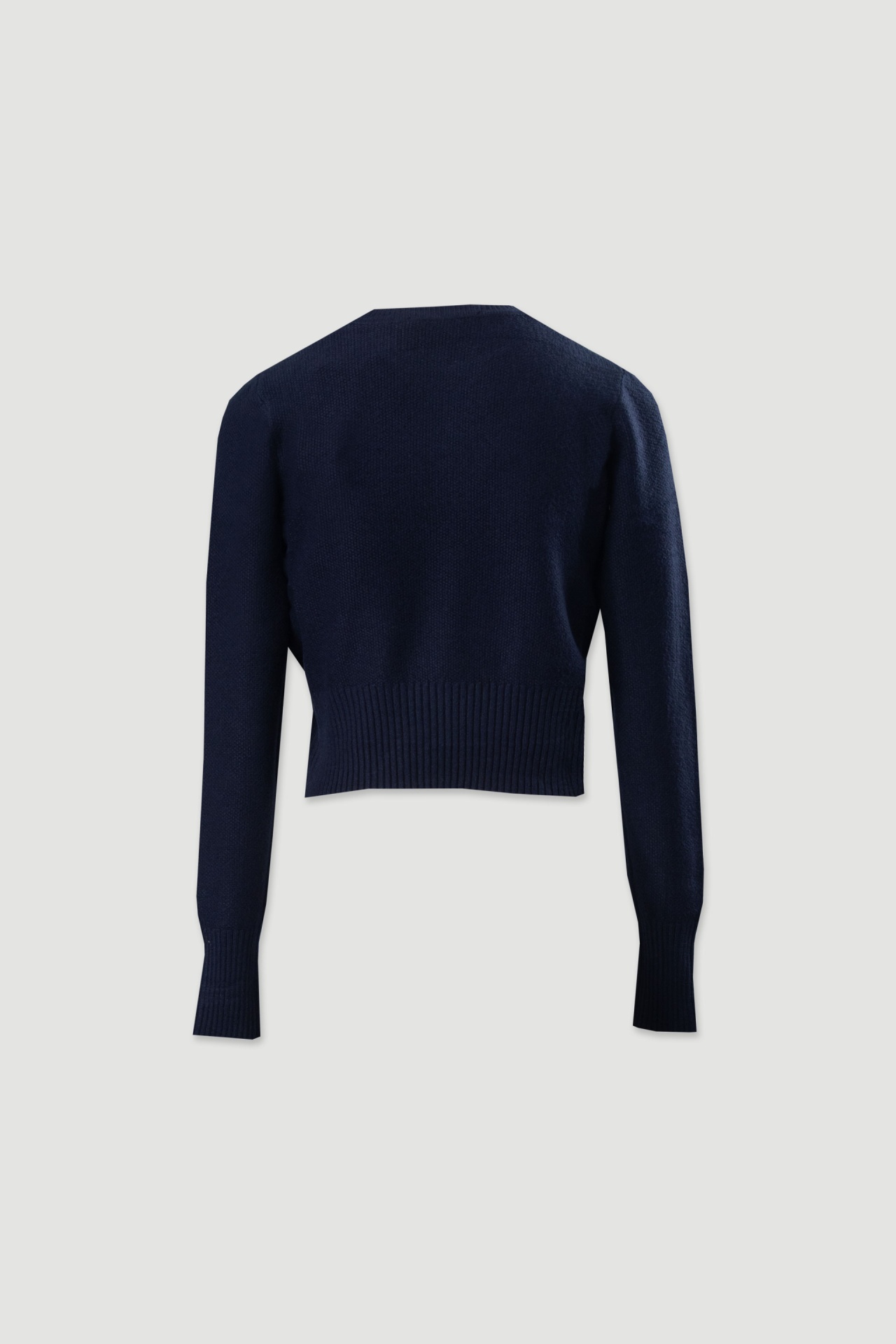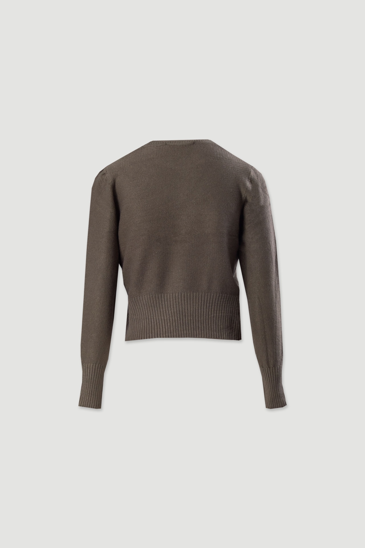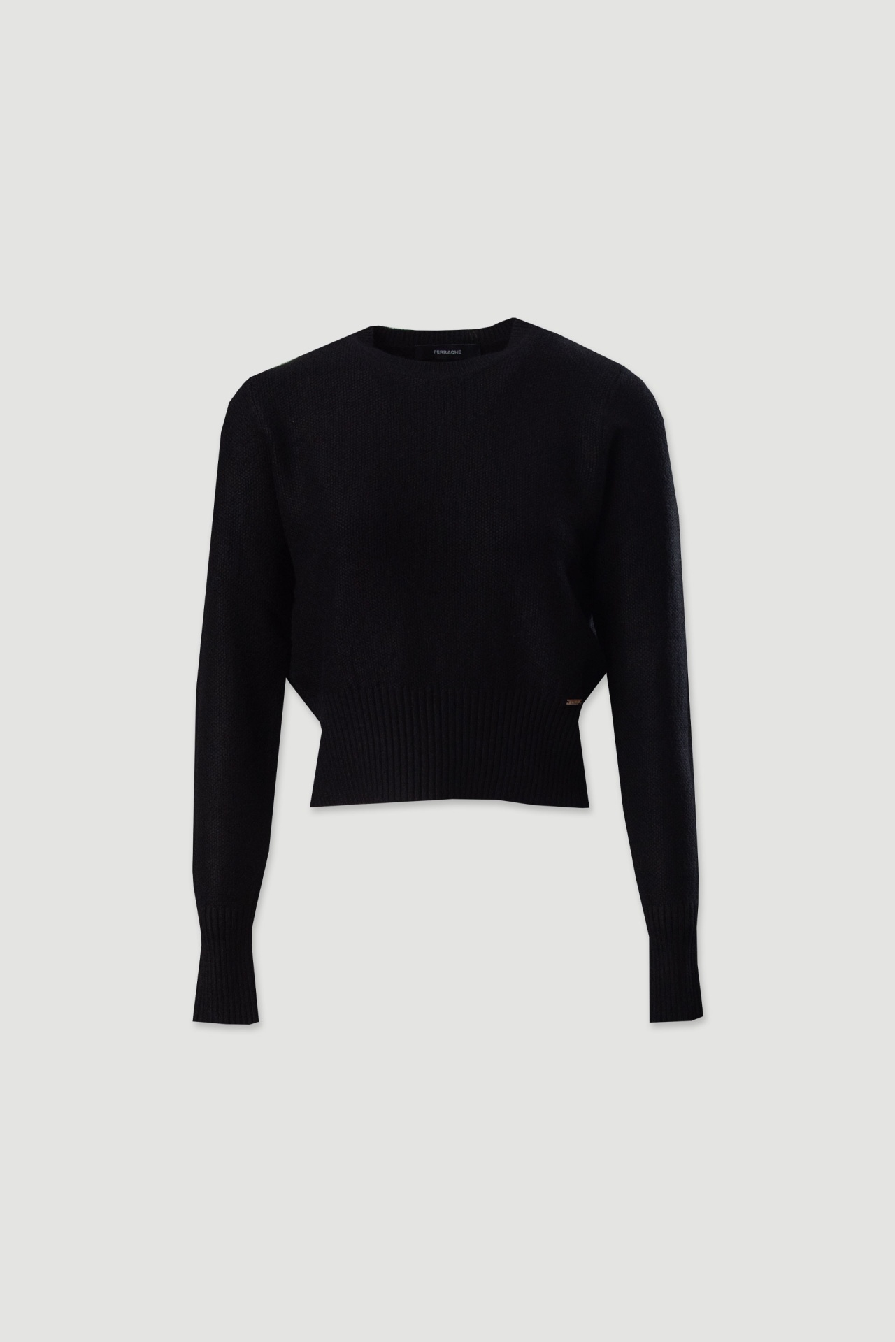 Camisola de malha de corte curto, com gola redonda e manga comprida. O design minimalista destaca-se pelo acabamento canelado na bainha e nos punhos, que confere estrutura e um ajuste confortável. Uma peça versátil e intemporal, ideal para coordenar com peças de cintura subida, criando looks equilibrados entre o casual e o sofisticado.