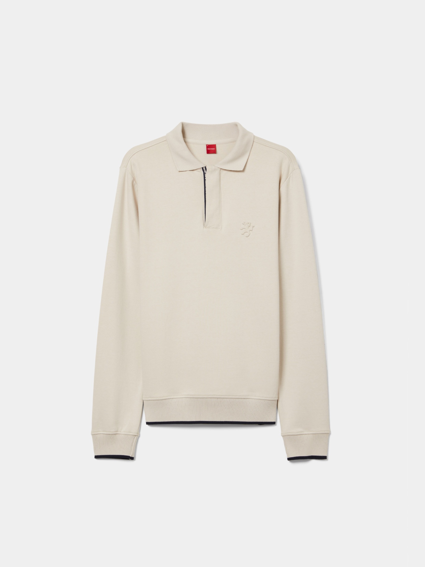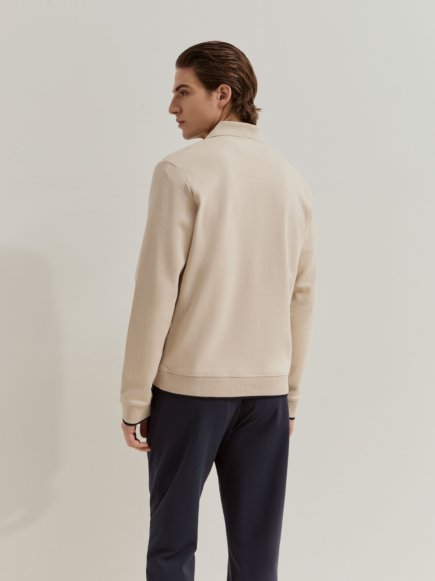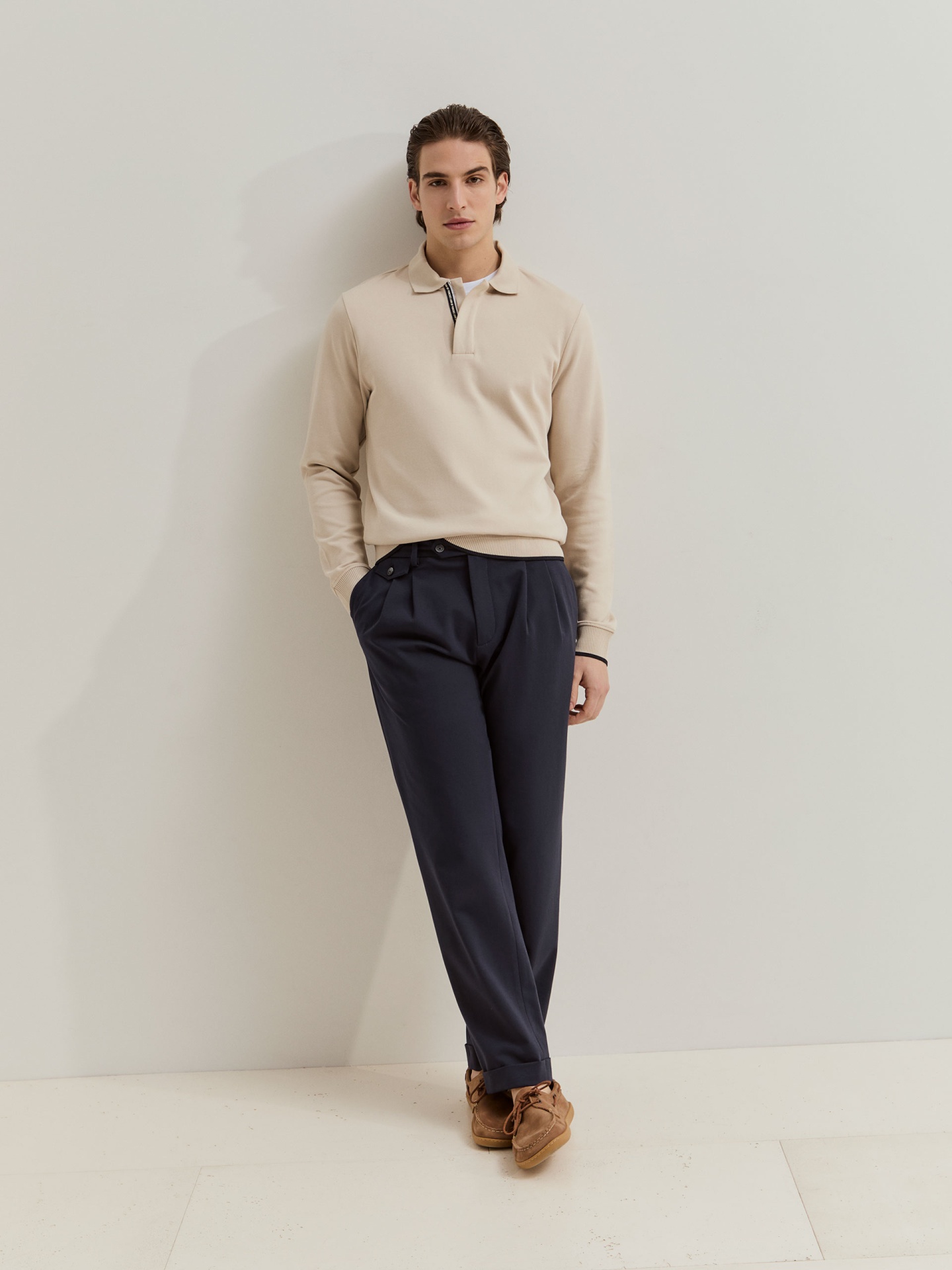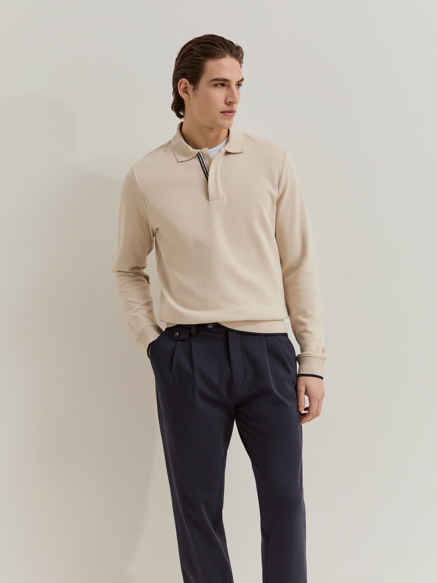 Camisola de malha de manga comprida confecionada em algodão, que garante conforto e suavidade ao longo do dia. Apresenta carcela, punhos e base canelados para um ajuste confortável, com risca em cor contrastante que acrescenta um detalhe moderno e distintivo. Uma peça versátil, ideal para um look casual com um toque cuidado.