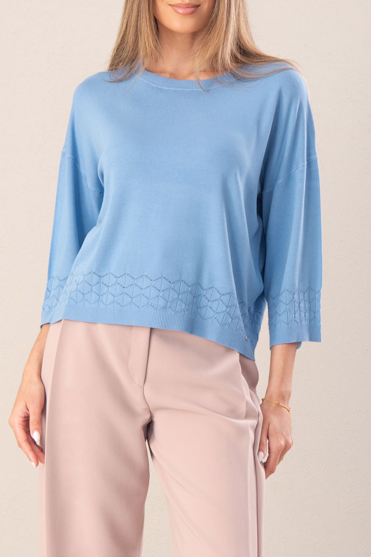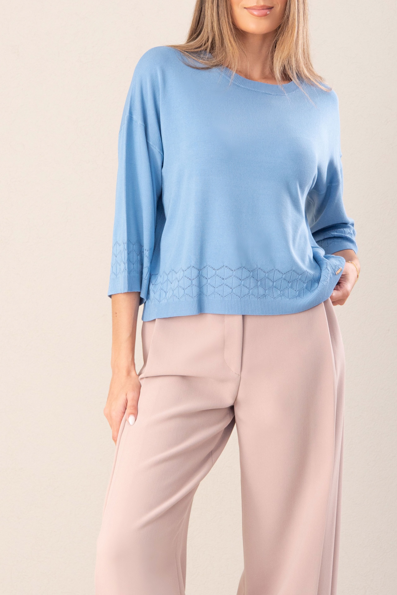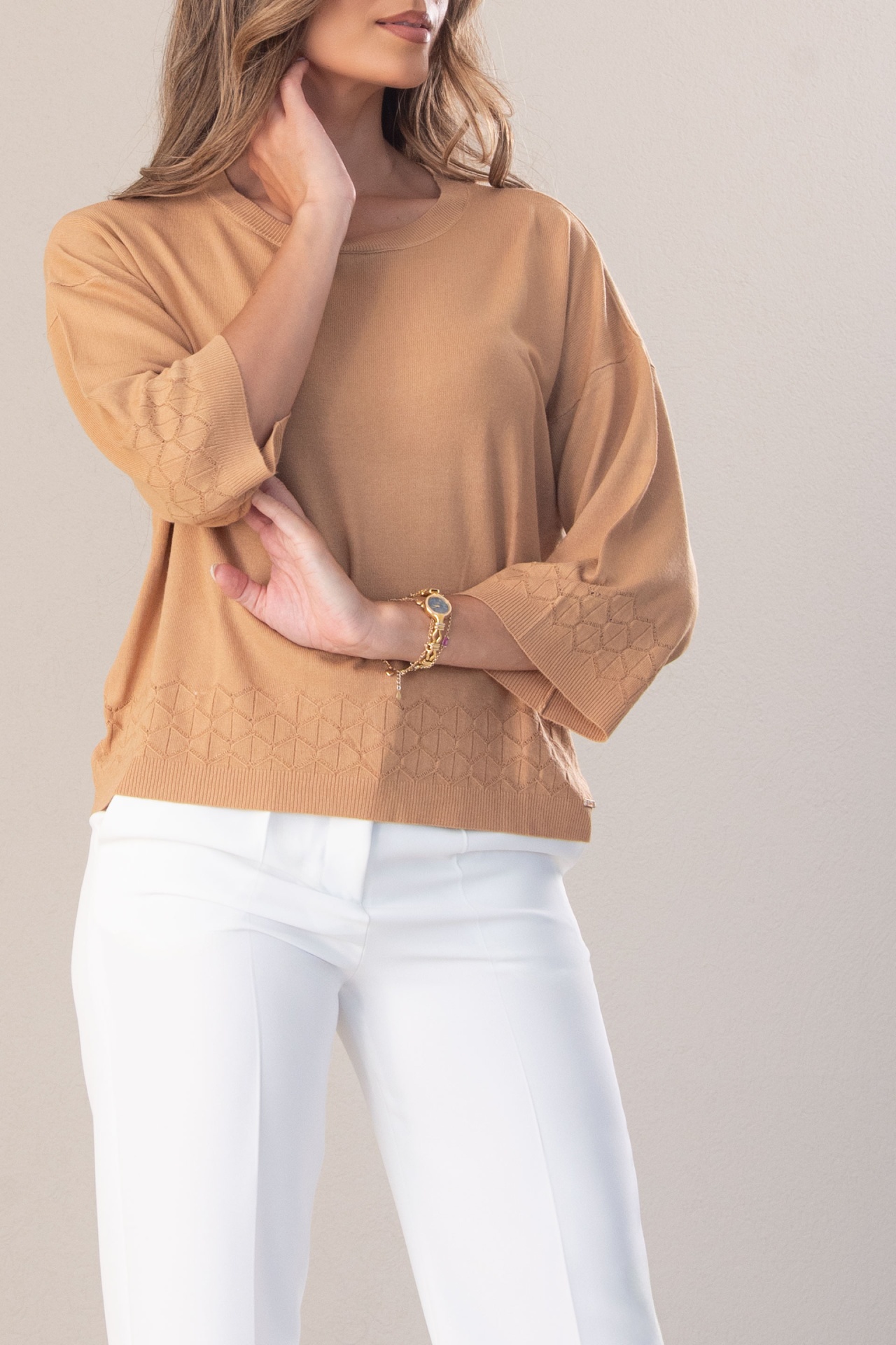 Camisola de malha fluida. Decote redondo. Manga comprida em evasé. Detalhe perfurado na manga e parte inferior, adicionando um toque sofisticado e leve.