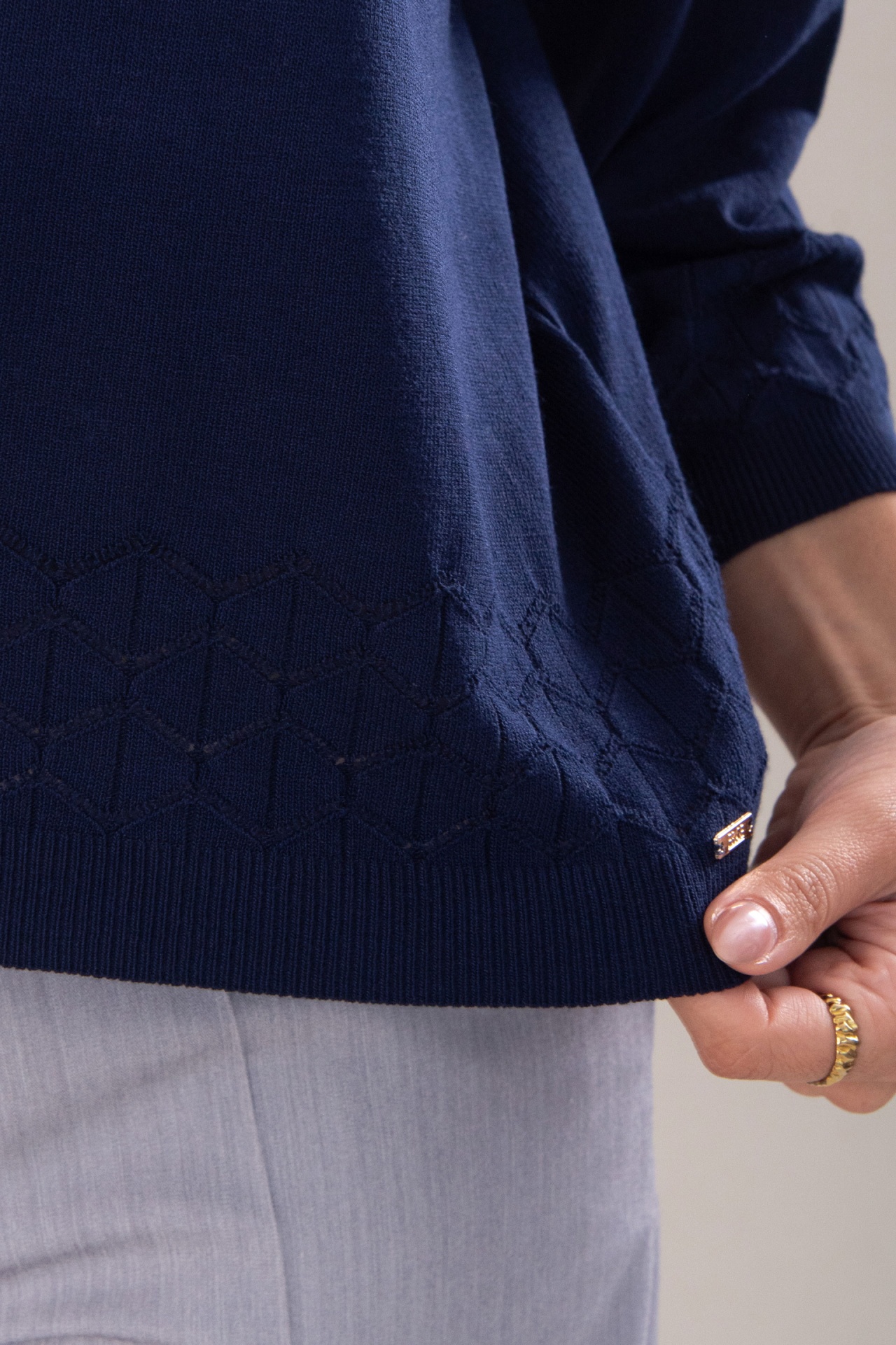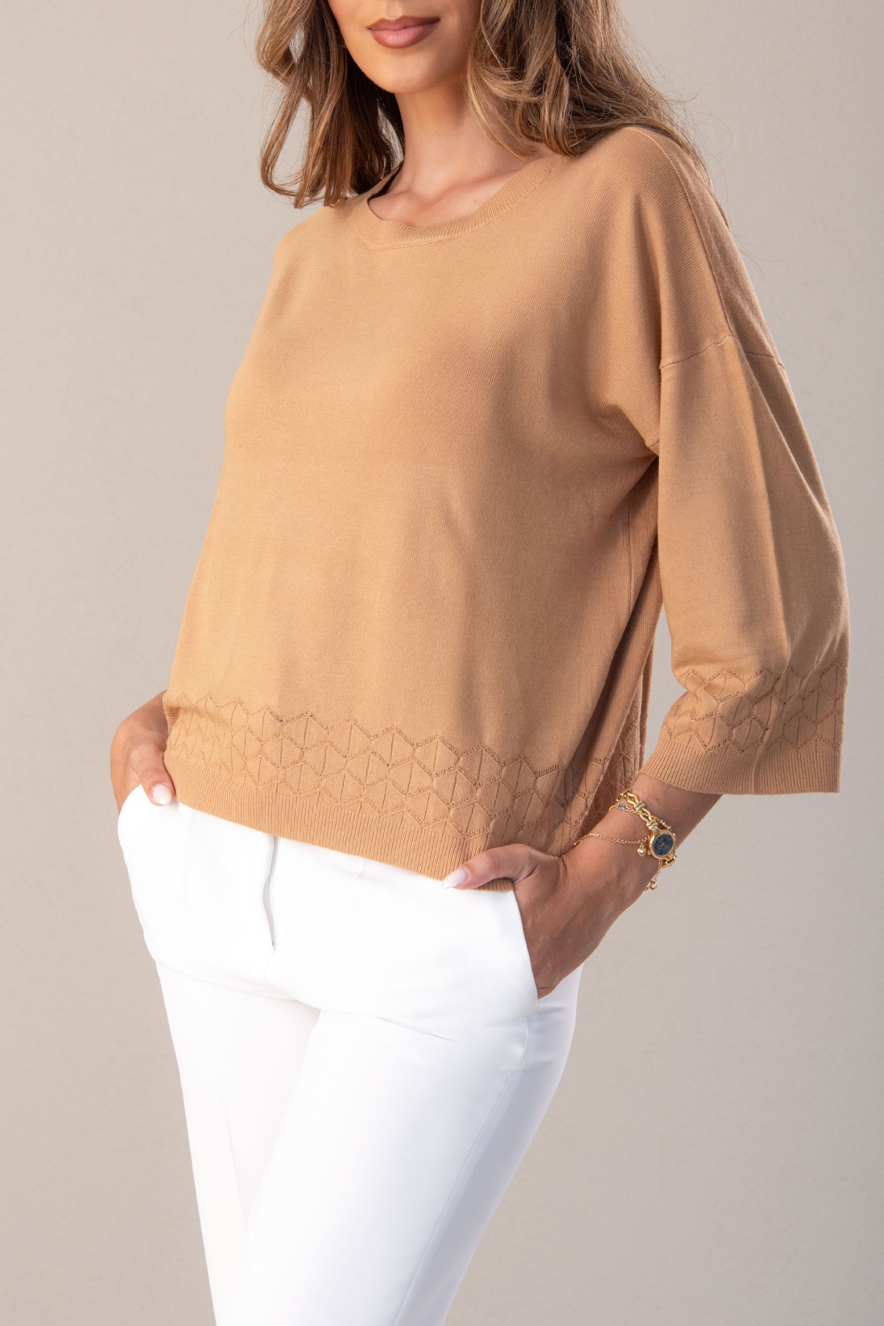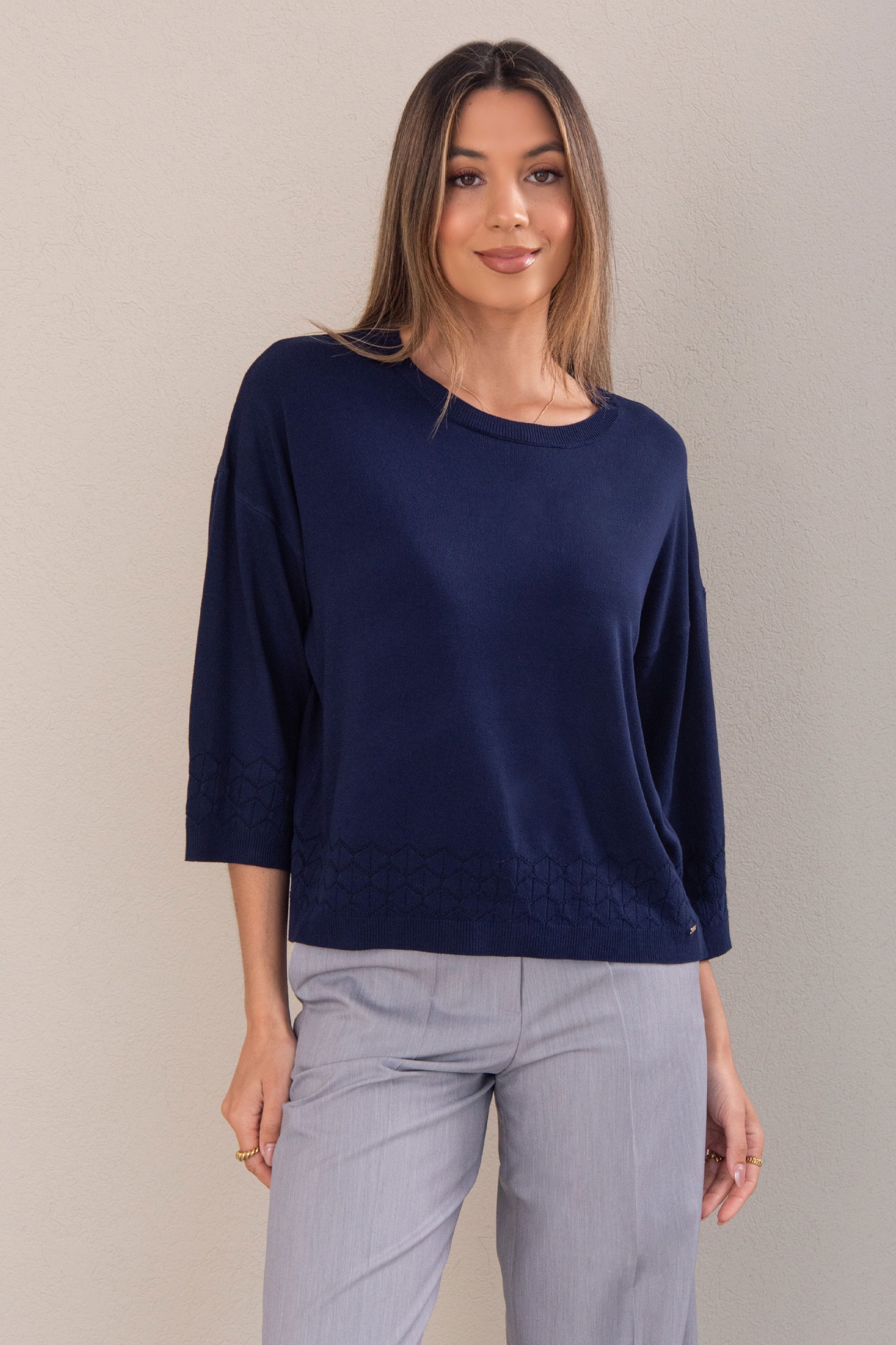 Camisola de malha fluida. Decote redondo. Manga comprida em evasé. Detalhe perfurado na manga e parte inferior, adicionando um toque sofisticado e leve.