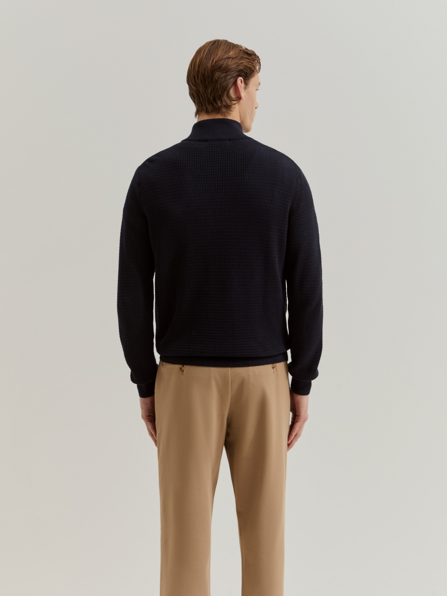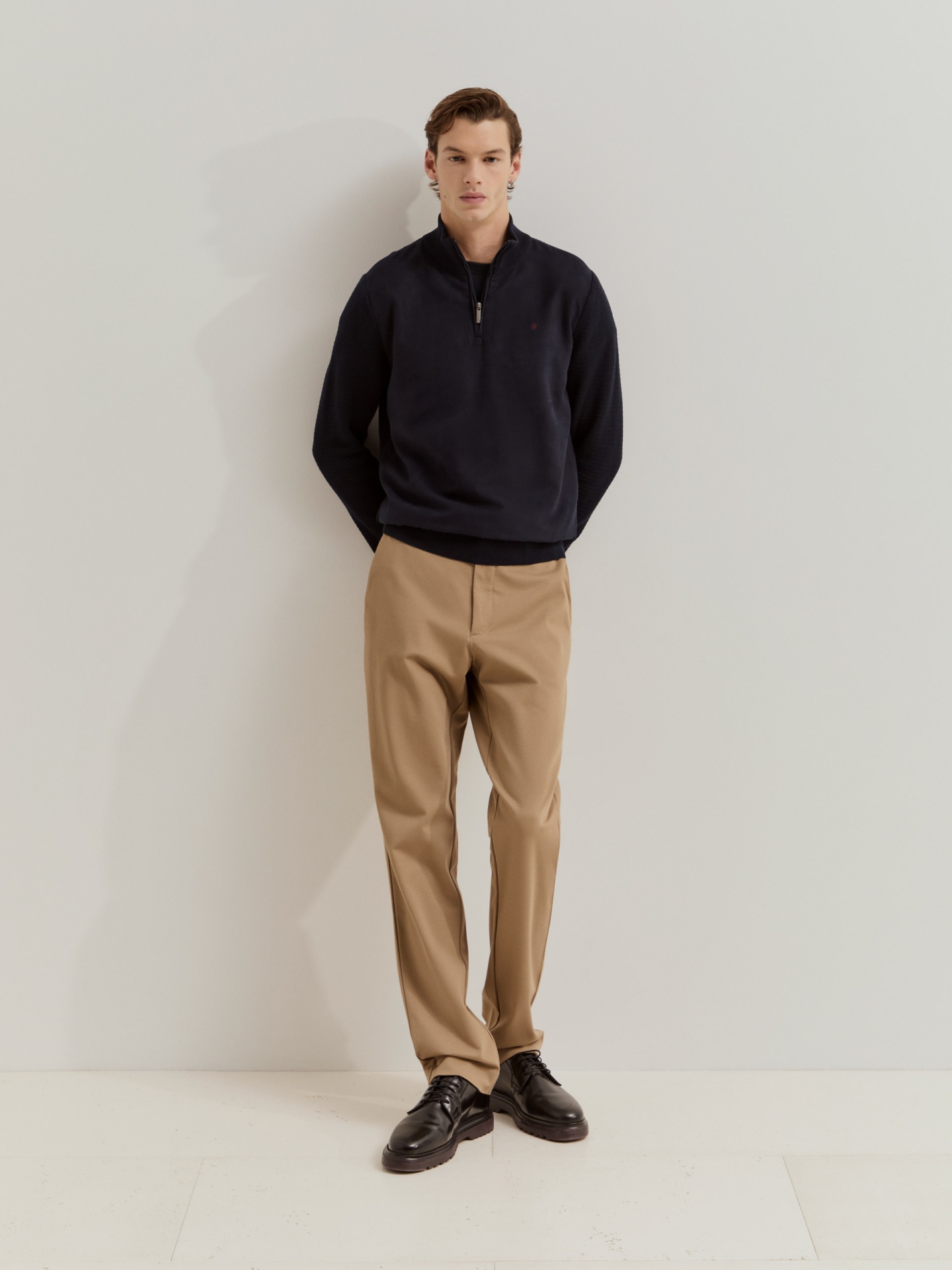Camisola de manga comprida em malha com frente em camurça para um toque distinto. Apresenta bordado do leão em contraste no peito e fecho com puxador personalizado, combinando conforto e elegância num só design.