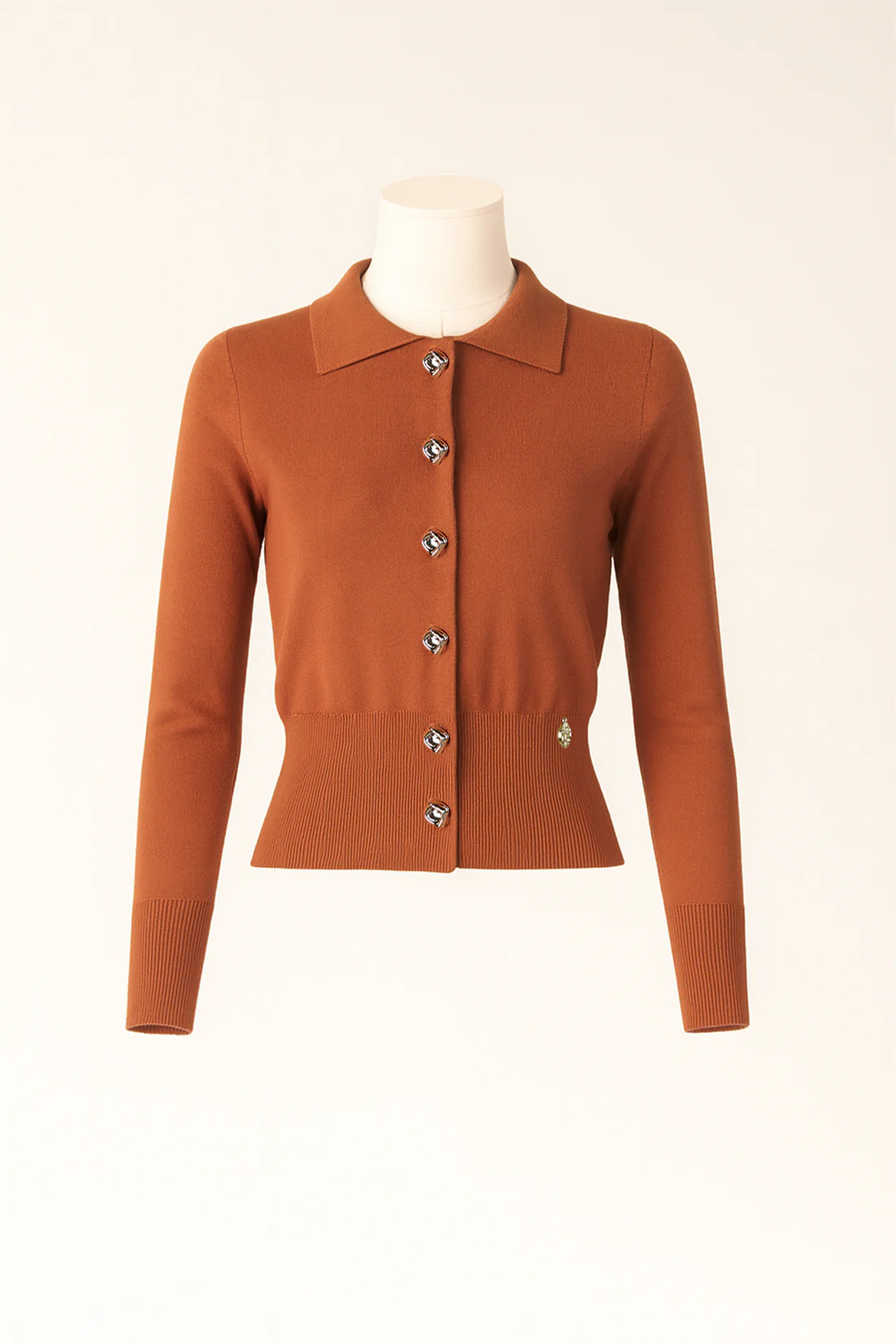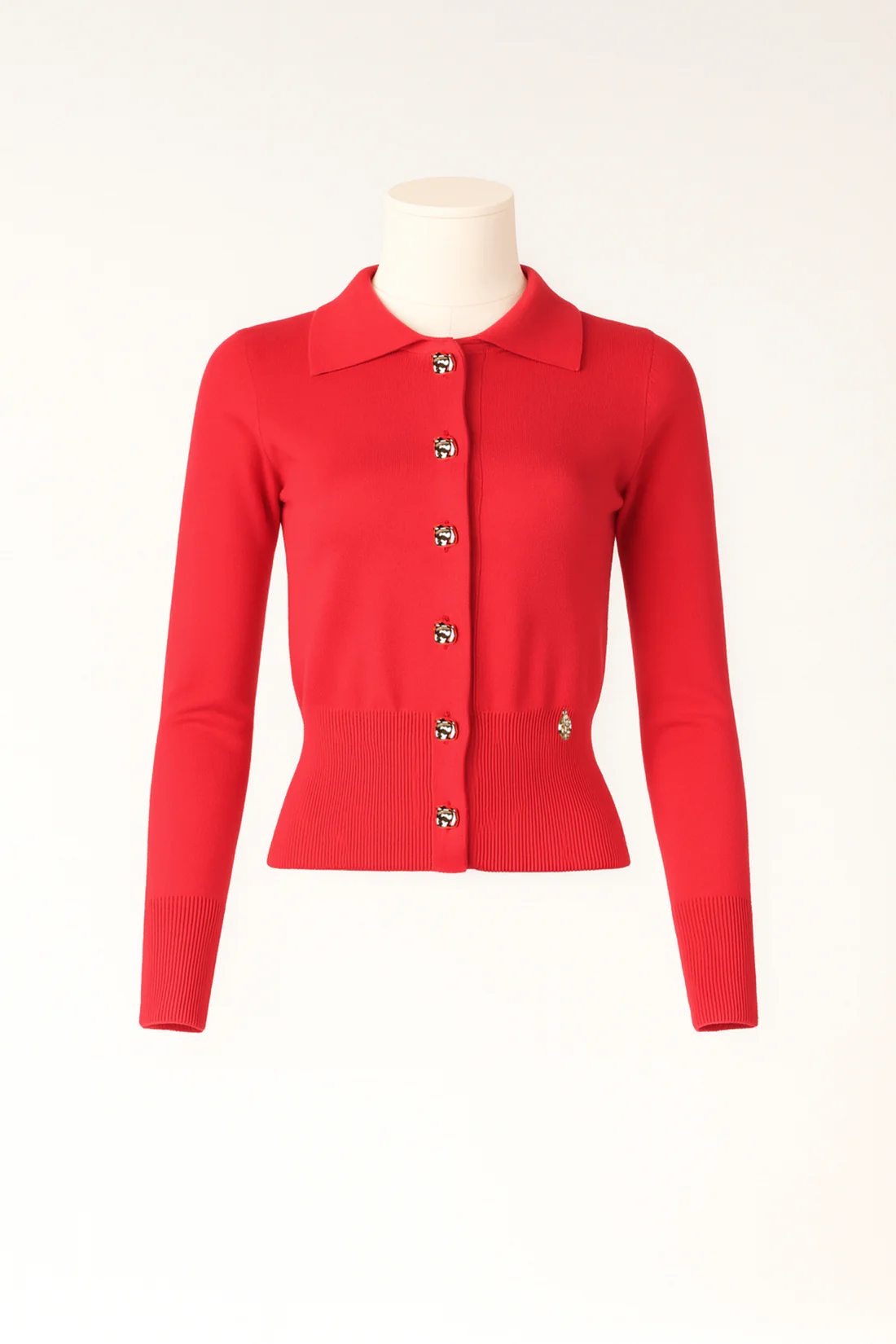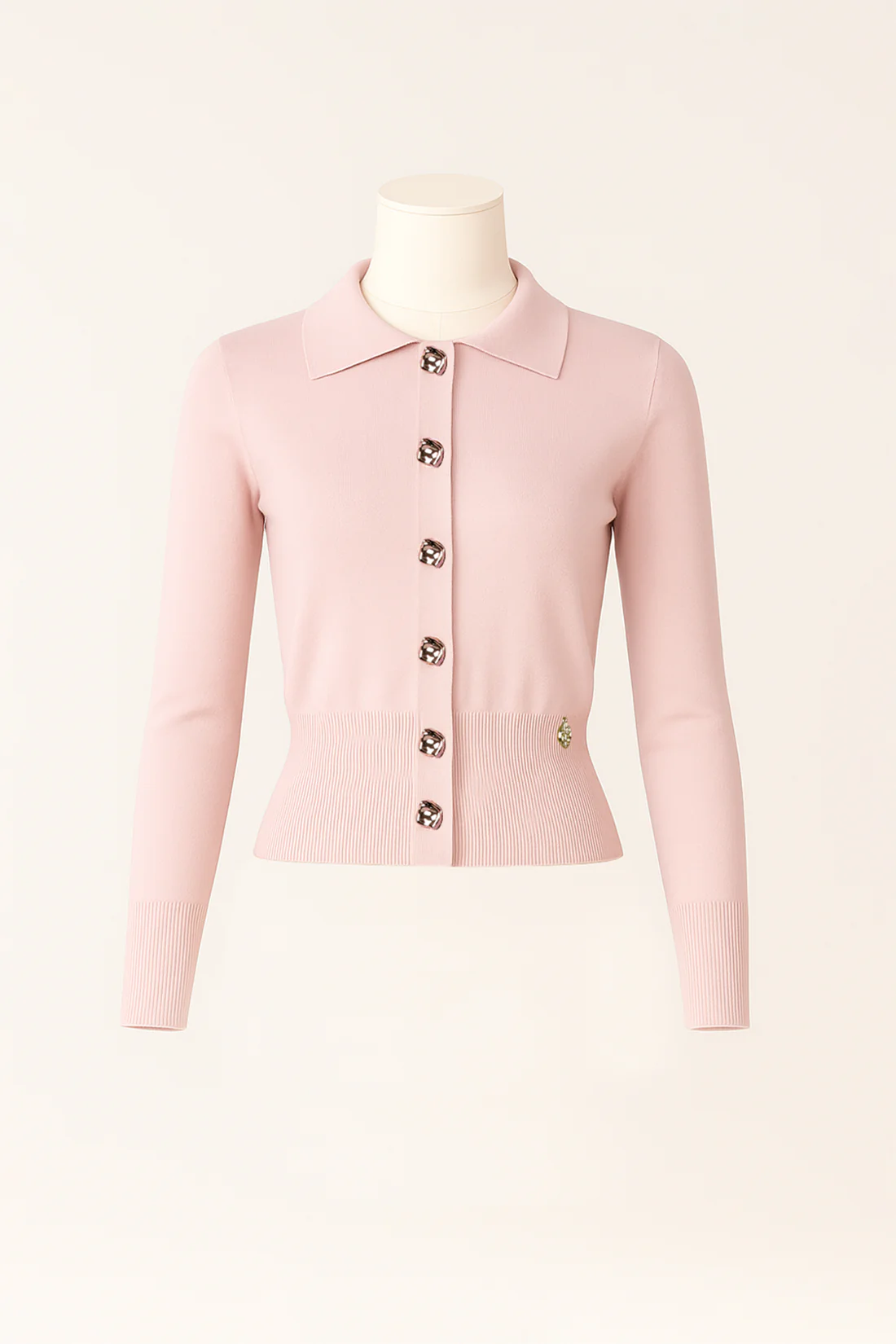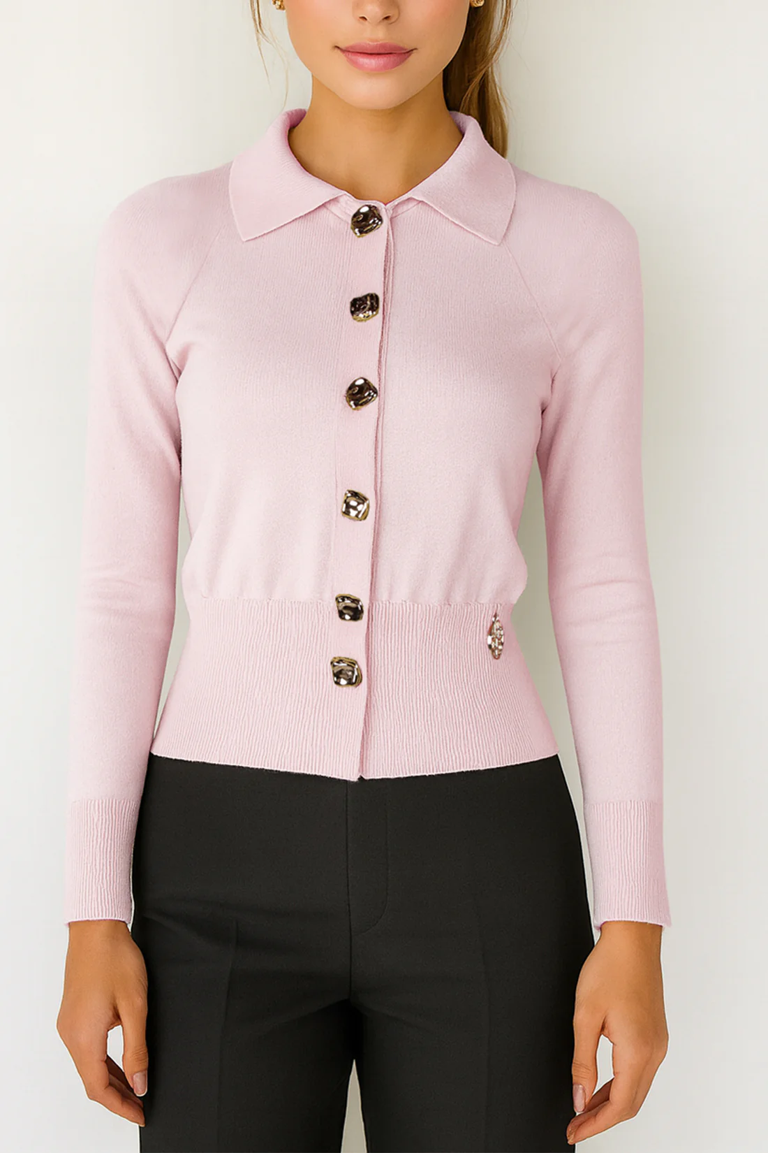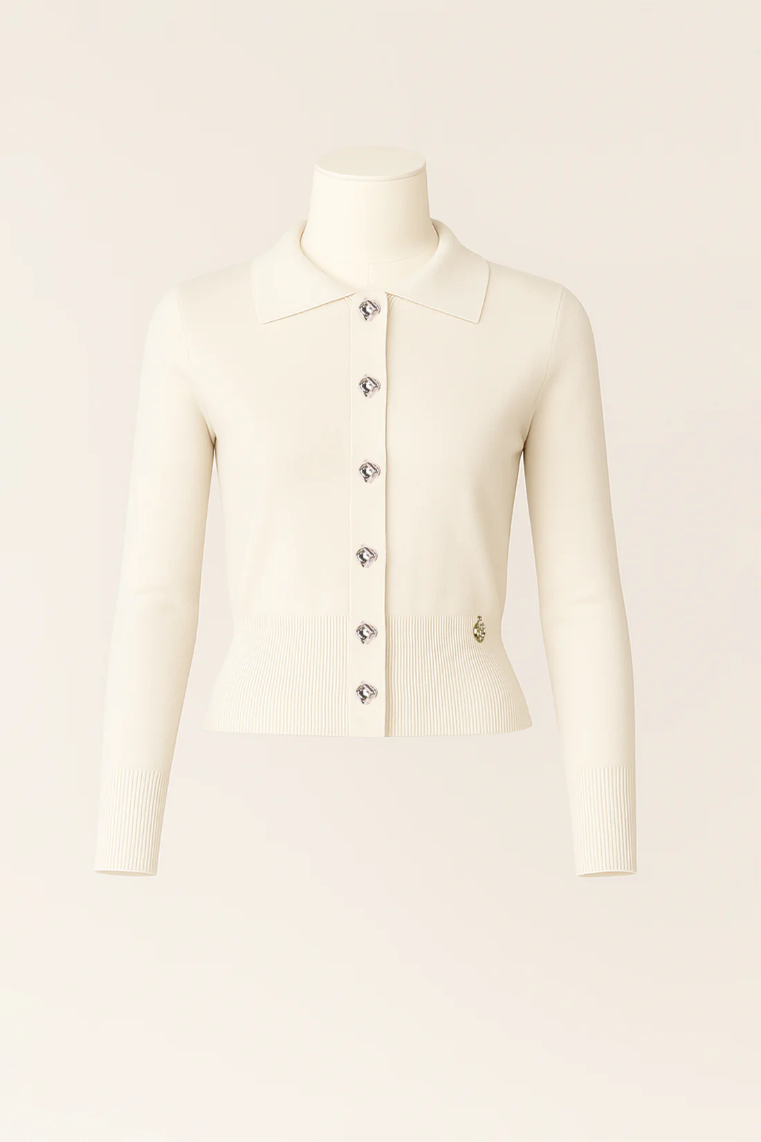 Cardigan em malha fina de toque suave e estrutura compacta. De corte curto e ajustado, apresenta gola clássica e punhos canelados que acentuam a silhueta. Os botões decorativos em tom metálico elevam a simplicidade da peça.