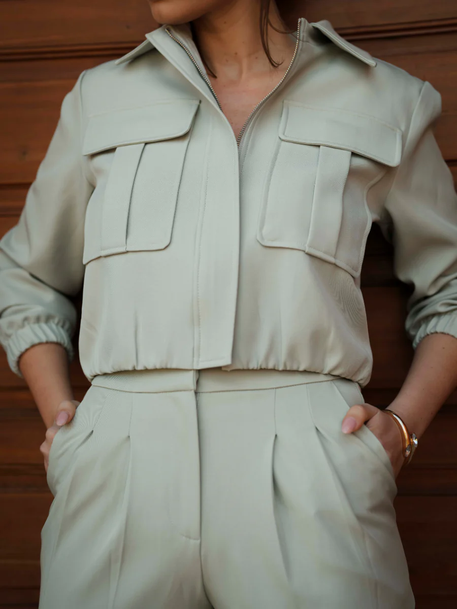 Casaco curto de inspiração utilitária, com design moderno e acabamento sofisticado. O modelo apresenta gola clássica, fecho de correr frontal e bolsos aplicados no peito que reforçam o carácter contemporâneo da peça. A cintura ligeiramente ajustada e os punhos com elástico criam uma silhueta equilibrada, ideal para looks urbanos e coordenados elegantes.