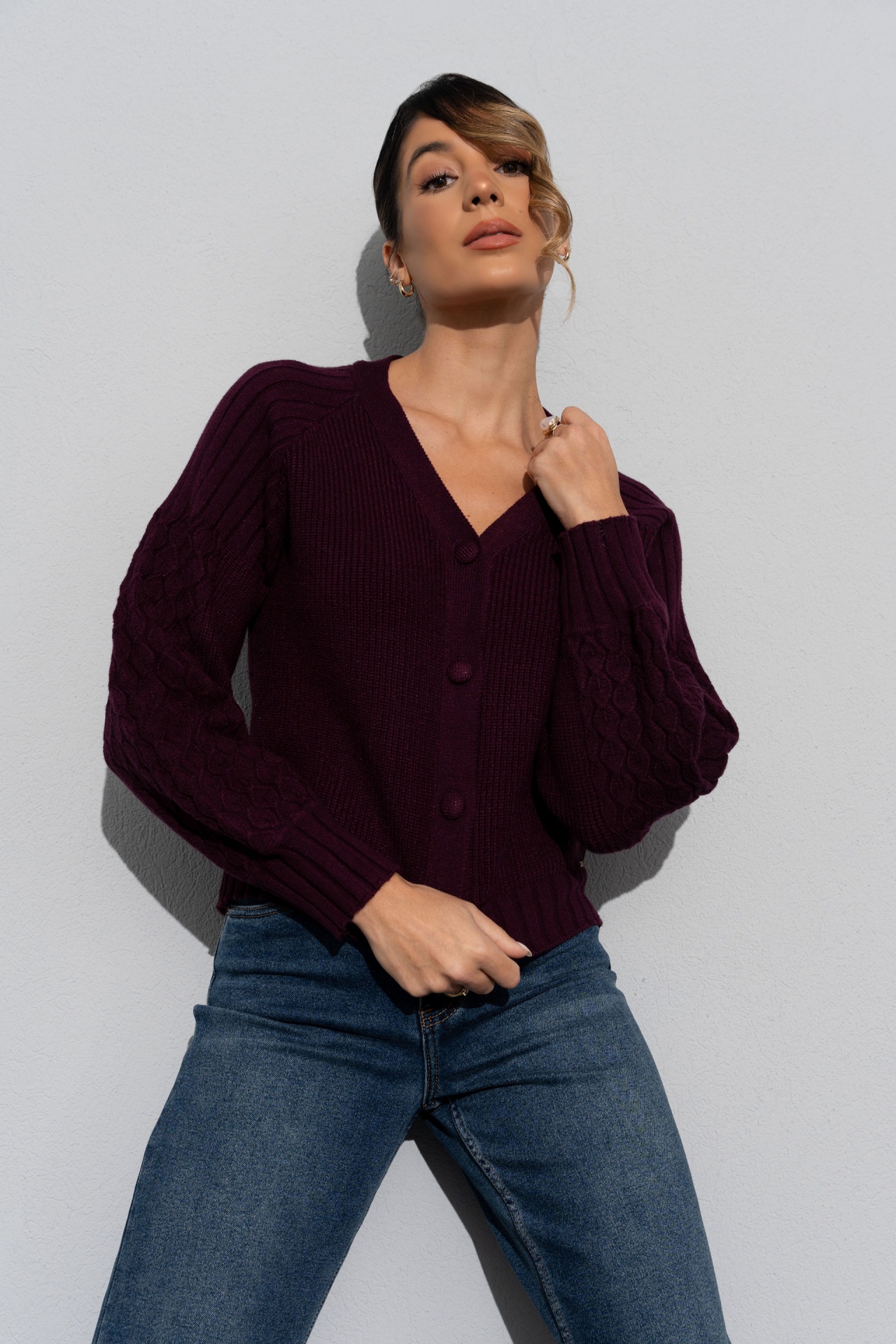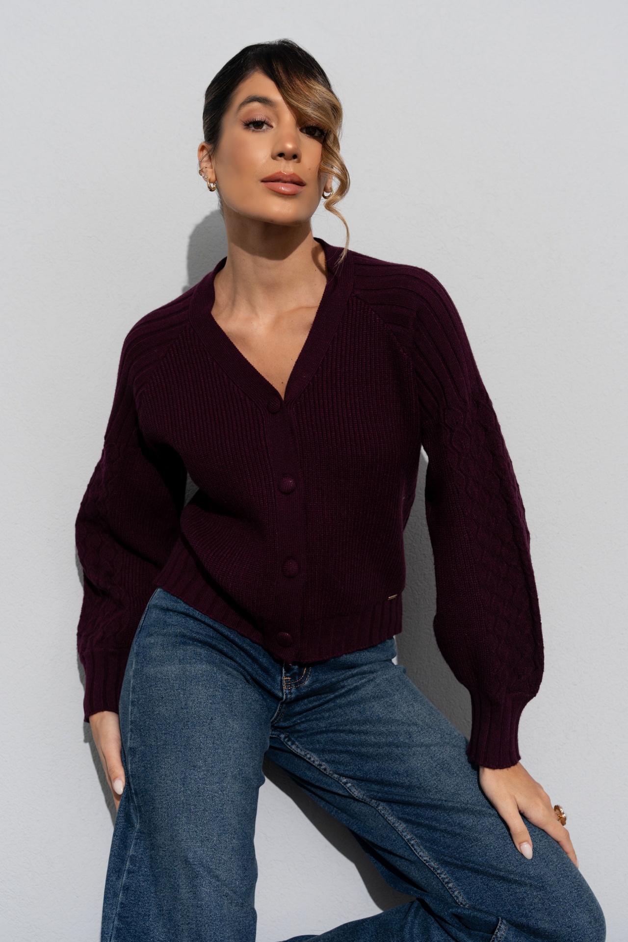 Casaco de malha de manga comprida, confeccionado em malha canelada com detalhe em ponto trabalhado nas mangas. Modelo de corte curto, decote em “V” e fecho frontal com botões forrados. Acabamentos canelados nos punhos e na bainha, conferindo estrutura e conforto à peça.
