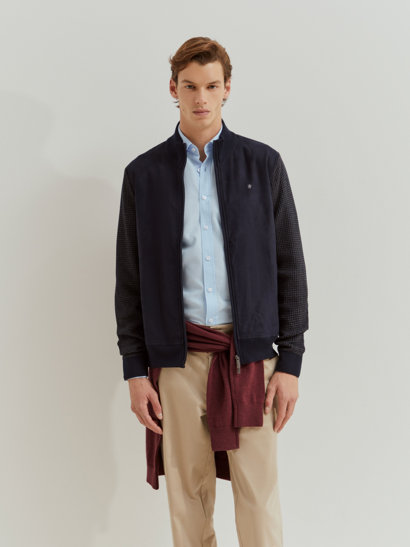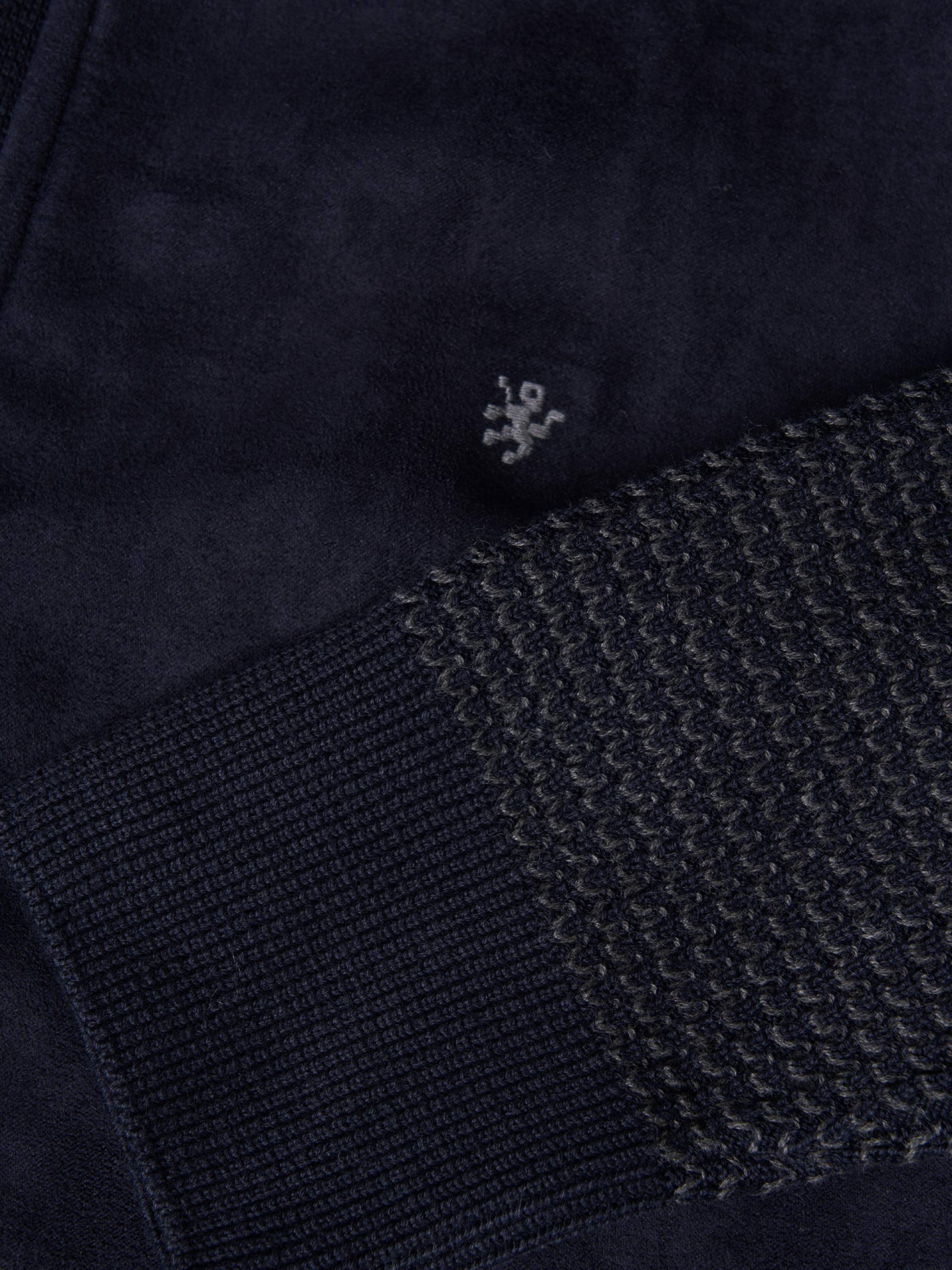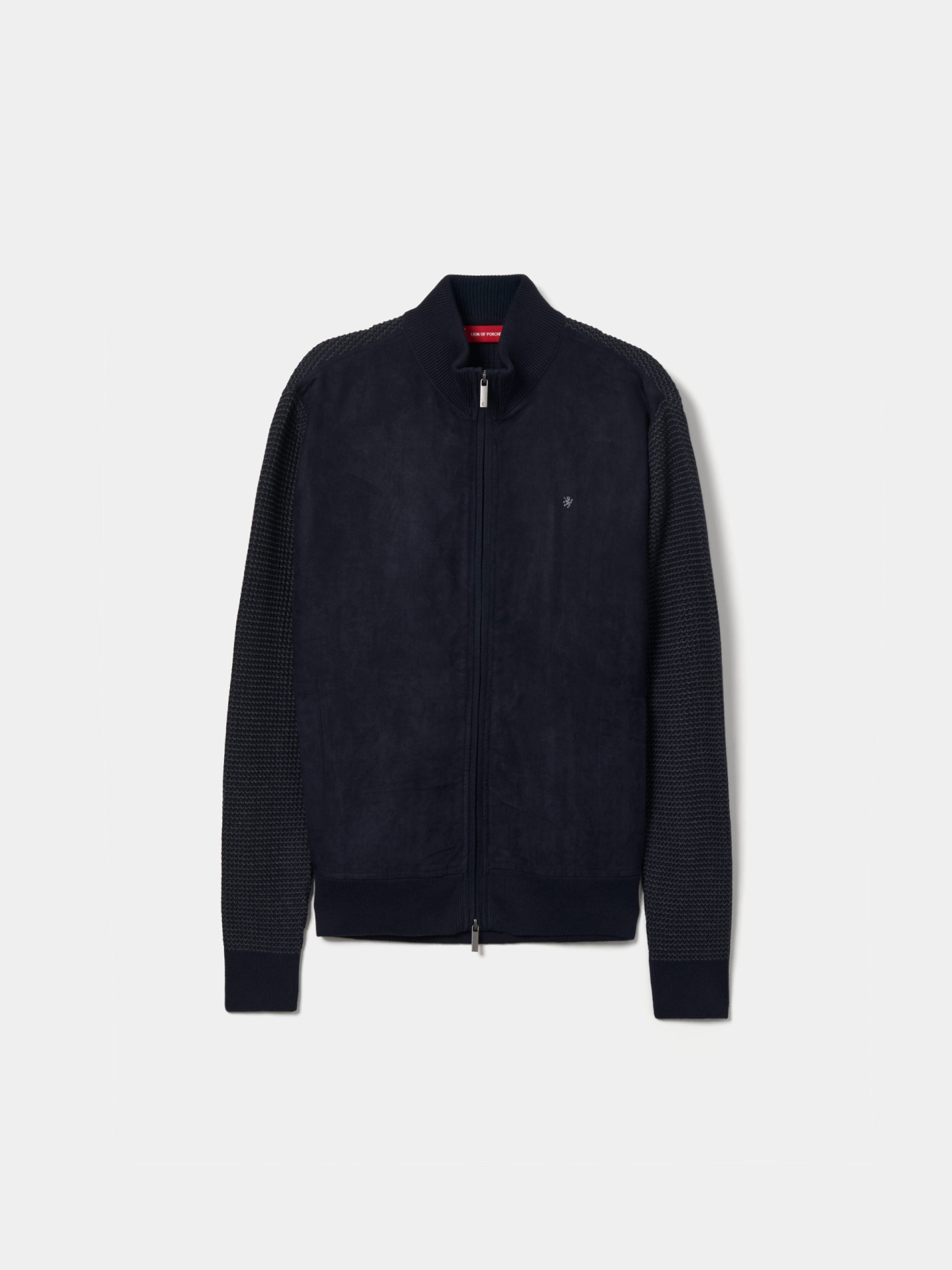 Casaco de manga comprida em malha com frente em camurça para um toque distinto. Aperta à frente com fecho de correr. Apresenta bordado do leão em contraste no peito e fecho com puxador personalizado, combinando conforto e elegância num só design.