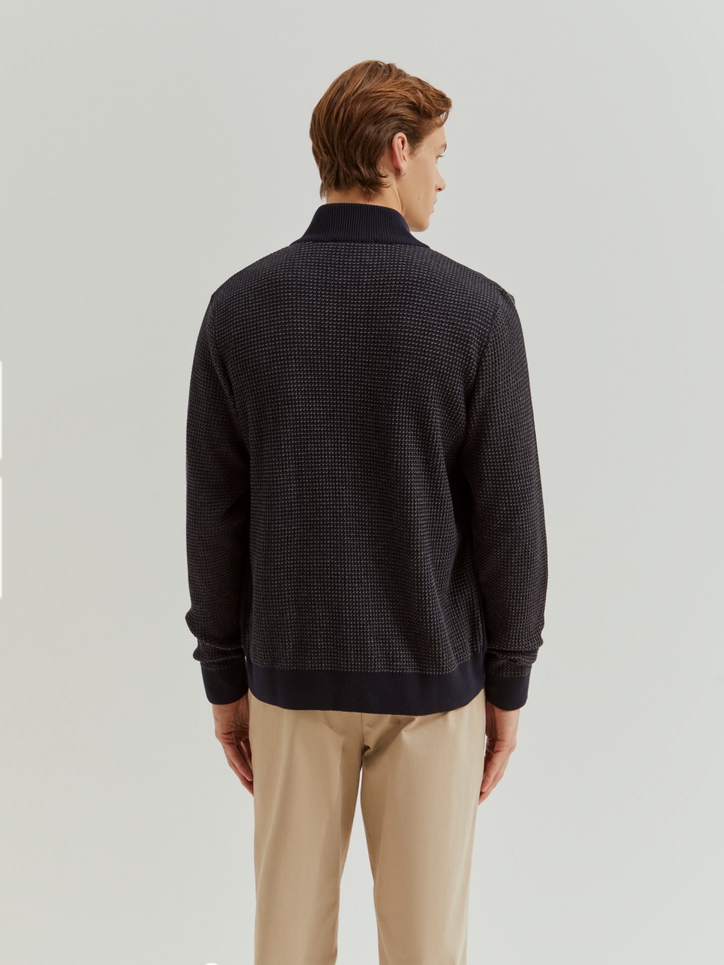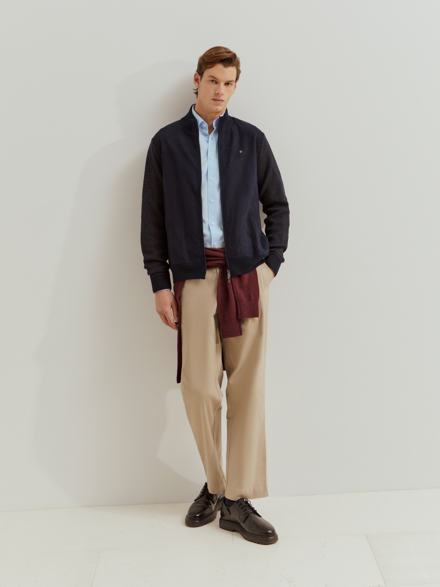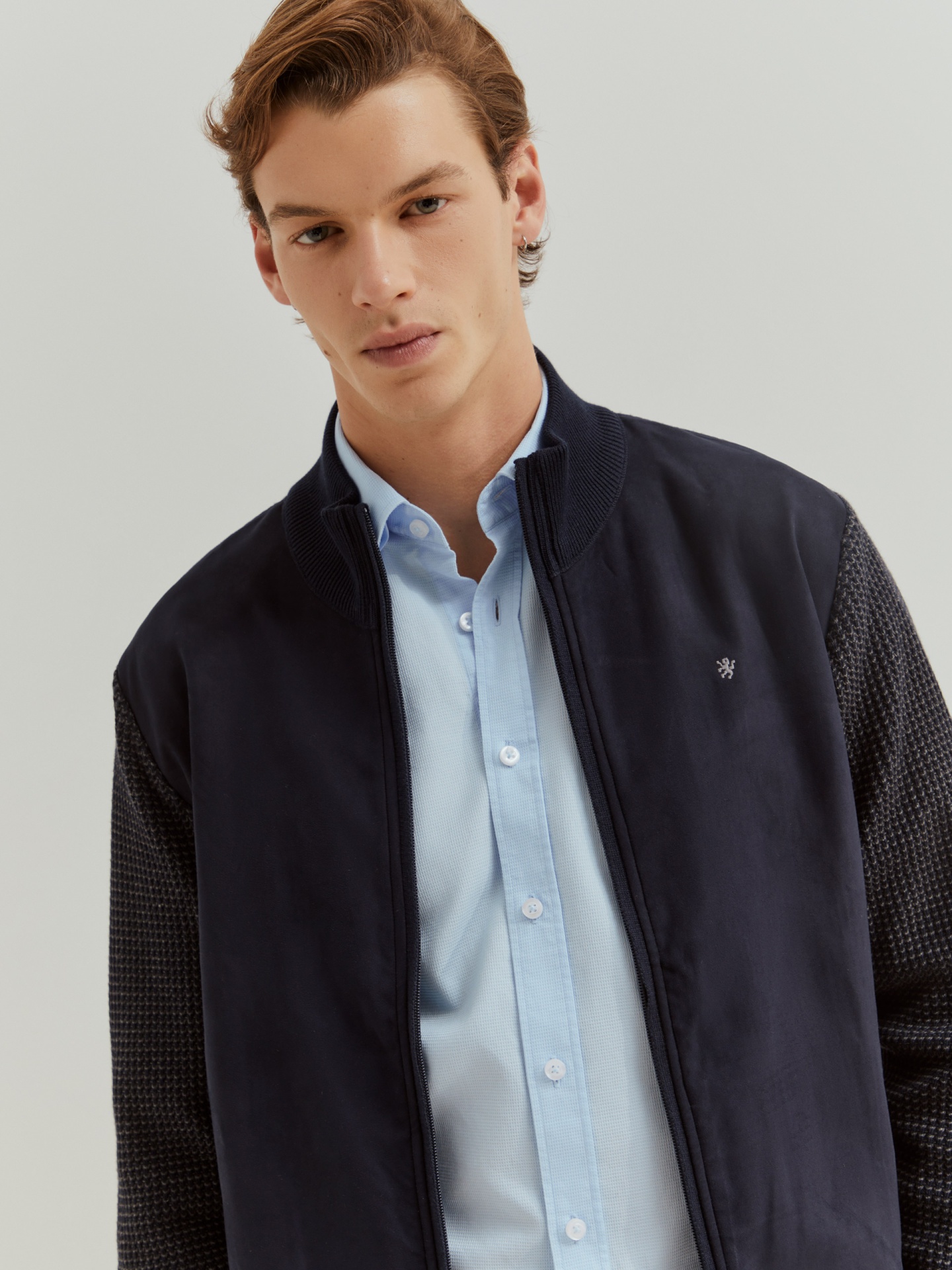 Casaco de manga comprida em malha com frente em camurça para um toque distinto. Aperta à frente com fecho de correr. Apresenta bordado do leão em contraste no peito e fecho com puxador personalizado, combinando conforto e elegância num só design.