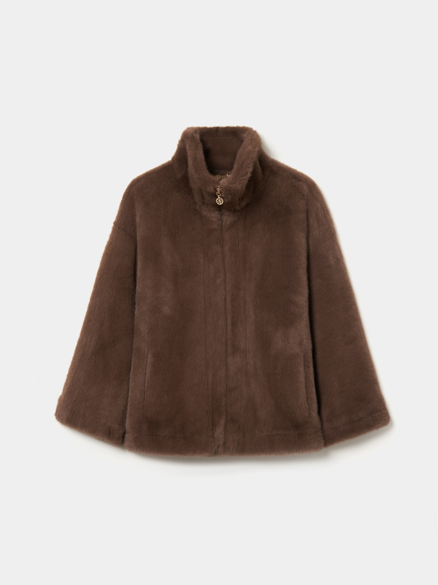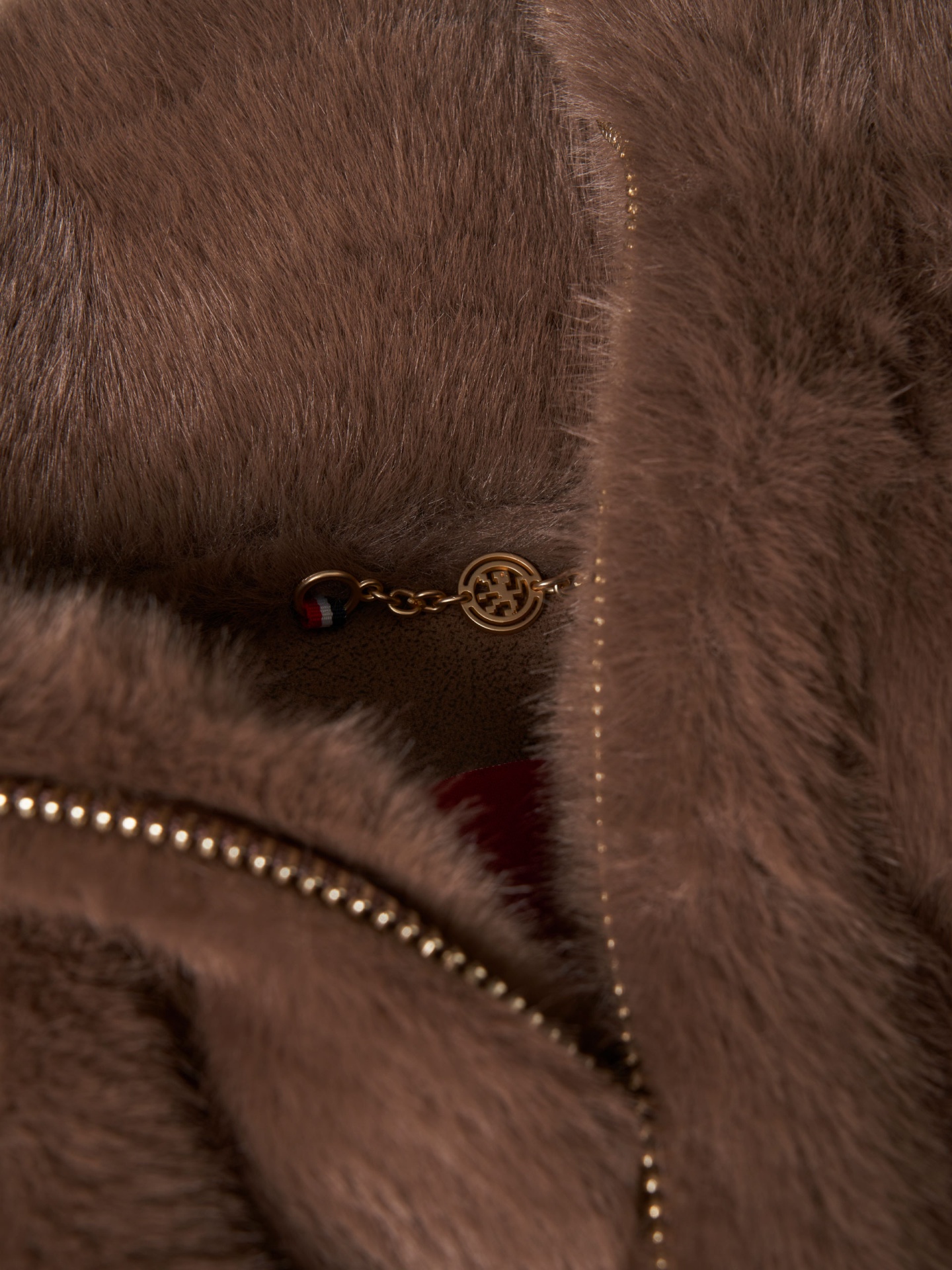 Este casaco de pelo sintético destaca-se pelas mangas raglan, que conferem um corte descontraído e elegante. O fecho zipper frontal é realçado com o detalhe exclusivo do leão da marca, tornando-o uma peça distinta e sofisticada.