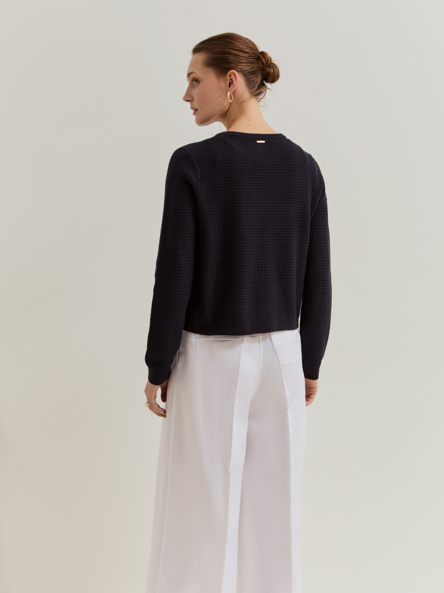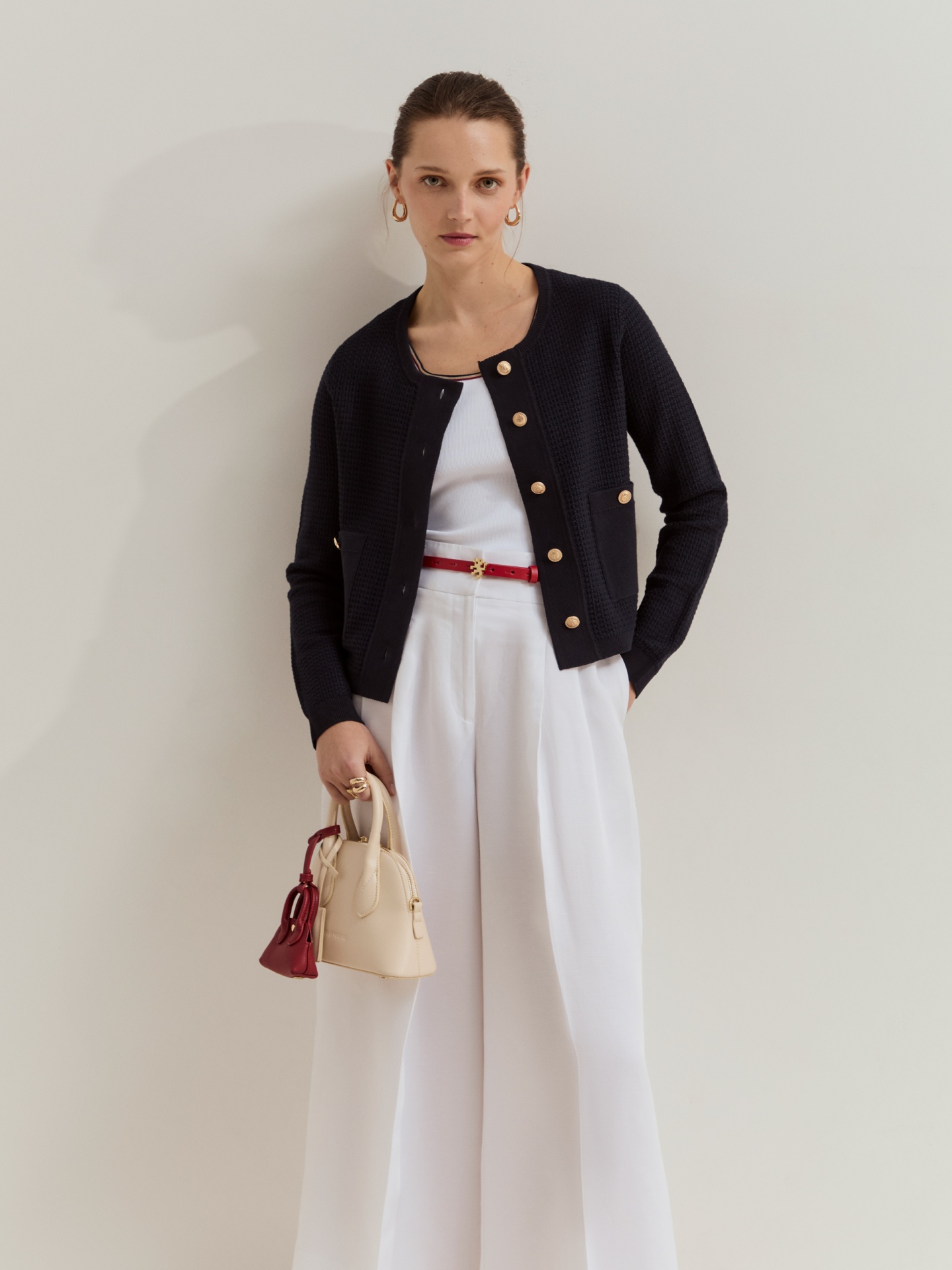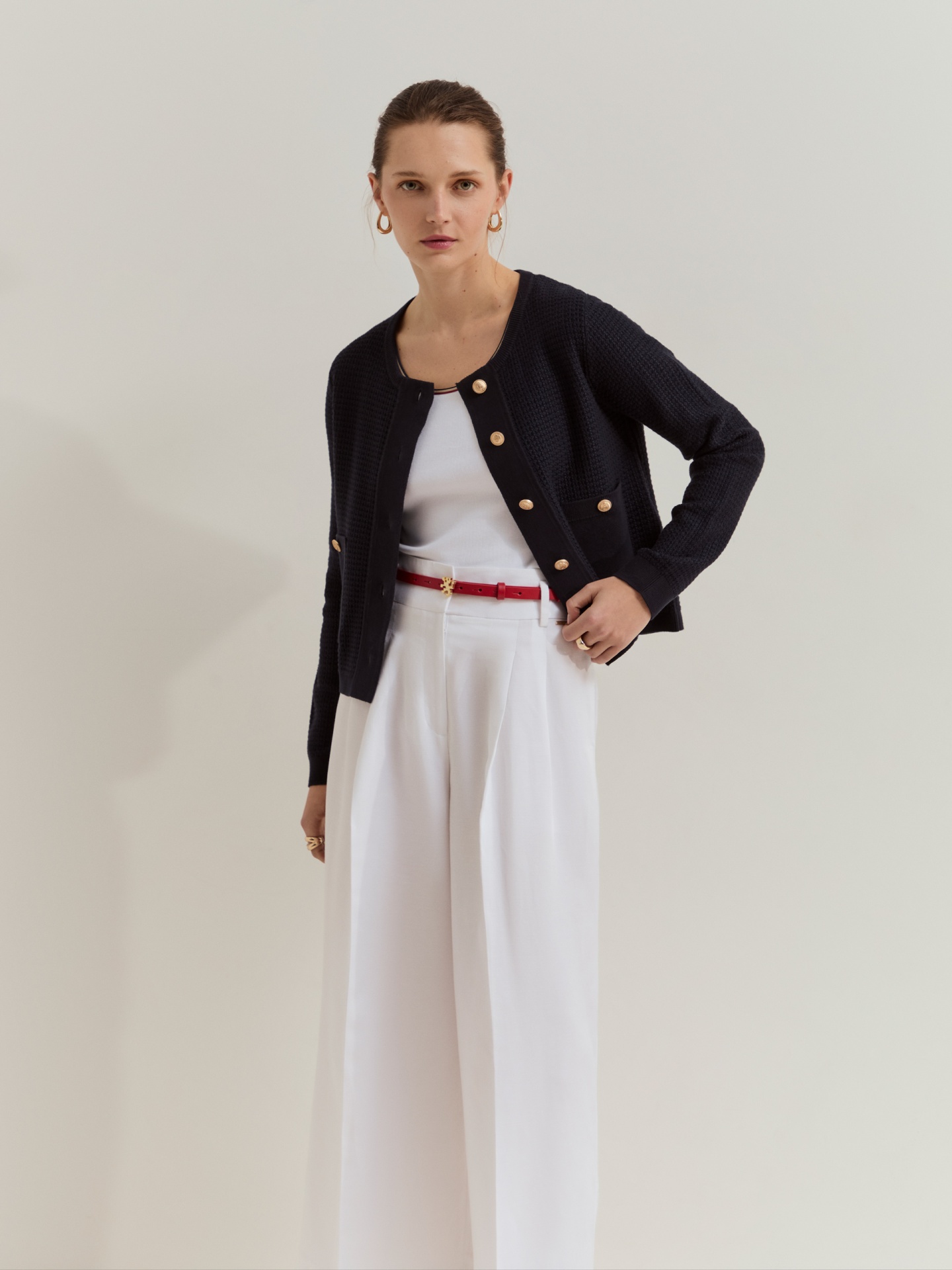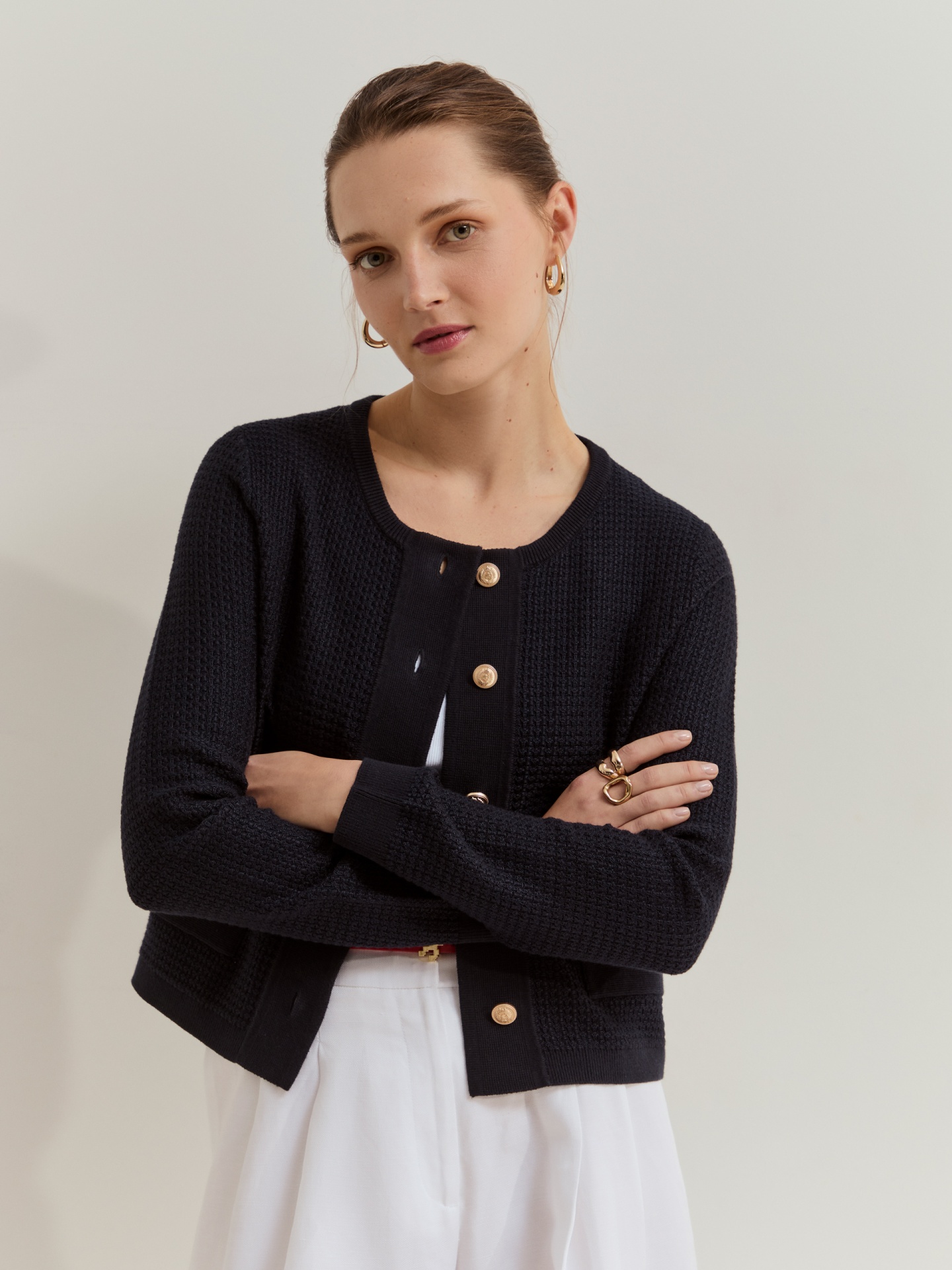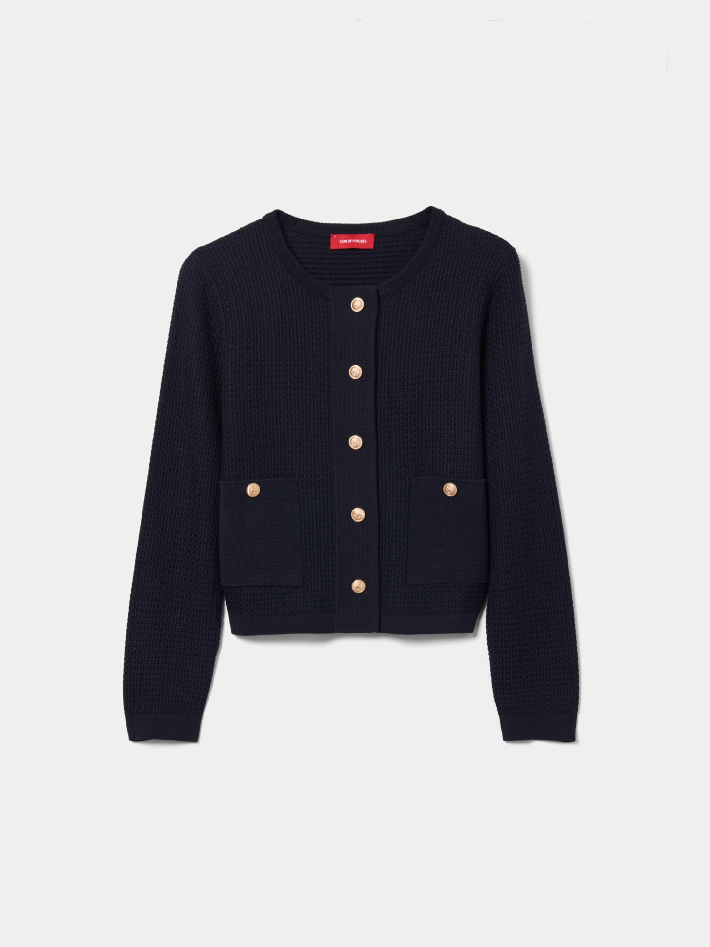 Casaco estilo cardigan em malha tricotada, pensado para oferecer conforto e sofisticação. Apresenta bolsos frontais e botões de brasão dourados mate na frente e nos bolsos, acrescentando um detalhe distintivo e elegante ao design. Uma peça versátil e intemporal, ideal para completar looks casuais ou coordenados mais sofisticados.
