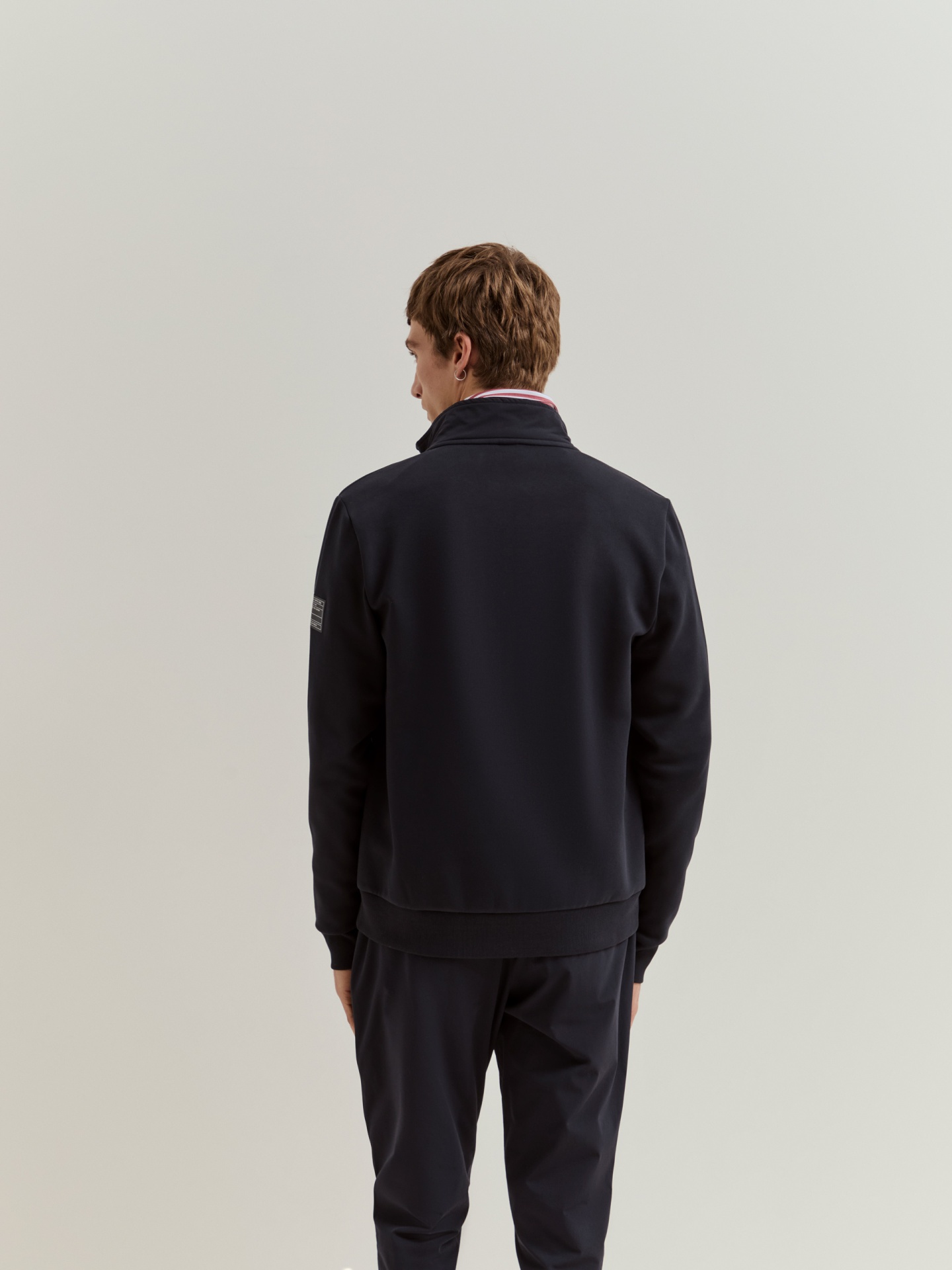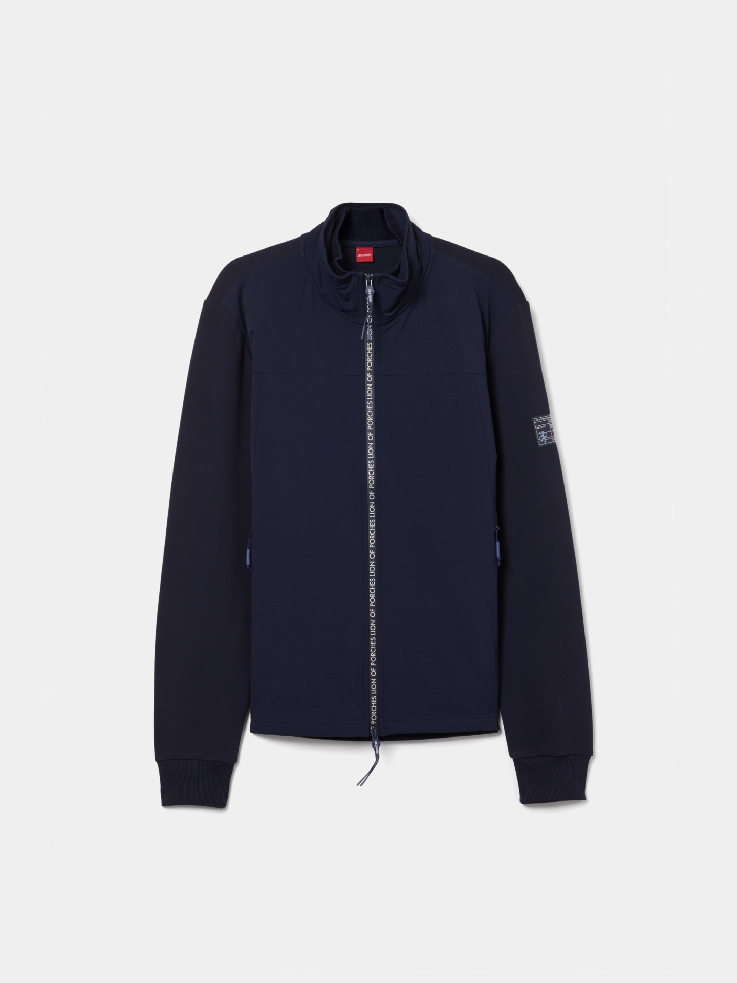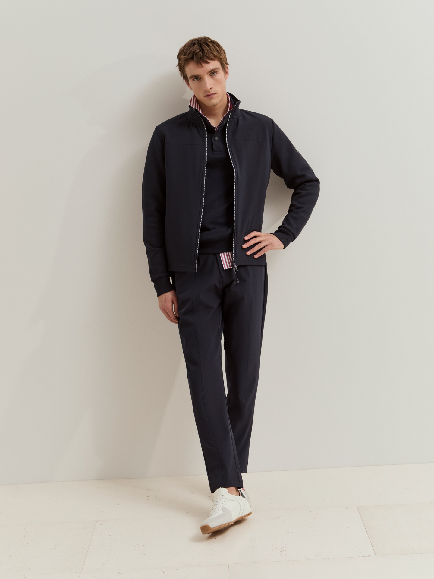 Casaco em mistura de algodão com um toque de elastano para maior conforto e liberdade de movimentos. Aperta à frente com fecho de correr com puxador em borracha. Apresenta gola subida, um emblema da marca a contrastar na manga, dois bolsos laterais com fecho de correr e acabamentos em punho elástico para um ajuste estruturado. Uma peça prática e versátil, ideal para um visual casual e moderno.