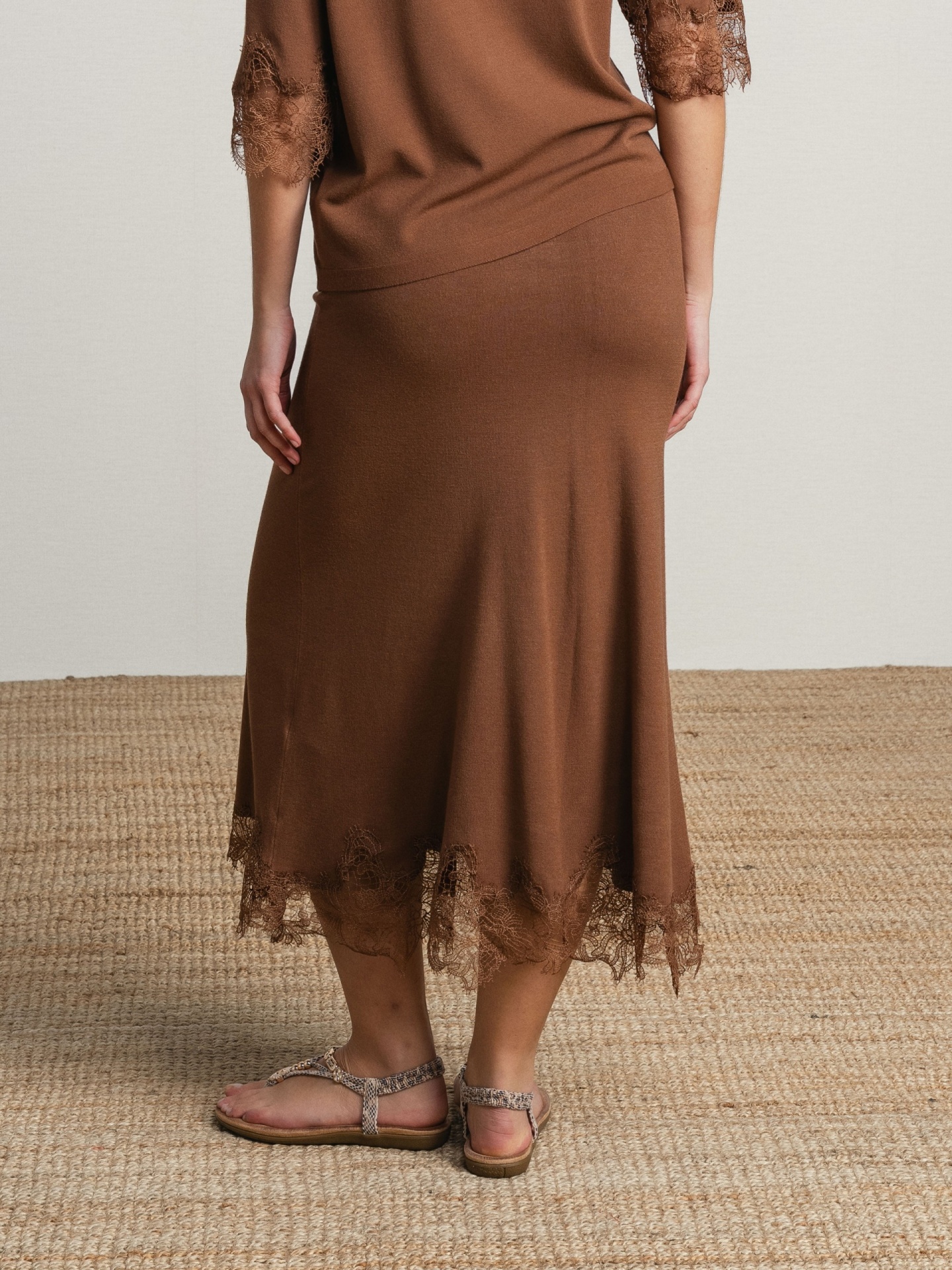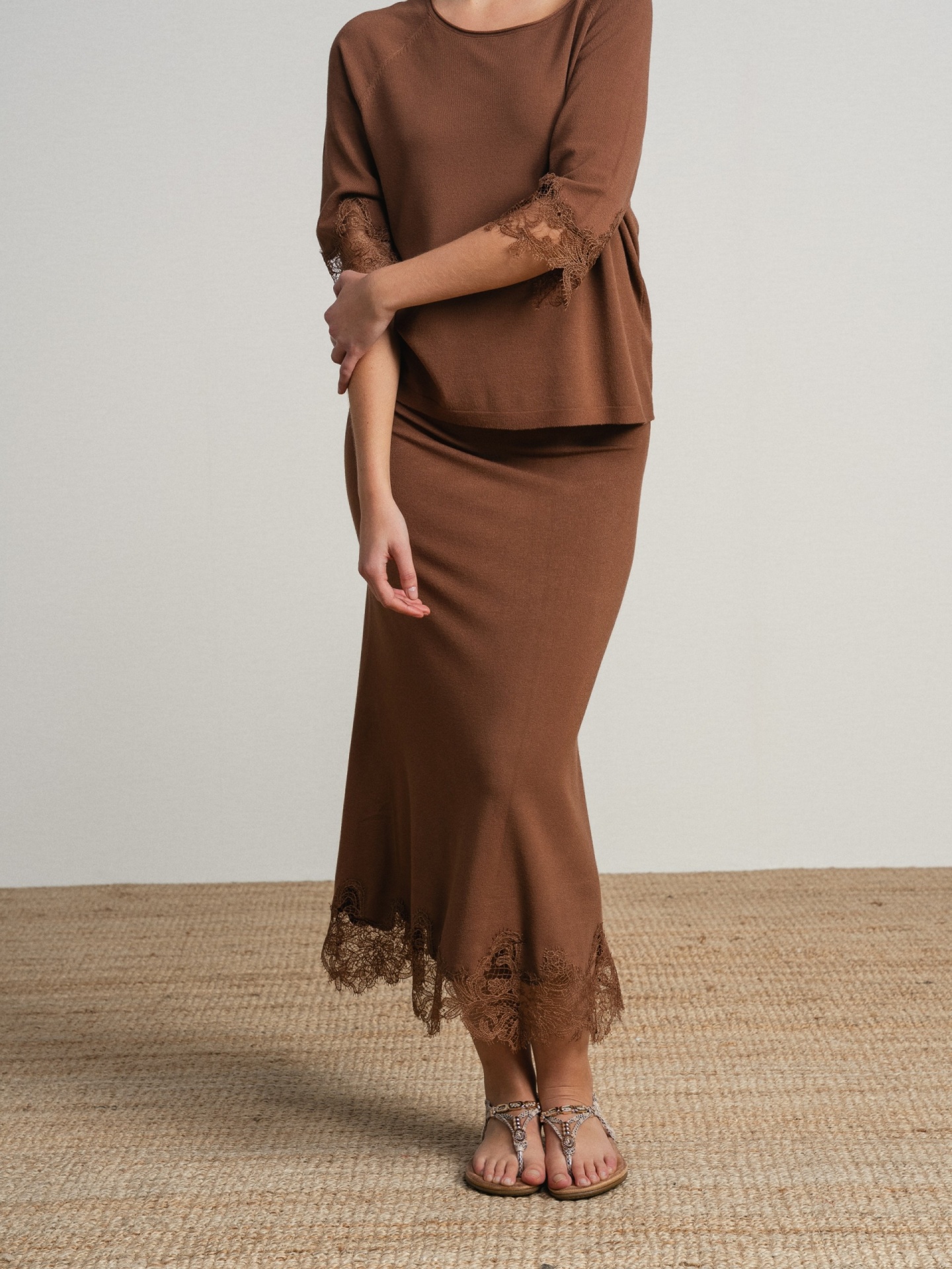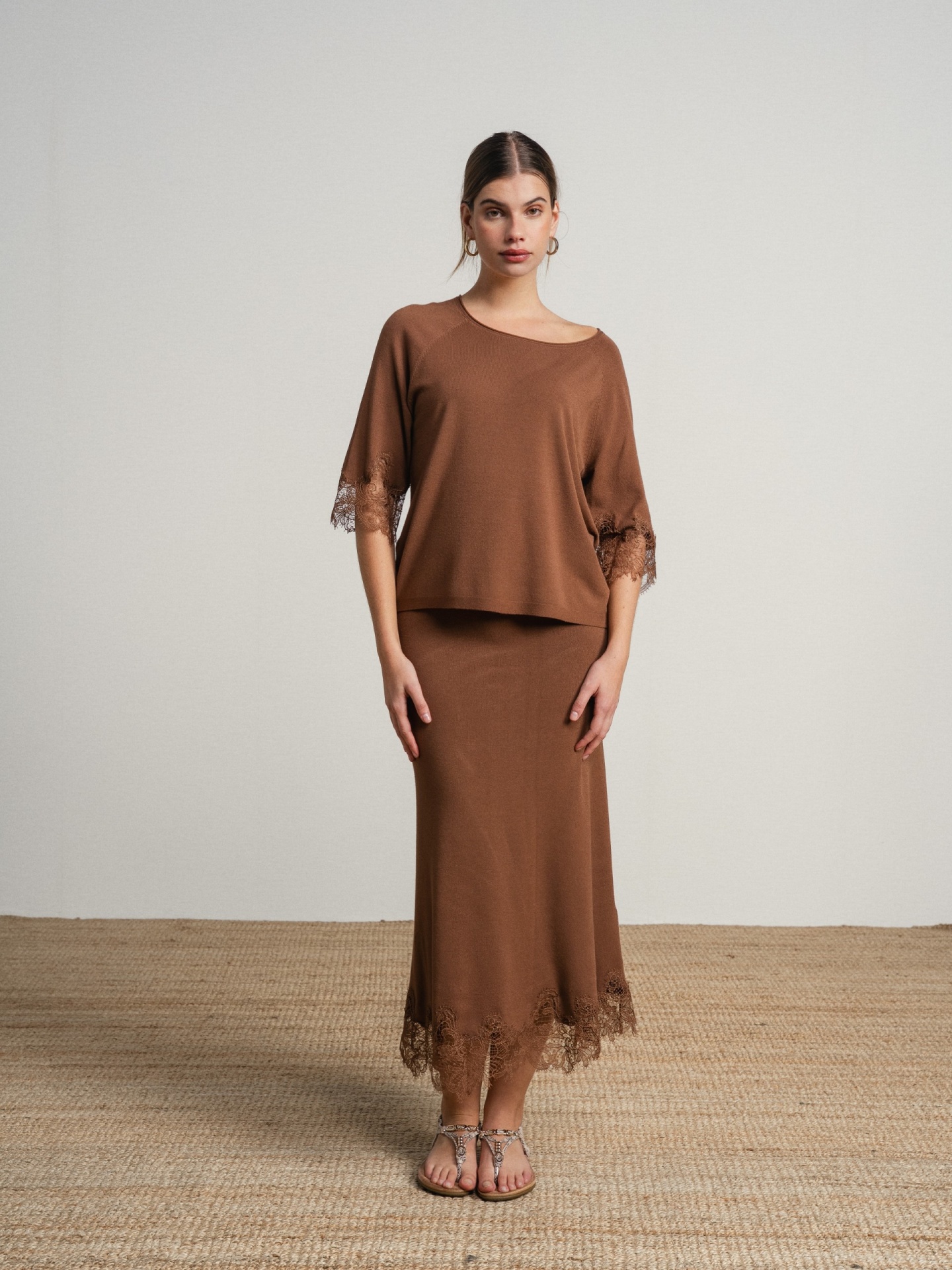 Conjunto de duas peças em tecido leve com acabamento suave. Top de corte solto com decote assimétrico e manga curta com aplicação de renda. Saia midi de corte ajustado com detalhe rendado na base.