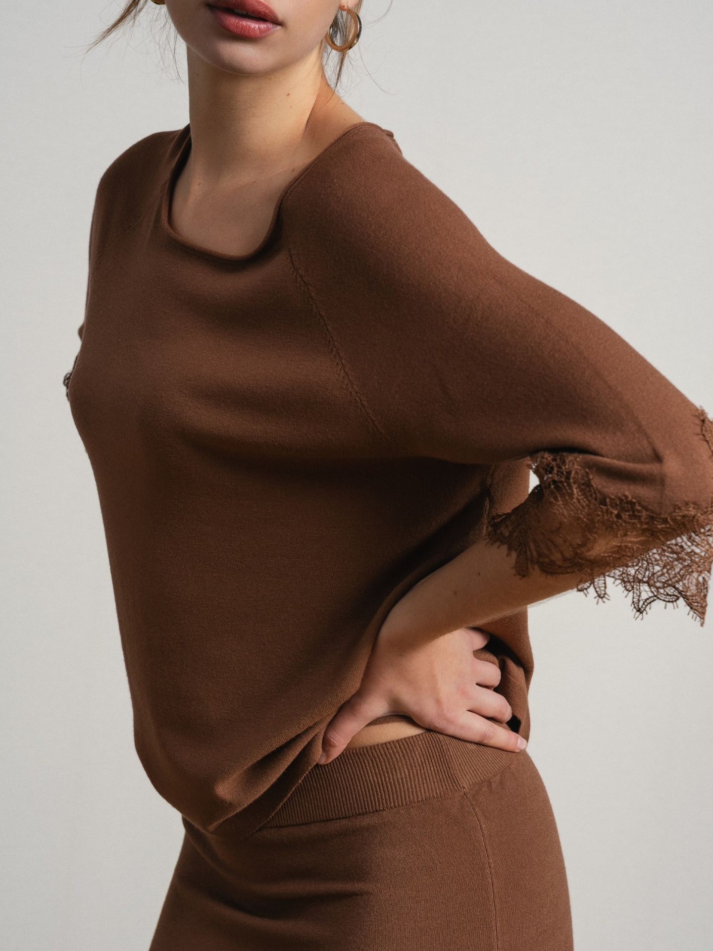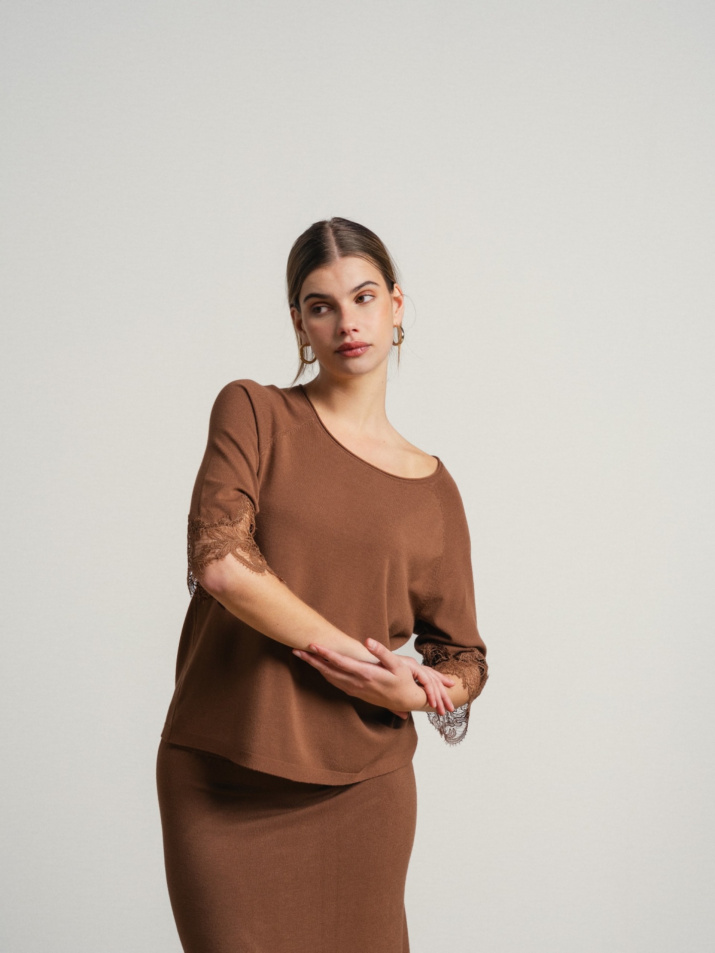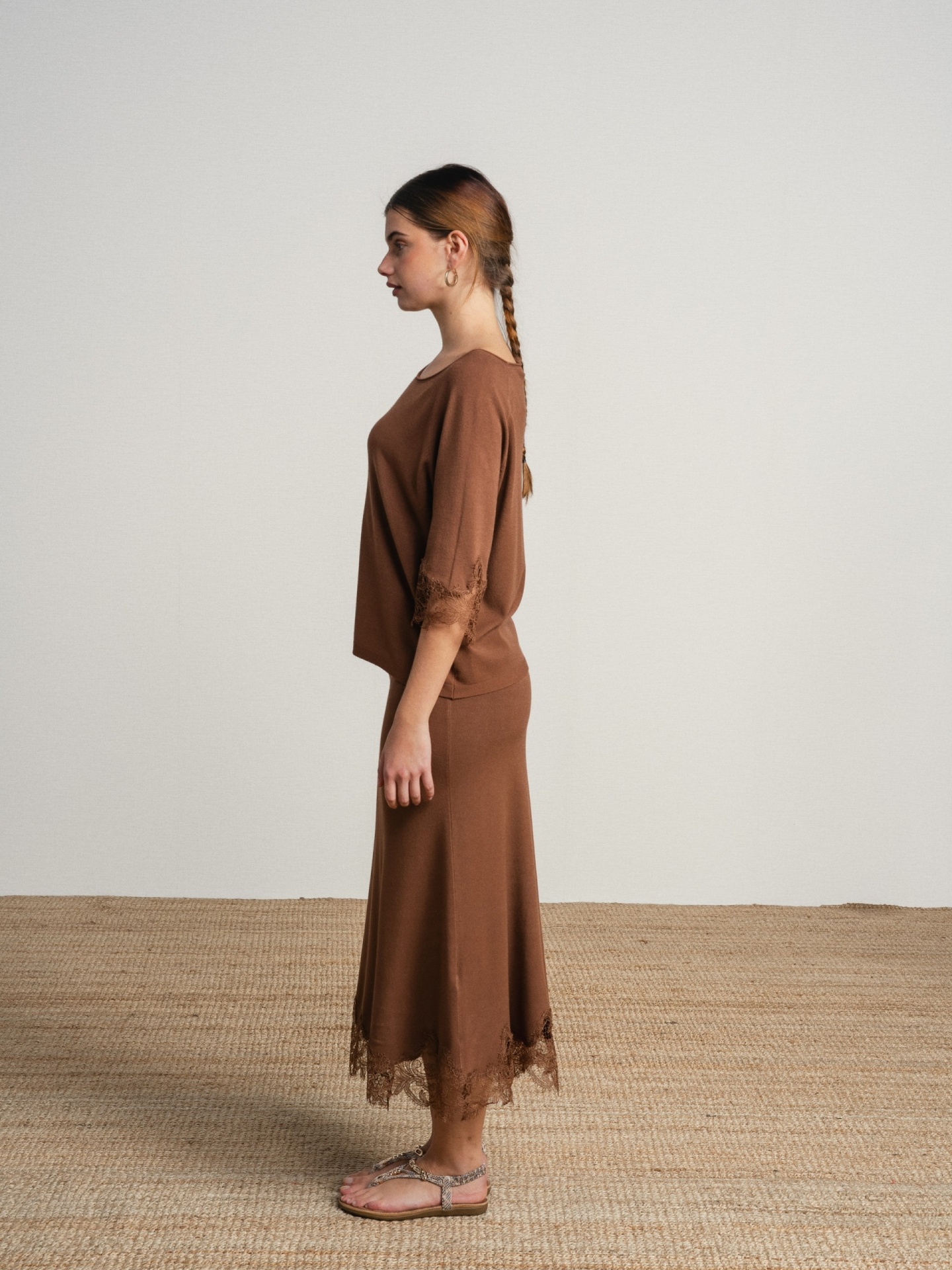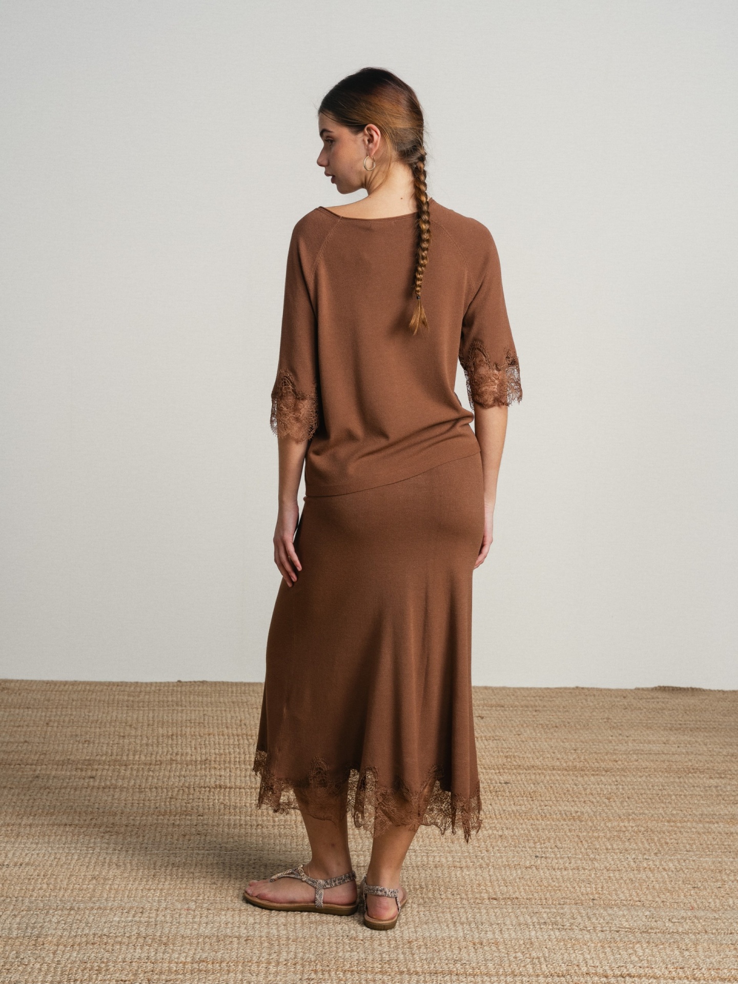 Conjunto de duas peças em tecido leve com acabamento suave. Top de corte solto com decote assimétrico e manga curta com aplicação de renda. Saia midi de corte ajustado com detalhe rendado na base.