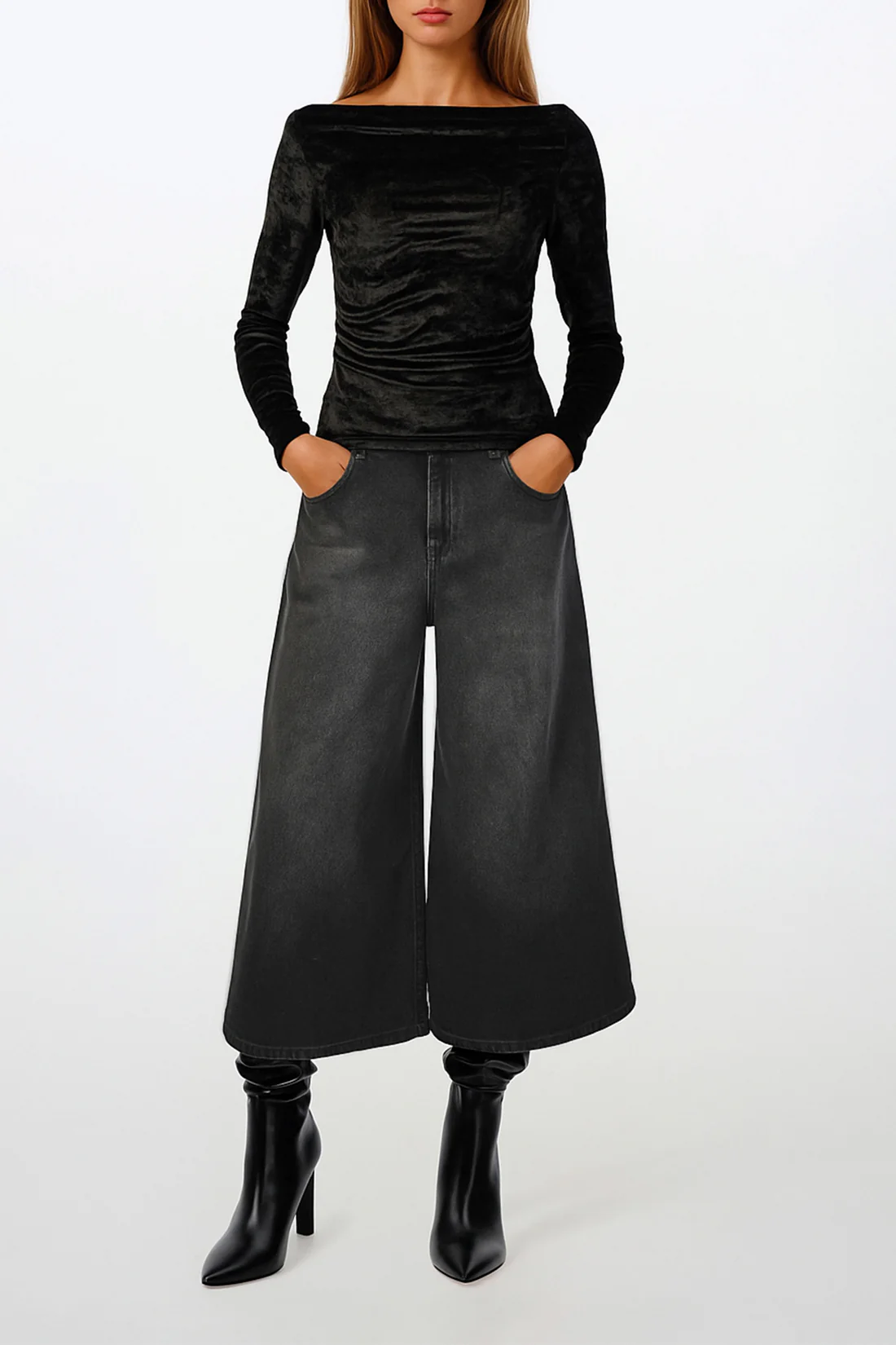 Jeans de cintura subida e cinco bolsos. Perna larga e curta. Fecho frontal com fecho de correr e botão. O denim uniforme reforça o caráter limpo e versátil da peça.