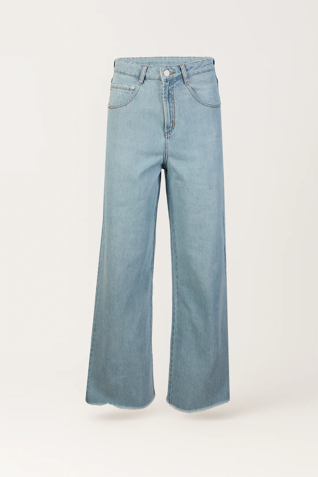 Jeans de Cintura Subida com Presilhas. Cinco bolsos. Detalhe de pespontos marcados a combinar. Fecho frontal com fecho de correr e botão. O denim com lavagem uniforme reforça o caráter limpo e versátil da peça.