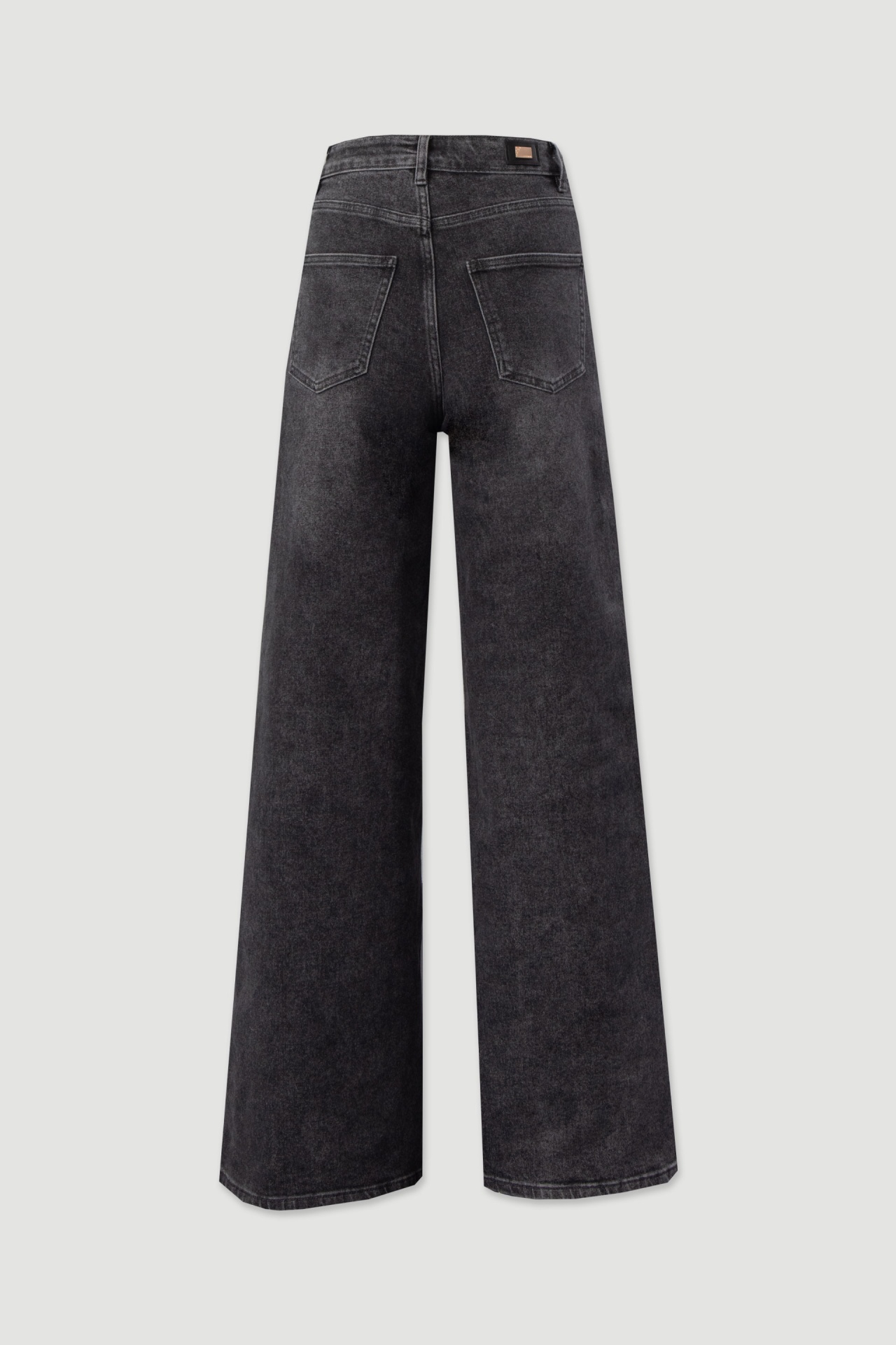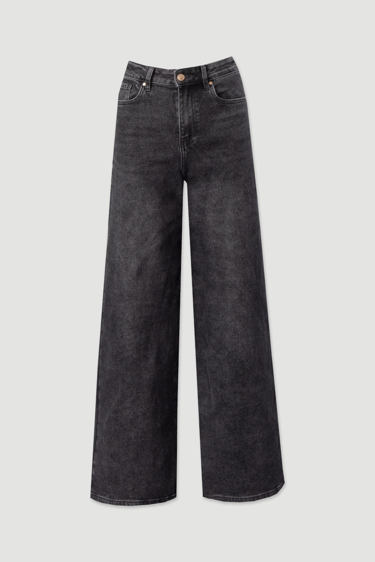 Jeans de corte wide leg com design moderno e confortável. O modelo apresenta cintura média, cinco bolsos e lavagem escura, garantindo um visual contemporâneo e versátil para vários estilos. A perna ampla cria uma silhueta alongada e elegante, ideal para coordenados urbanos ou combinações mais descontraídas. Uma peça essencial no guarda-roupa, perfeita para looks atuais com atitude.