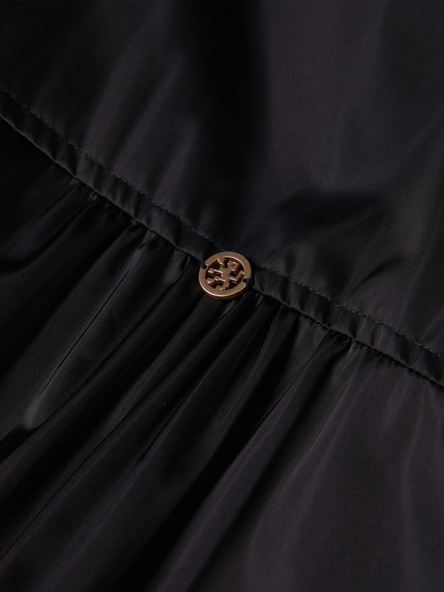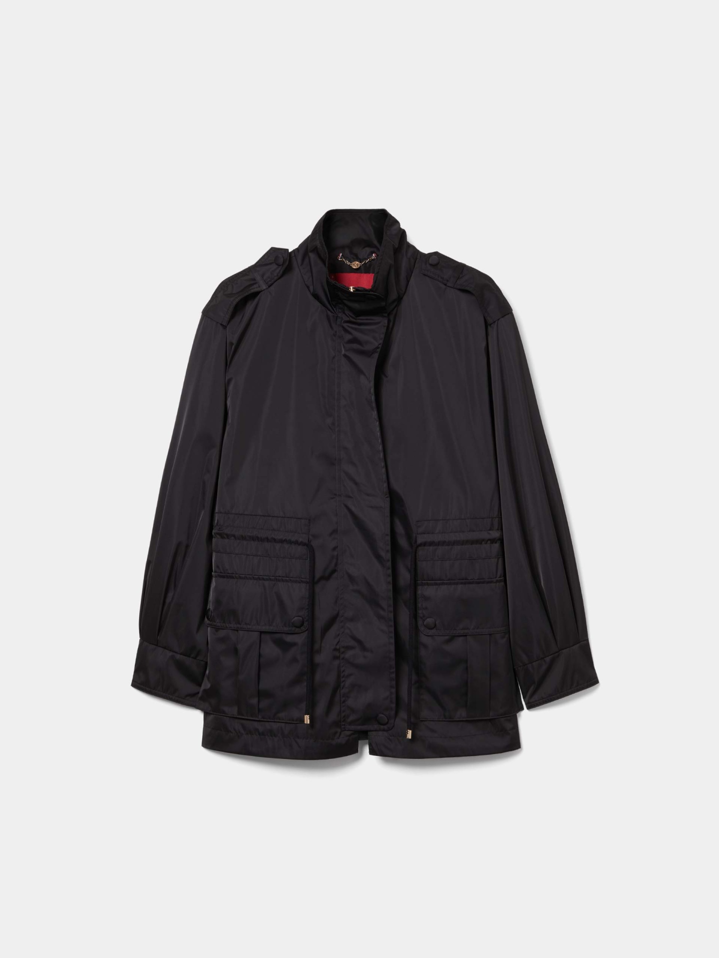 Parka de gola alta com cordão de ajuste na cintura, pensada para um visual funcional e sofisticado. O modelo destaca-se pelo seu acabamento acetinado e pelos detalhes utilitários, como os bolsos frontais de aba com botões personalizados e as presilhas nos ombros. É a peça ideal para oferecer proteção com elegância em dias de transição.