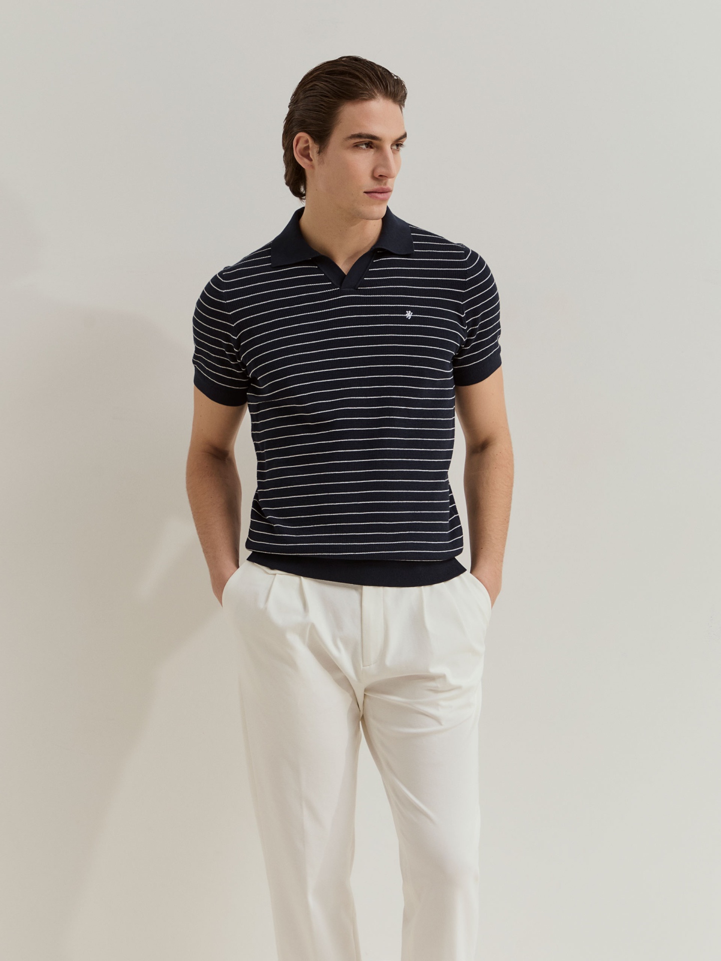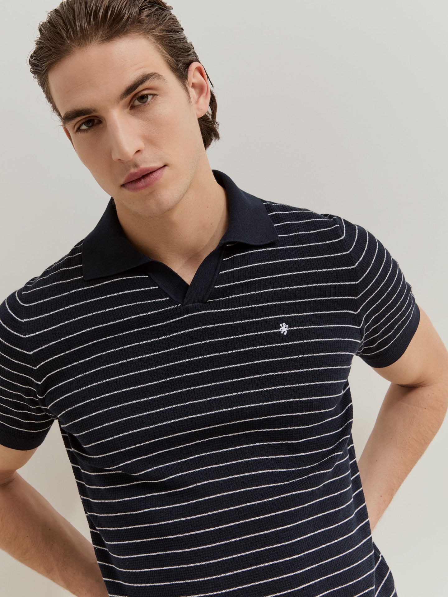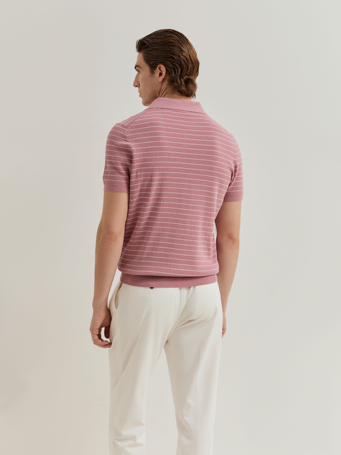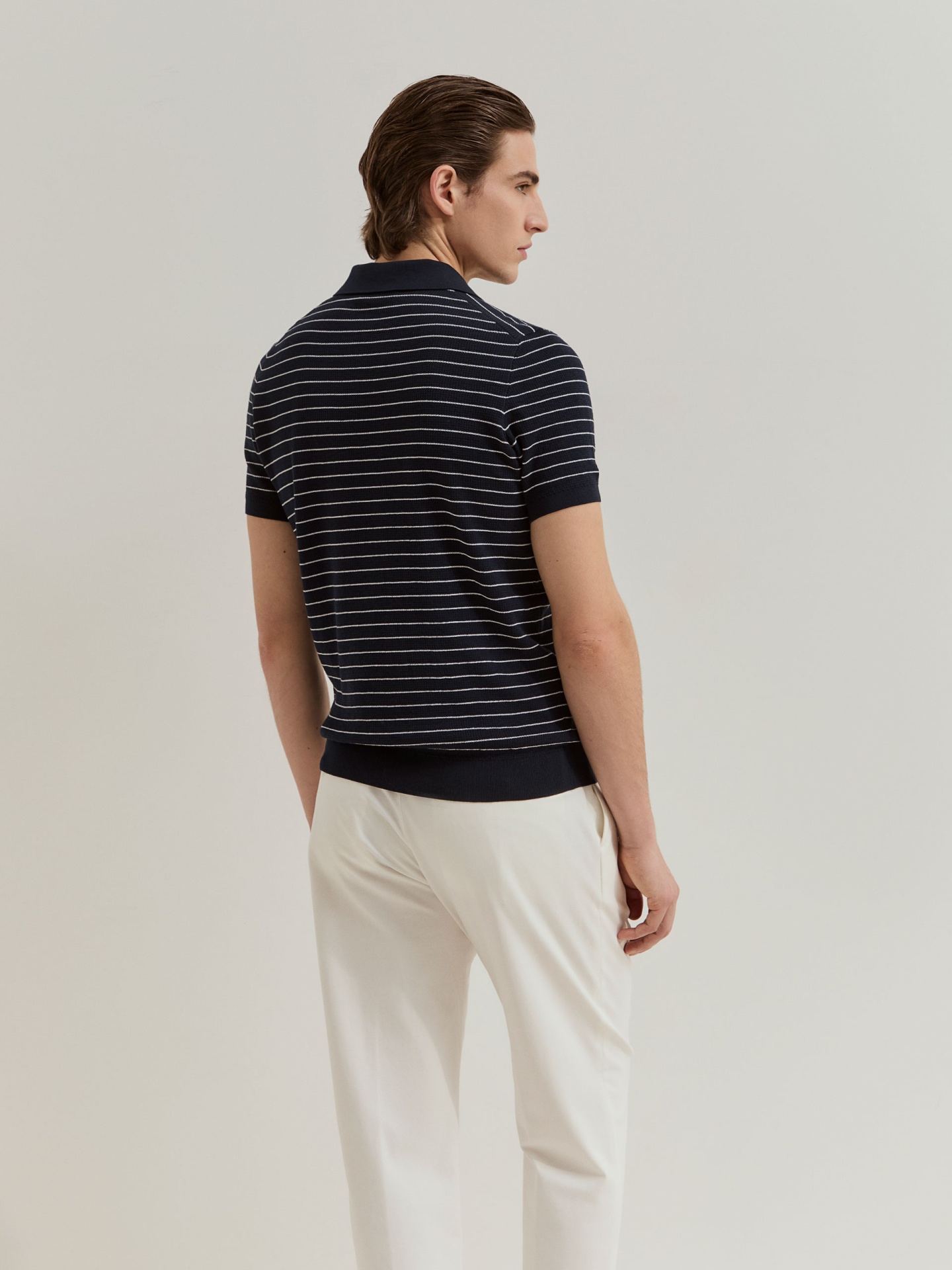 Polo de manga curta confeccionado em malha tricotada 100% algodão, garantindo conforto e respirabilidade. Apresenta padrão de riscas em contraste que acrescenta dinamismo e um toque contemporâneo ao visual. Uma peça versátil, ideal para compor looks descontraídos com um apontamento sofisticado.