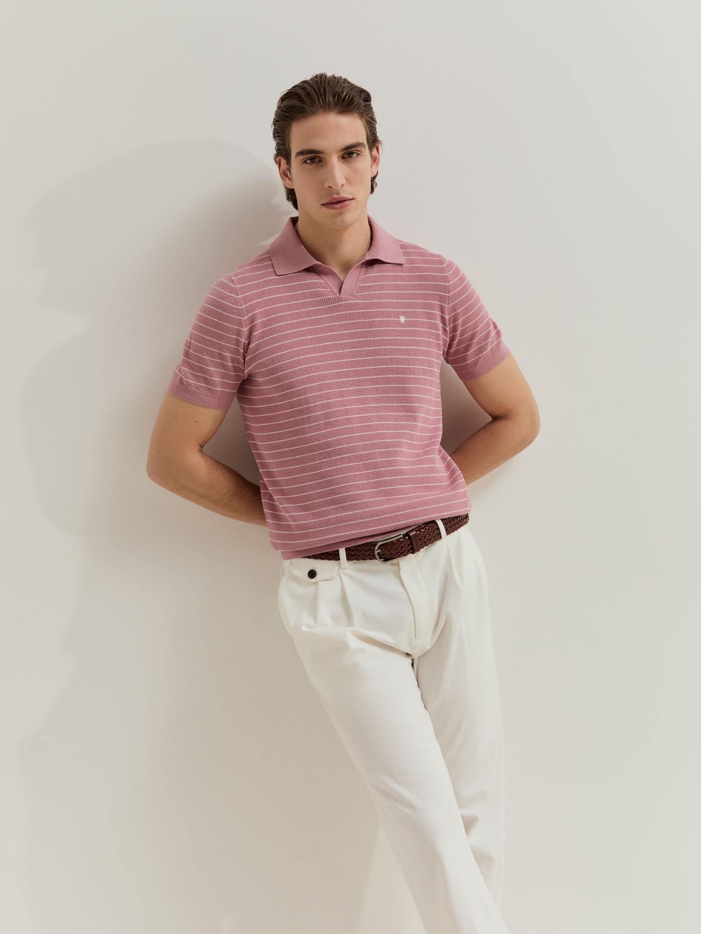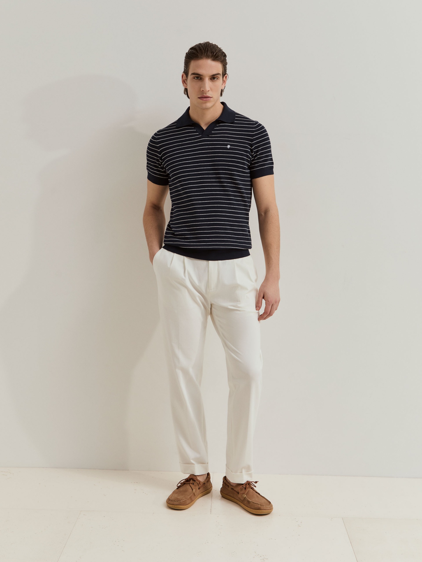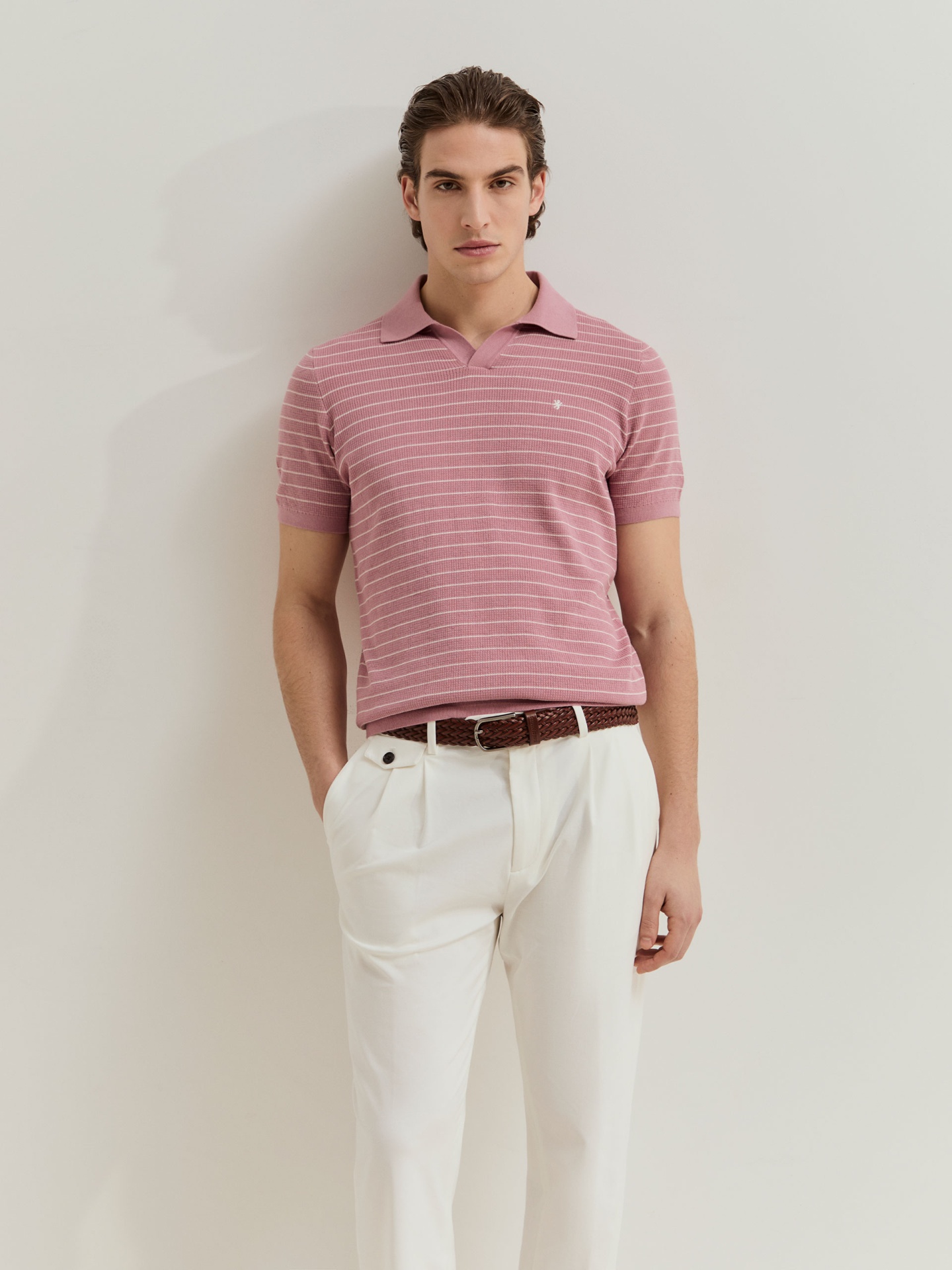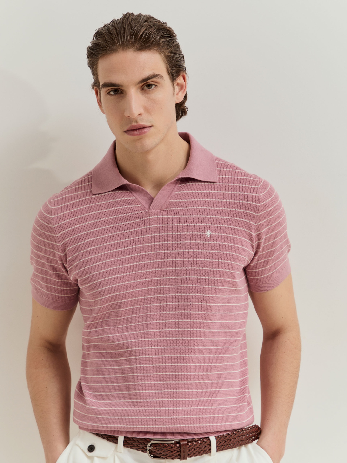 Polo de manga curta confeccionado em malha tricotada 100% algodão, garantindo conforto e respirabilidade. Apresenta padrão de riscas em contraste que acrescenta dinamismo e um toque contemporâneo ao visual. Uma peça versátil, ideal para compor looks descontraídos com um apontamento sofisticado.