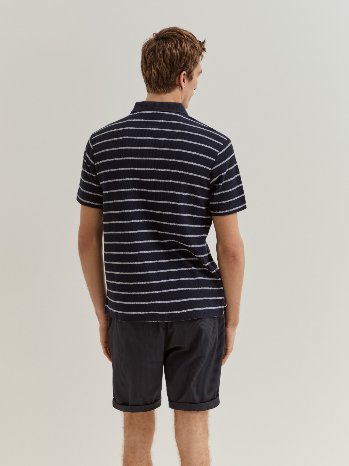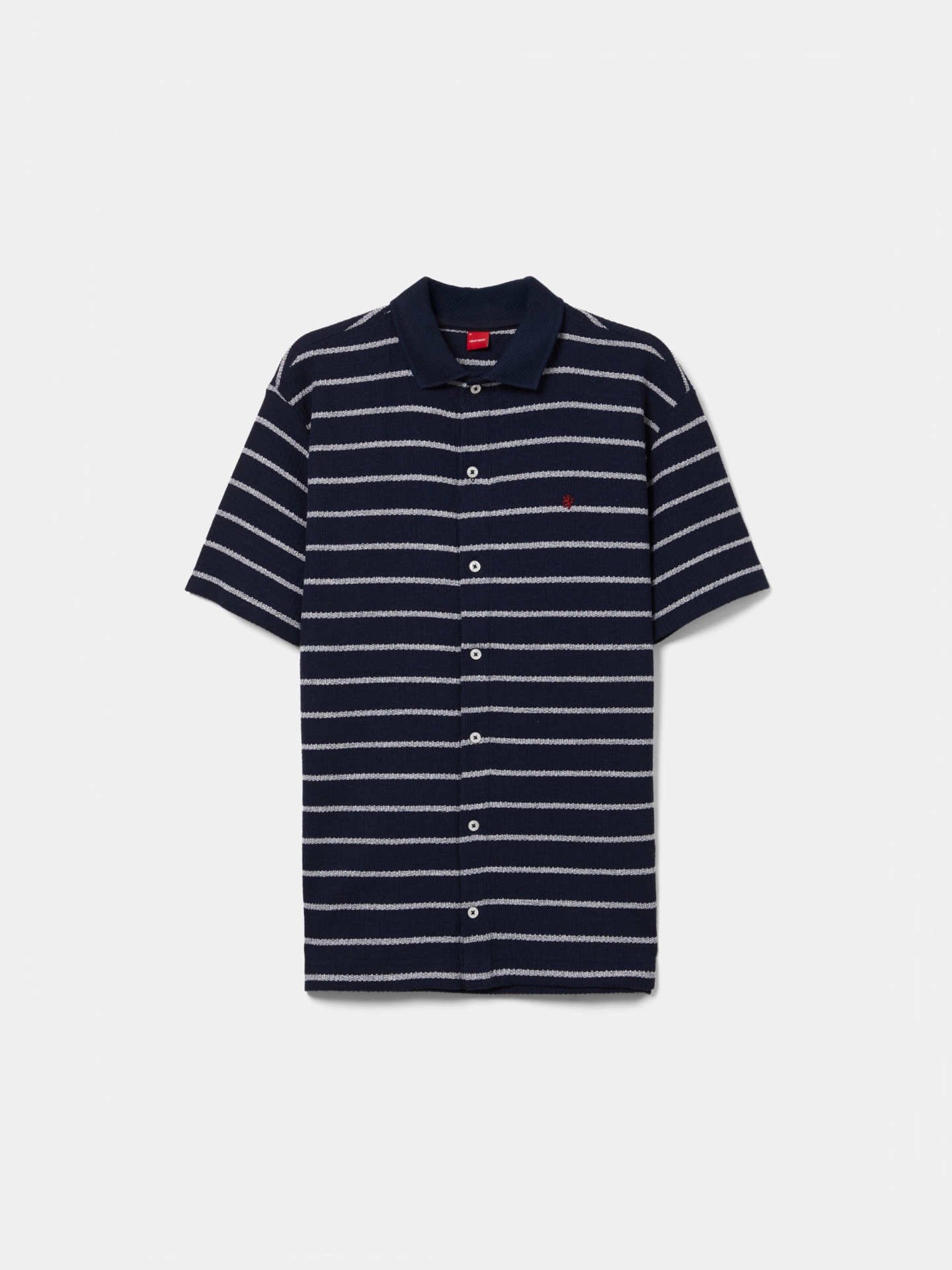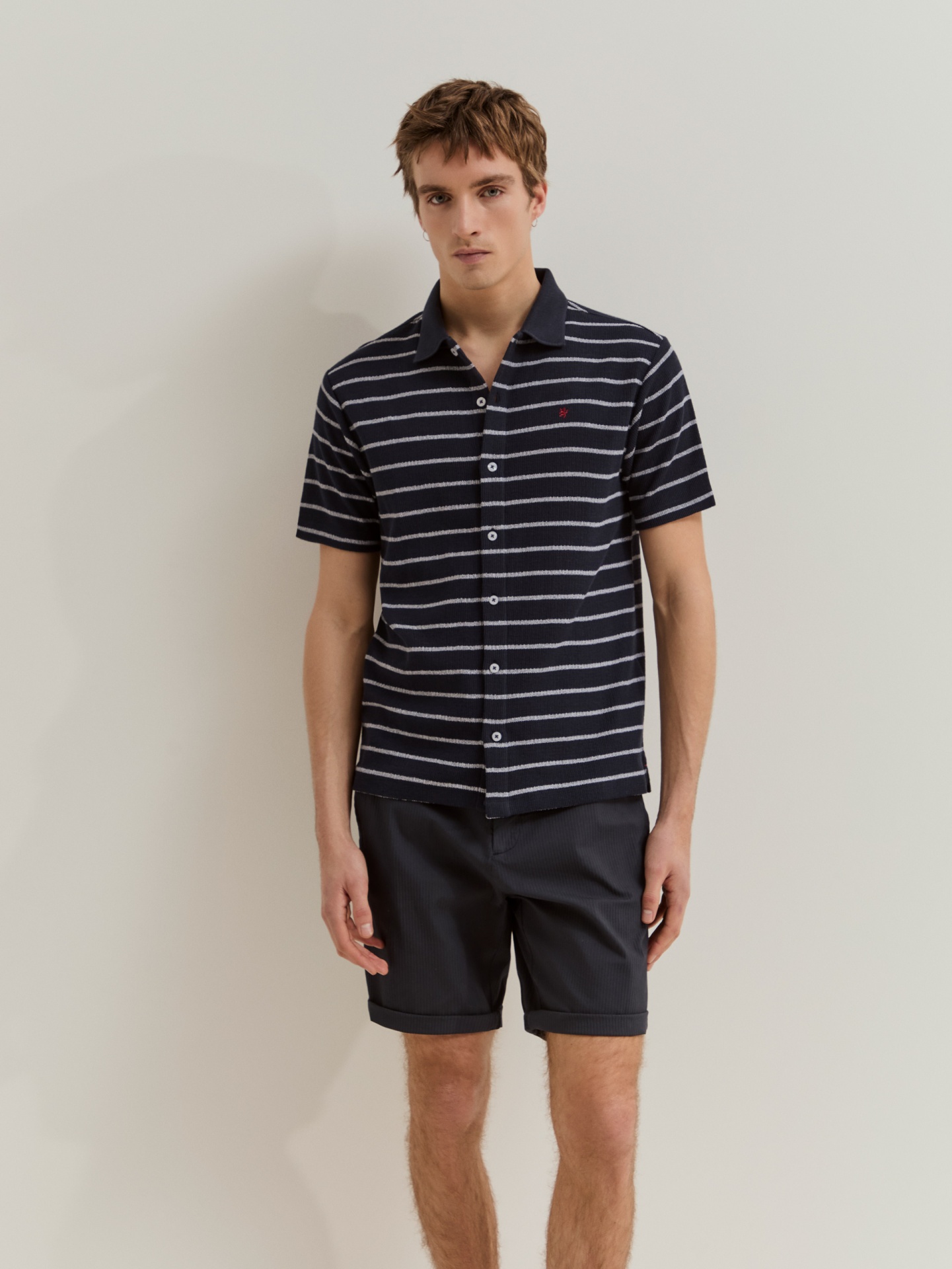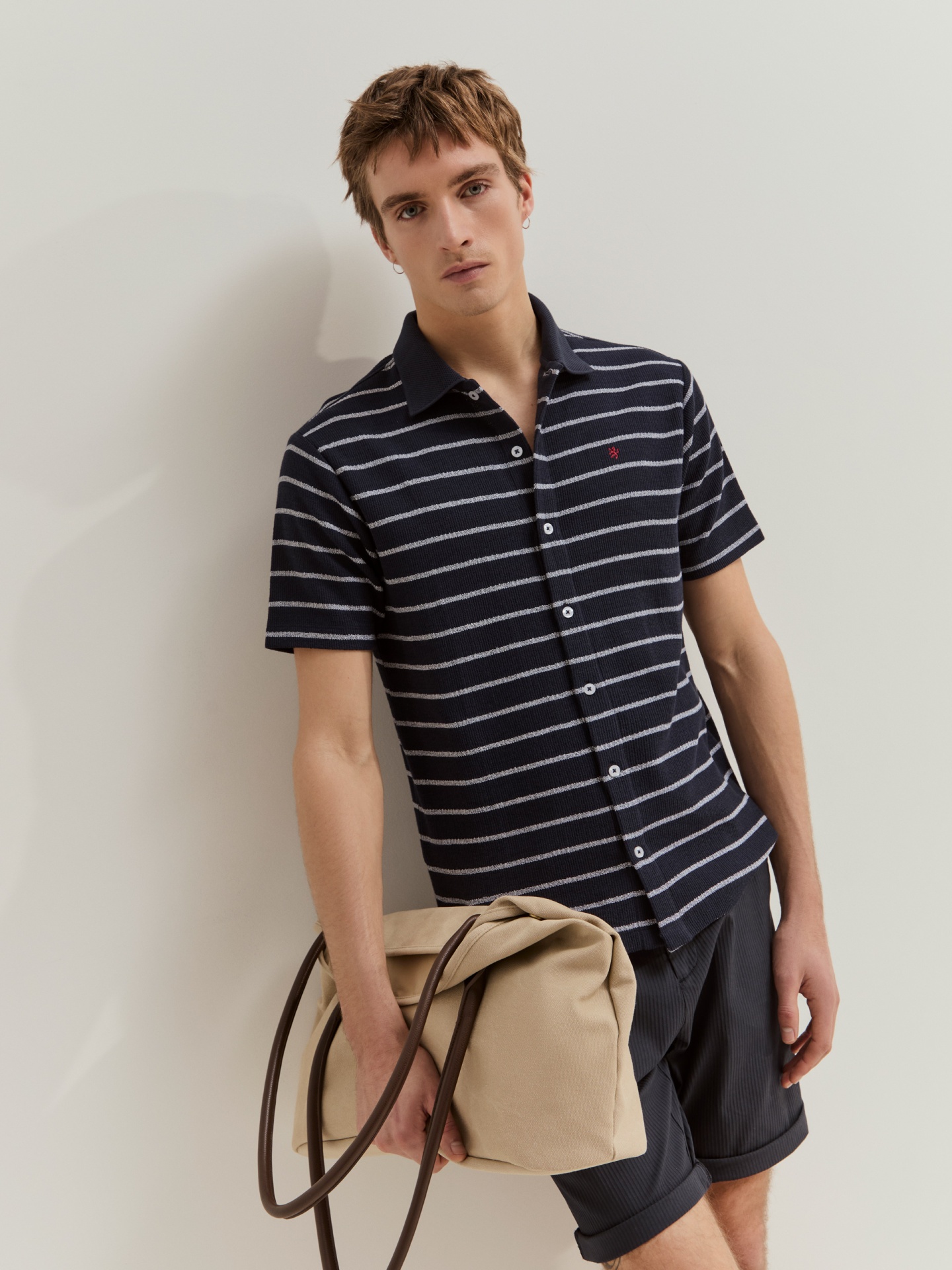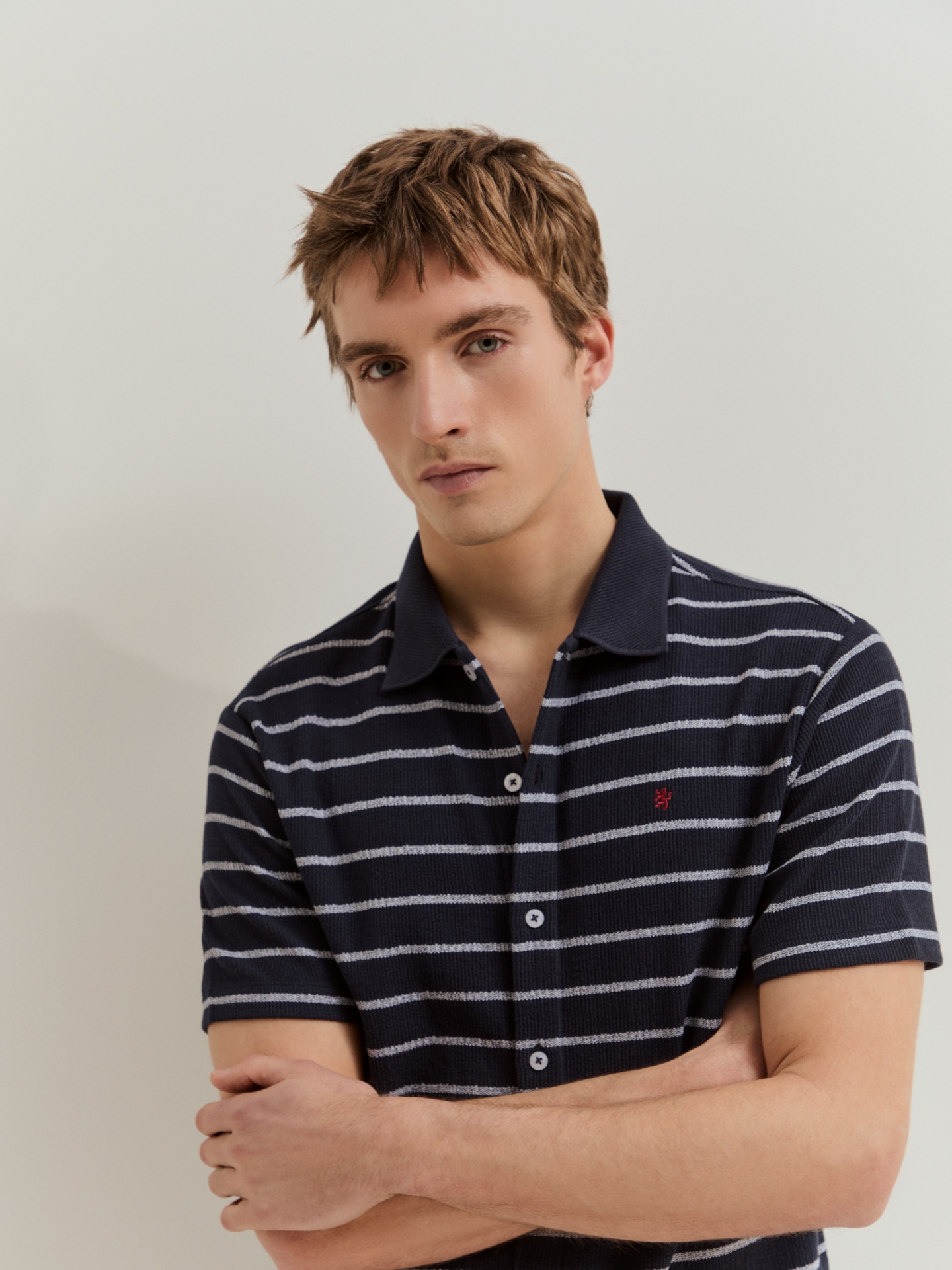Polo de manga curta confecionado em 100% algodão, destacando-se pela sua textura em malha piqué e pelo padrão de riscas horizontais em contraste. O design diferencia-se pela abertura frontal total com botões, permitindo uma utilização versátil e moderna, e pela gola de estilo clássico em malha lisa. Com o emblema da marca bordado no peito, é uma peça sofisticada que une o conforto de um polo à elegância de uma camisa casual.